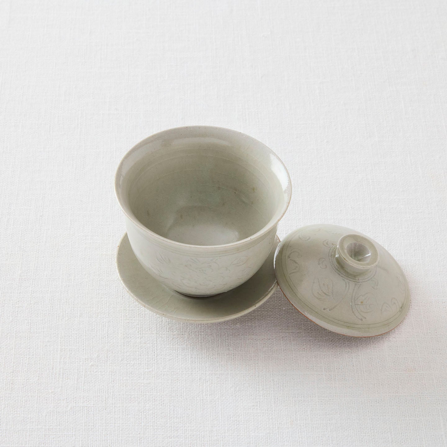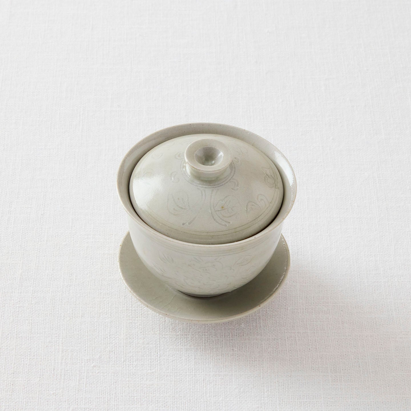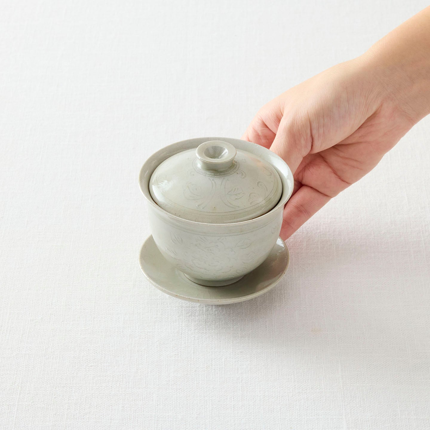 「牡丹唐草蓋碗」は、蓋と受け皿付きのベーシックな茶器。同じ牡丹唐草模様のアイテムを合わせても、ガラスや他の陶器と合わせても似合う、自由度の高さが魅力です。