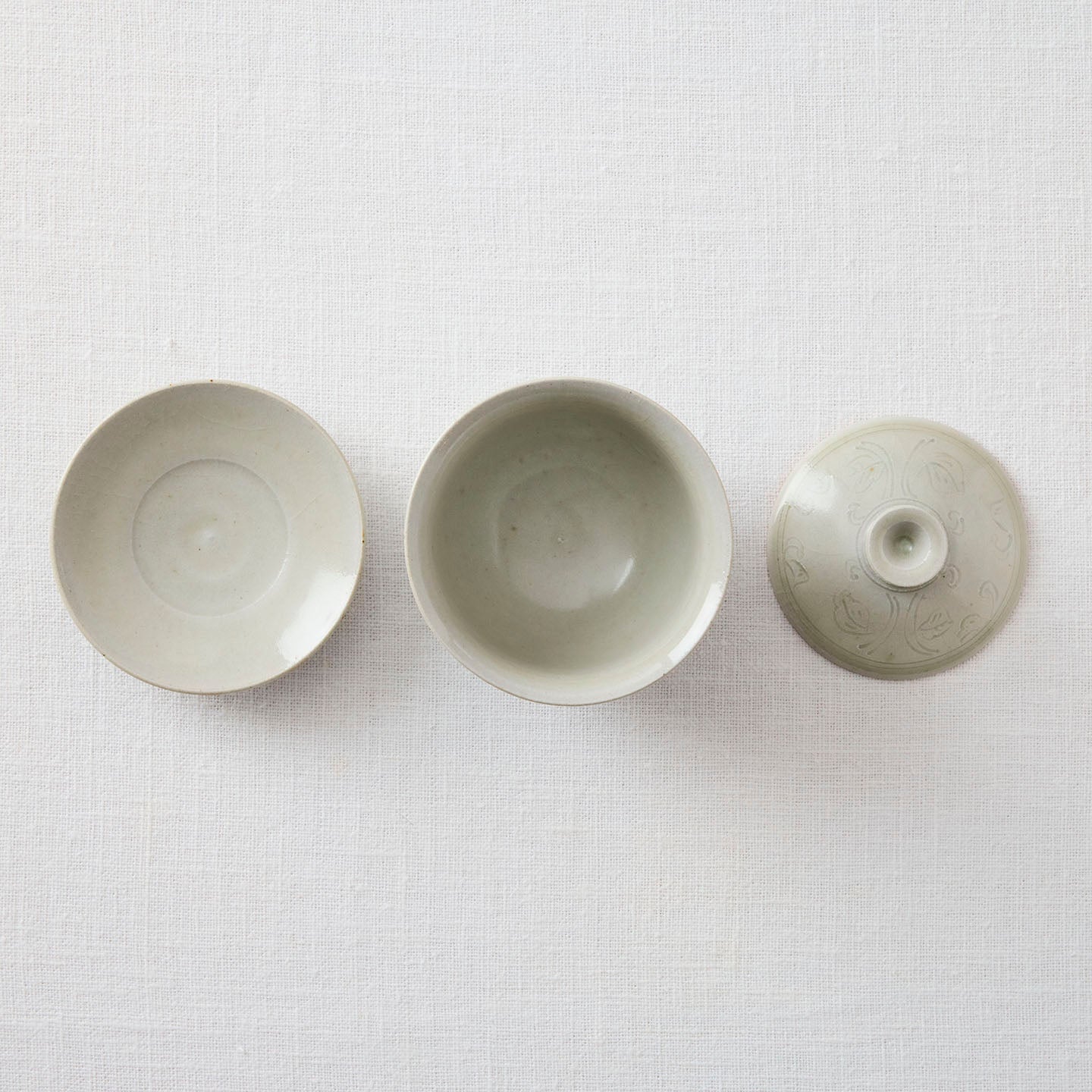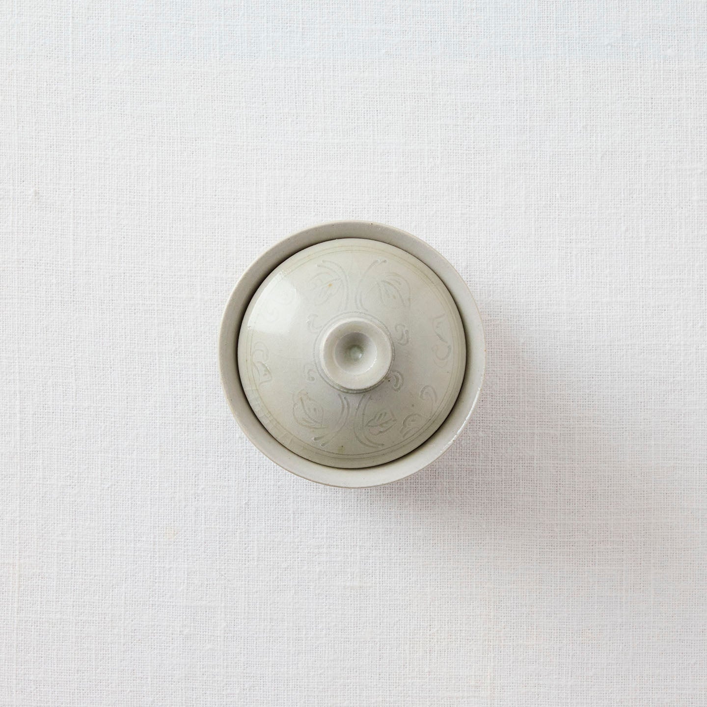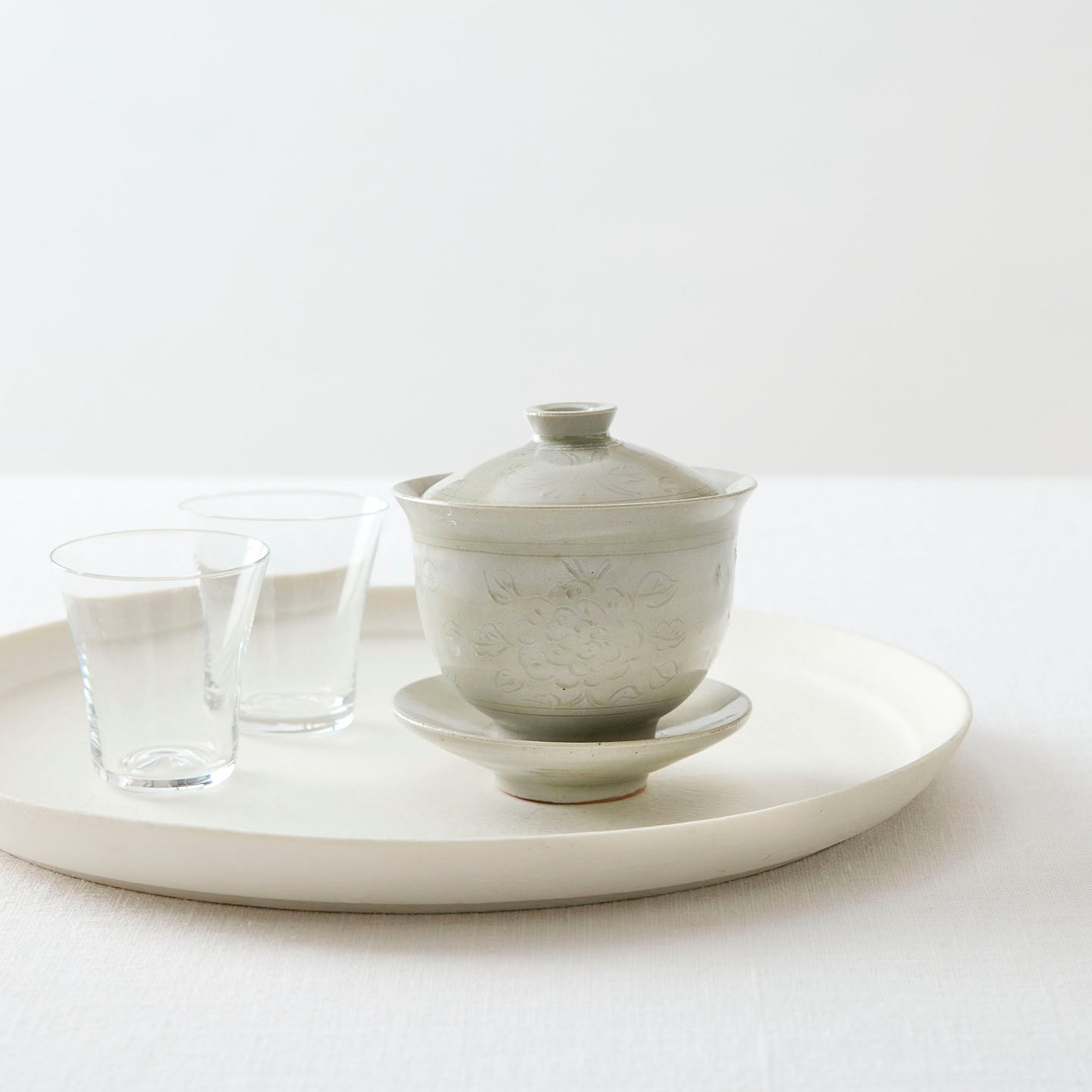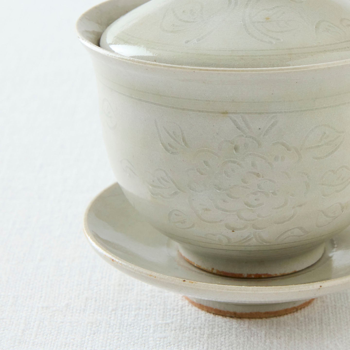 「牡丹唐草蓋碗」は、蓋と受け皿付きのベーシックな茶器。同じ牡丹唐草模様のアイテムを合わせても、ガラスや他の陶器と合わせても似合う、自由度の高さが魅力です。