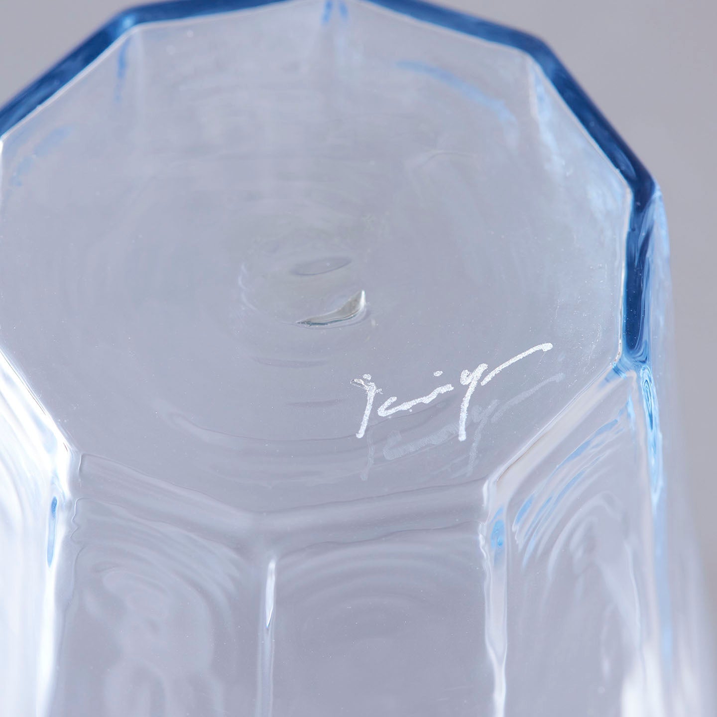 小宮さんの作るこの「十角グラス」は、置かれた立ち姿も美しい。湖の水面のような揺らぎは、眺めていると心が落ち着いていくよう。少し厚めに作られた底にも注目です。