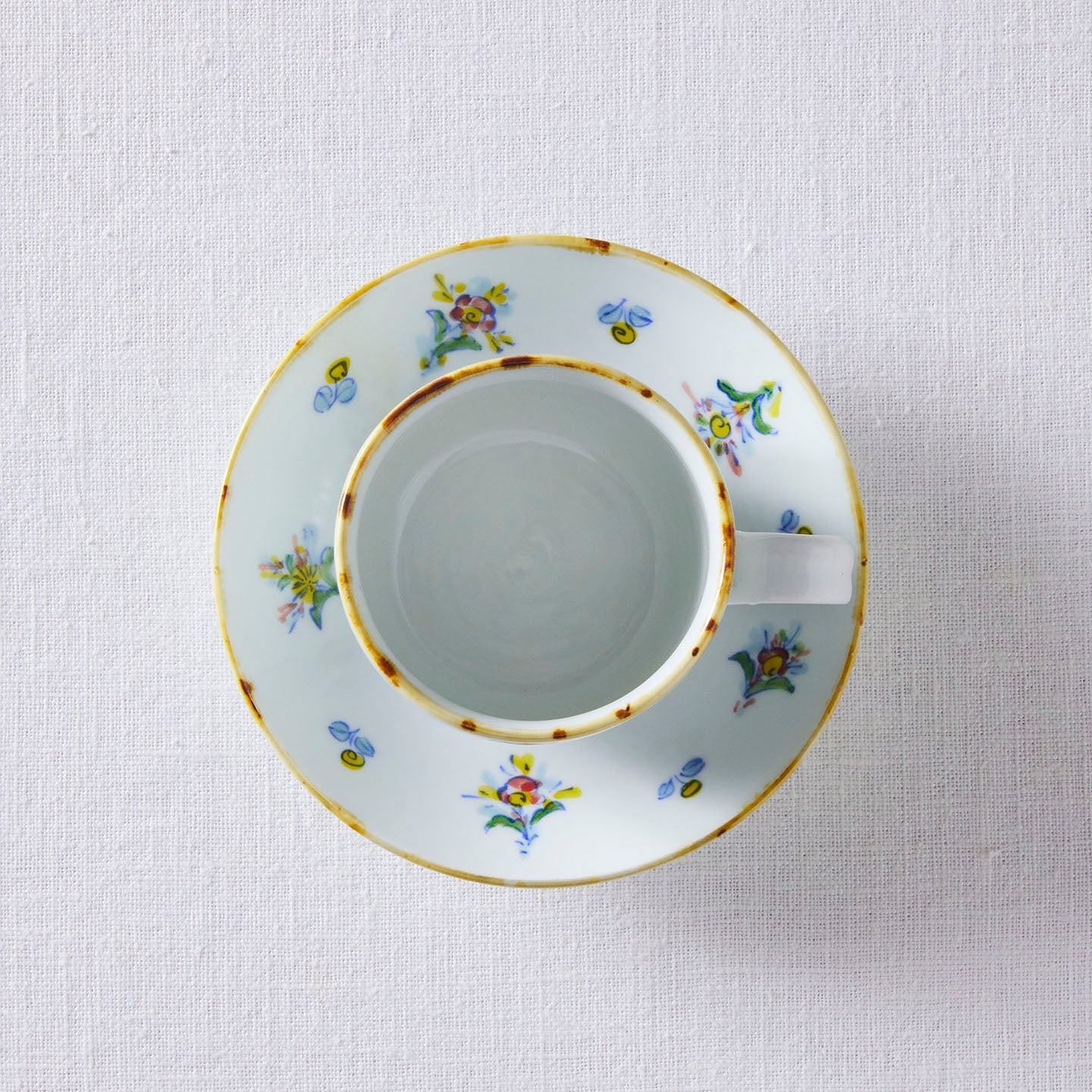 絵付のカップソーサーは、煎茶堂東京の神さんから見せてもらったフィンランドのヴィンテージのカップの写真を元に制作しました。余白を際立たせながら散りばめられた花紋様がバランスの取れた贅沢な逸品です。