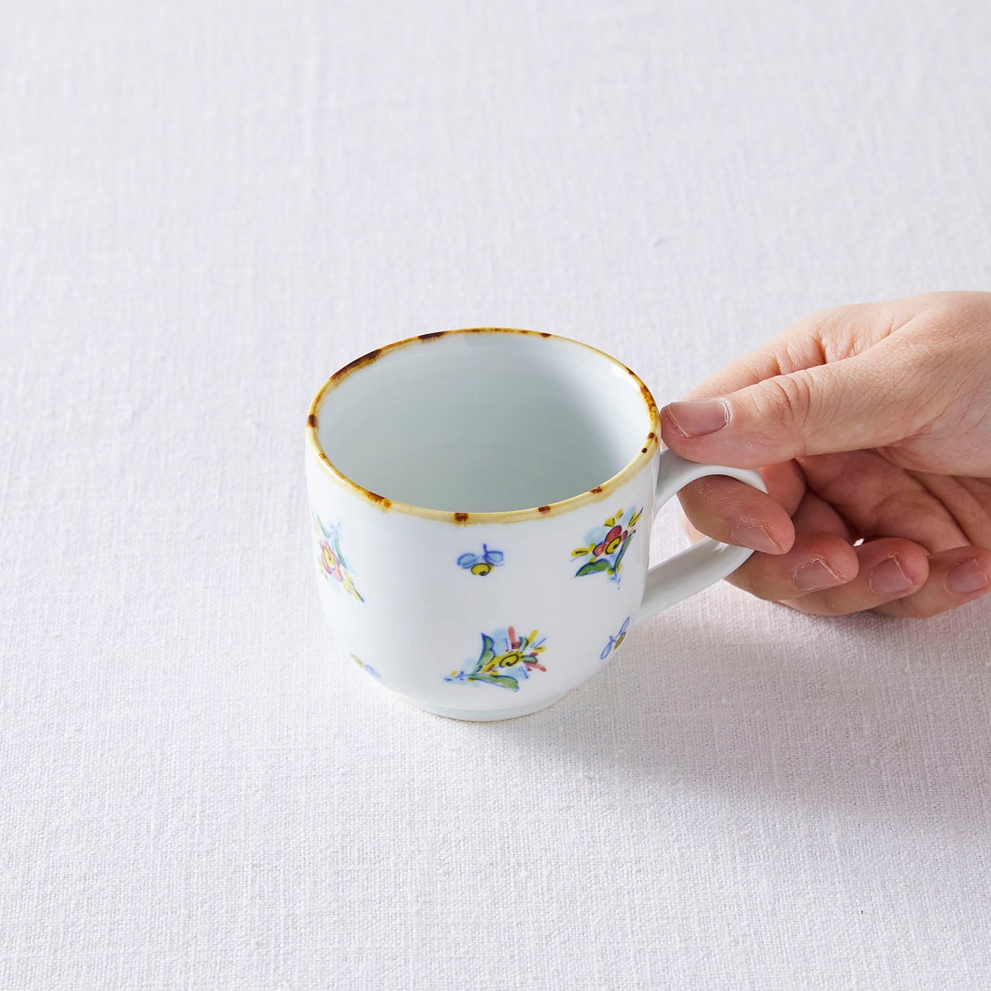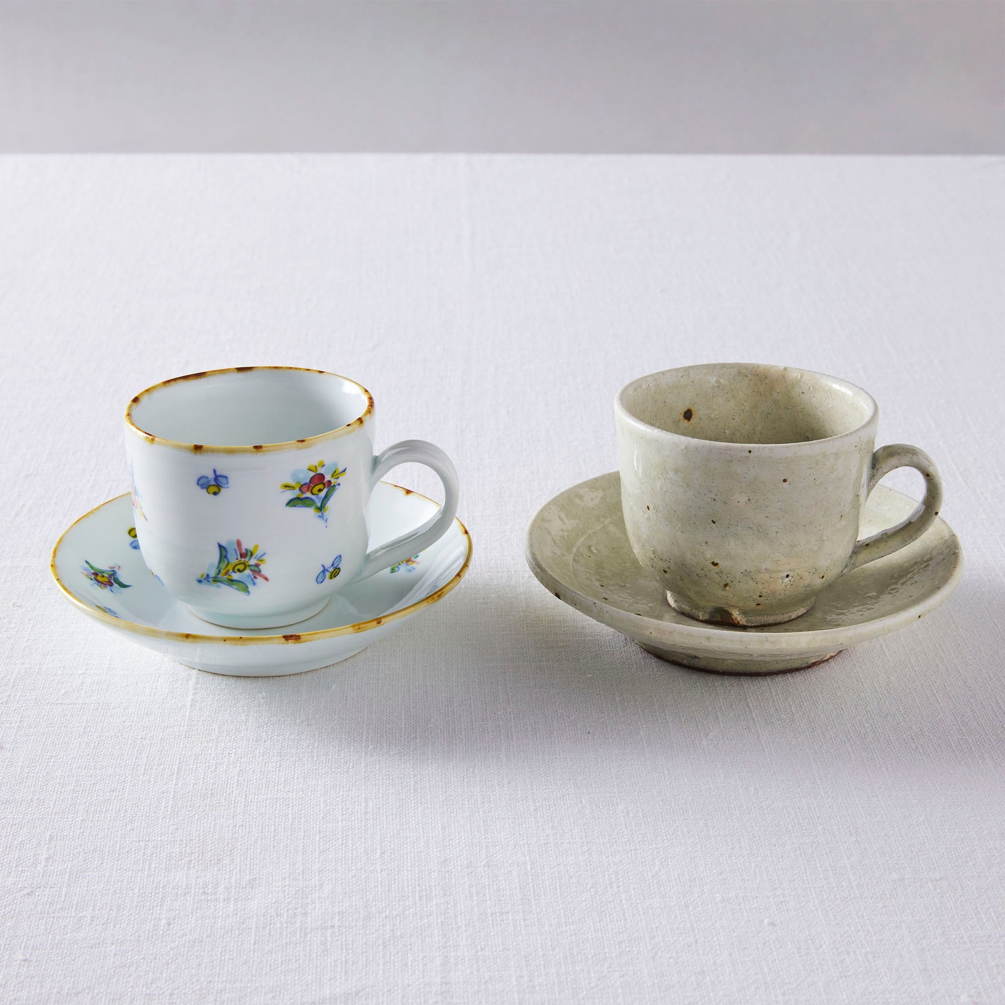今回取り扱う「粉引カップ」「絵付扇花紋カップ」は、用途は同じながら印象が全く違いますよね。粉引と絵付けの器、それぞれの魅力を教えてください。