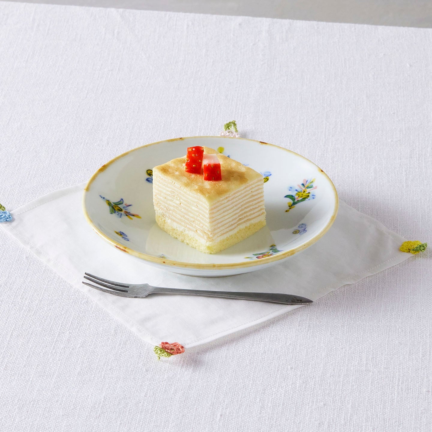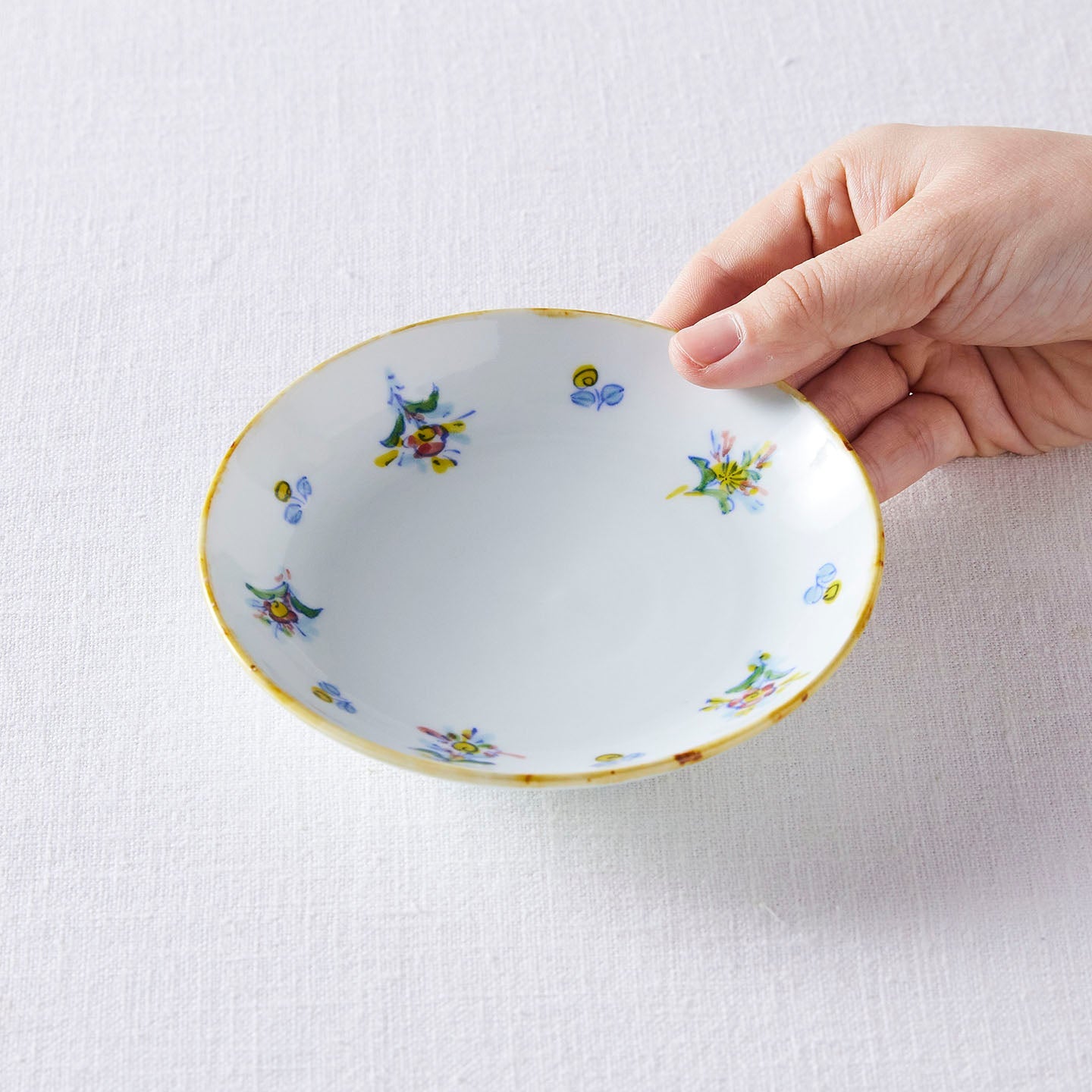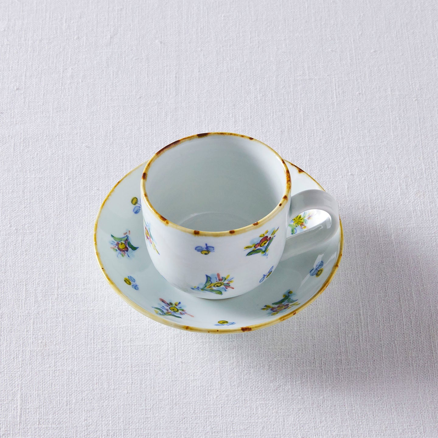 絵付のカップソーサーは、煎茶堂東京の神さんから見せてもらったフィンランドのヴィンテージのカップの写真を元に制作しました。余白を際立たせながら散りばめられた花紋様がバランスの取れた贅沢な逸品です。