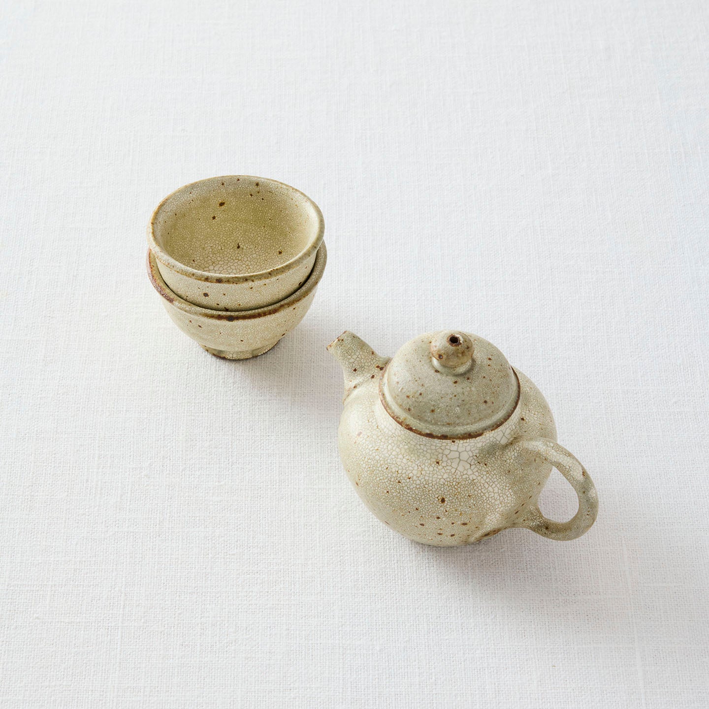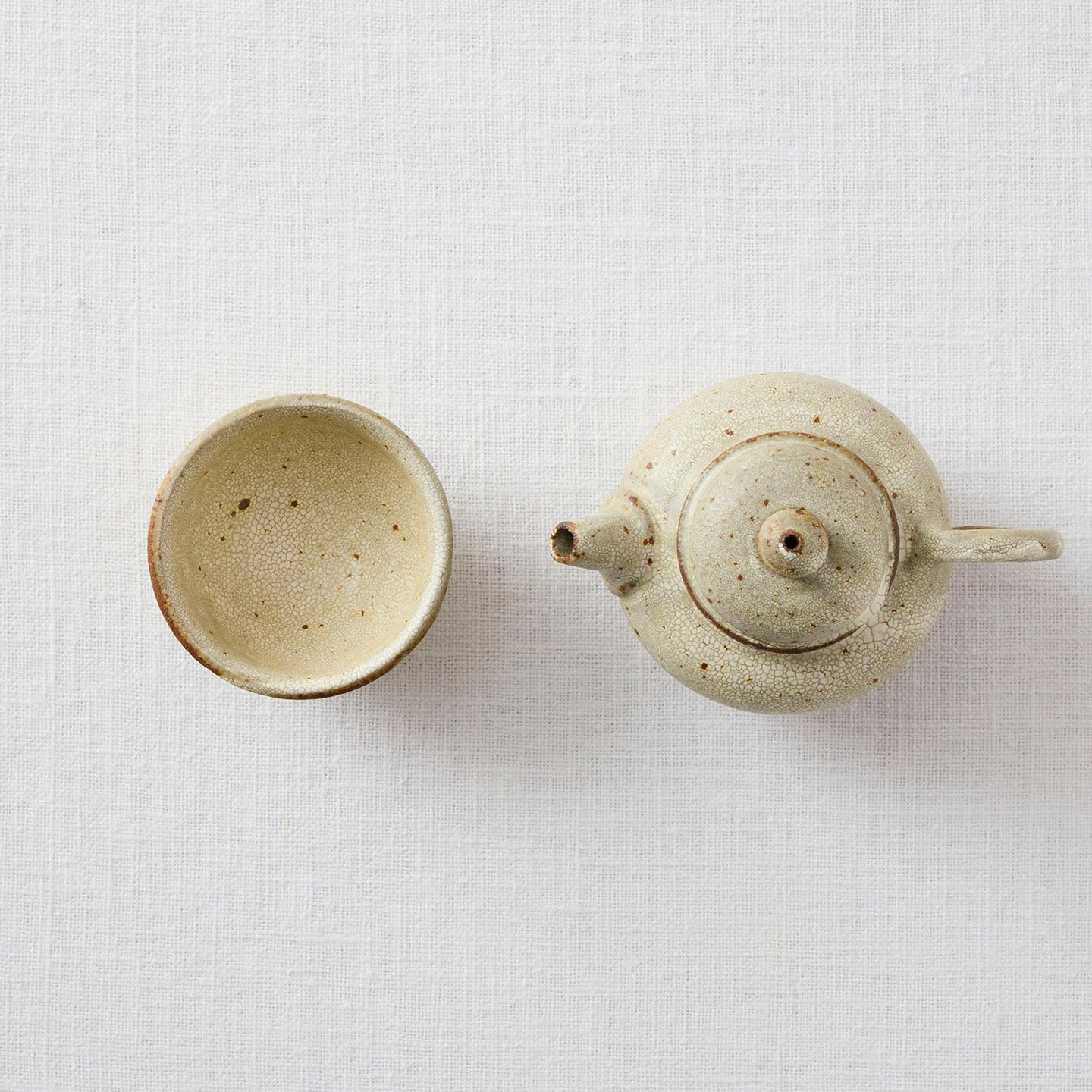 いくつかシリーズのある天野さんの器ですが、お取り扱いするのはその中でも「ヒビ粉引」のお茶道具。ヒビ粉引の「後手急須」、「茶杯」、「片口」をご紹介します。