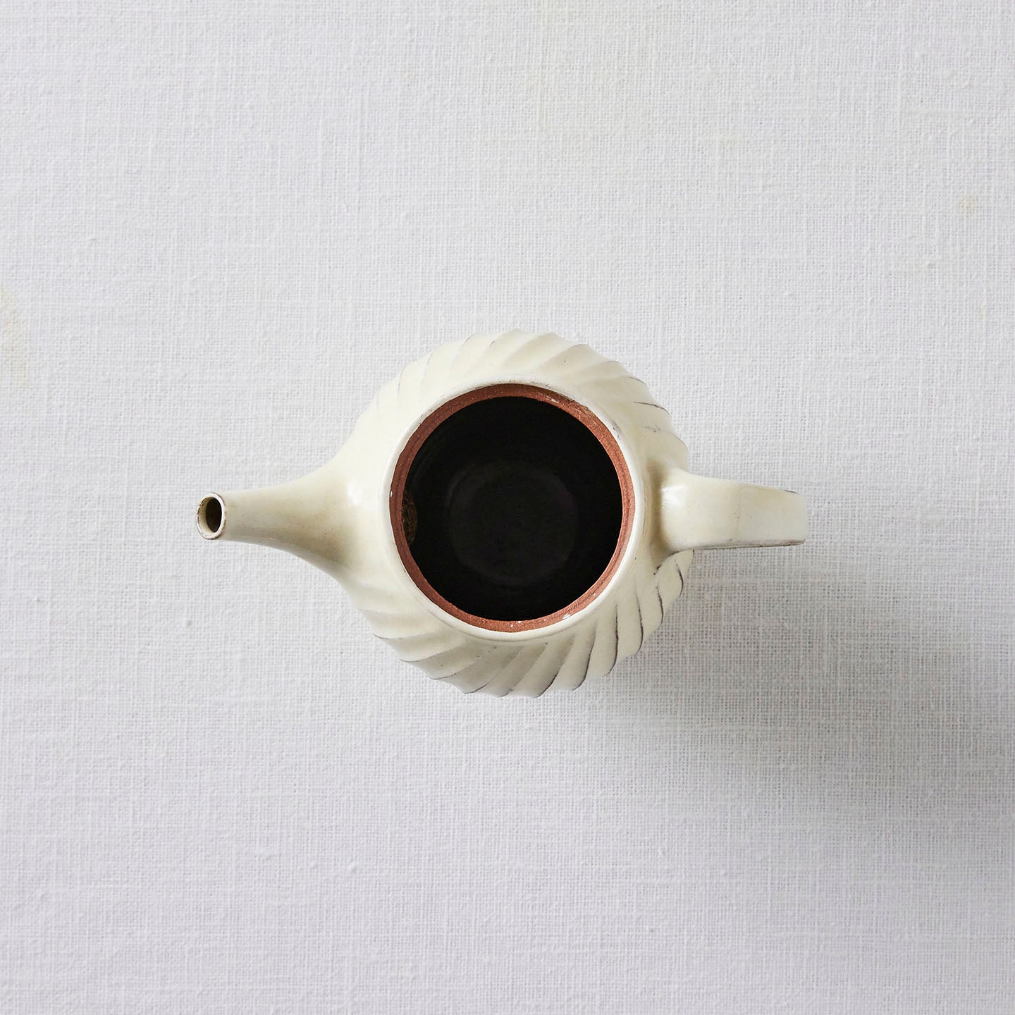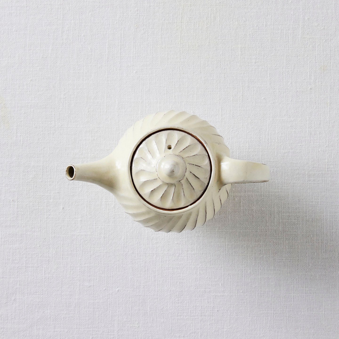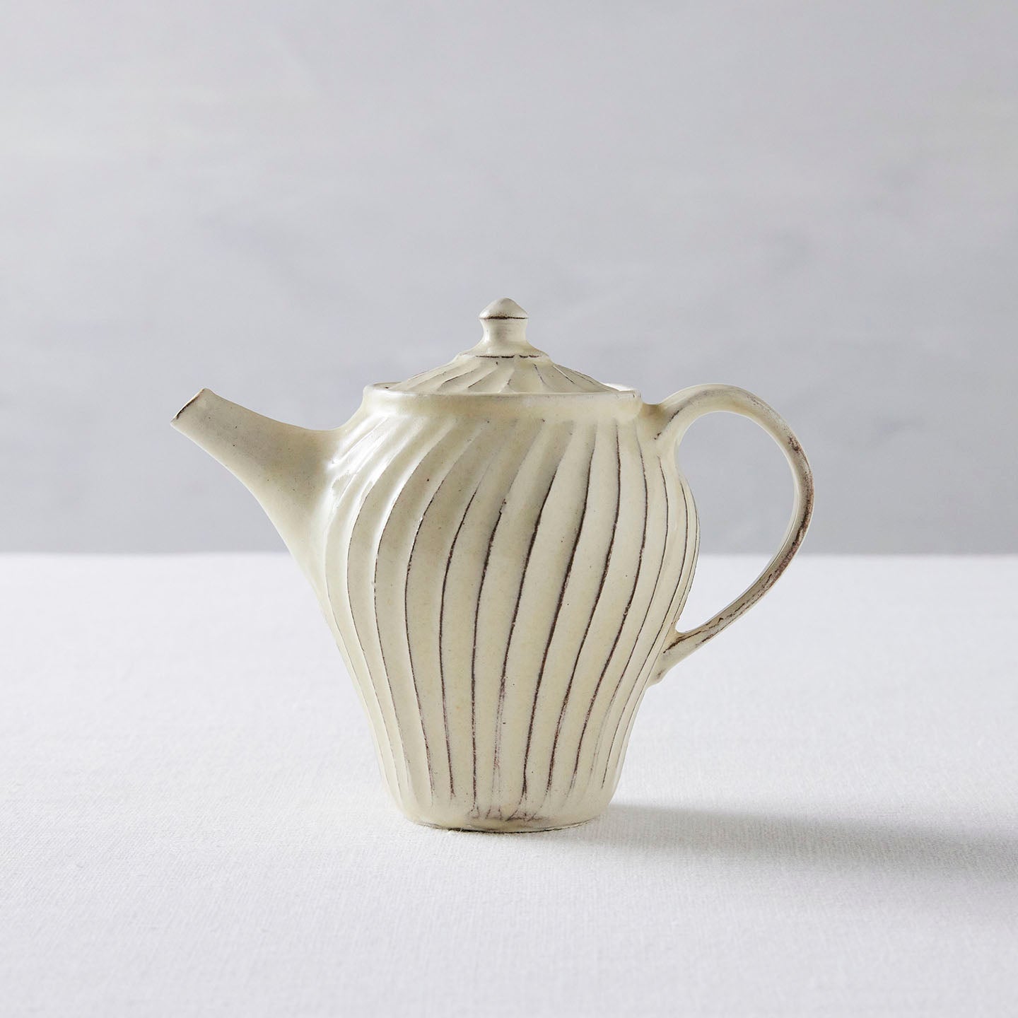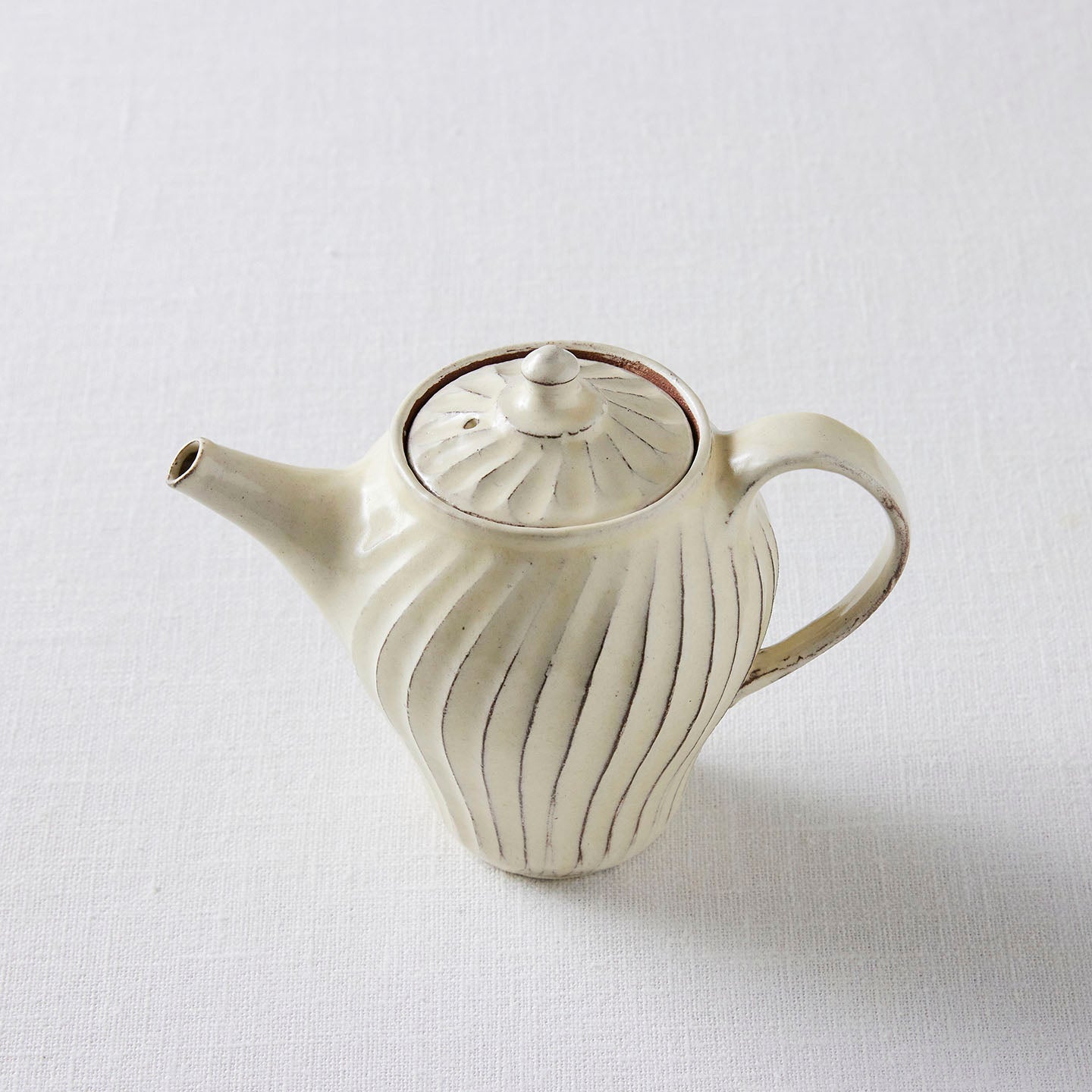 「ポット」は、側面に弧を描いたような削りの模様がほどこされたシリーズ。名前は「ポット」で洋食器のようでもありますが、日本茶や煎茶などをいれる「急須」としてもぴったり。