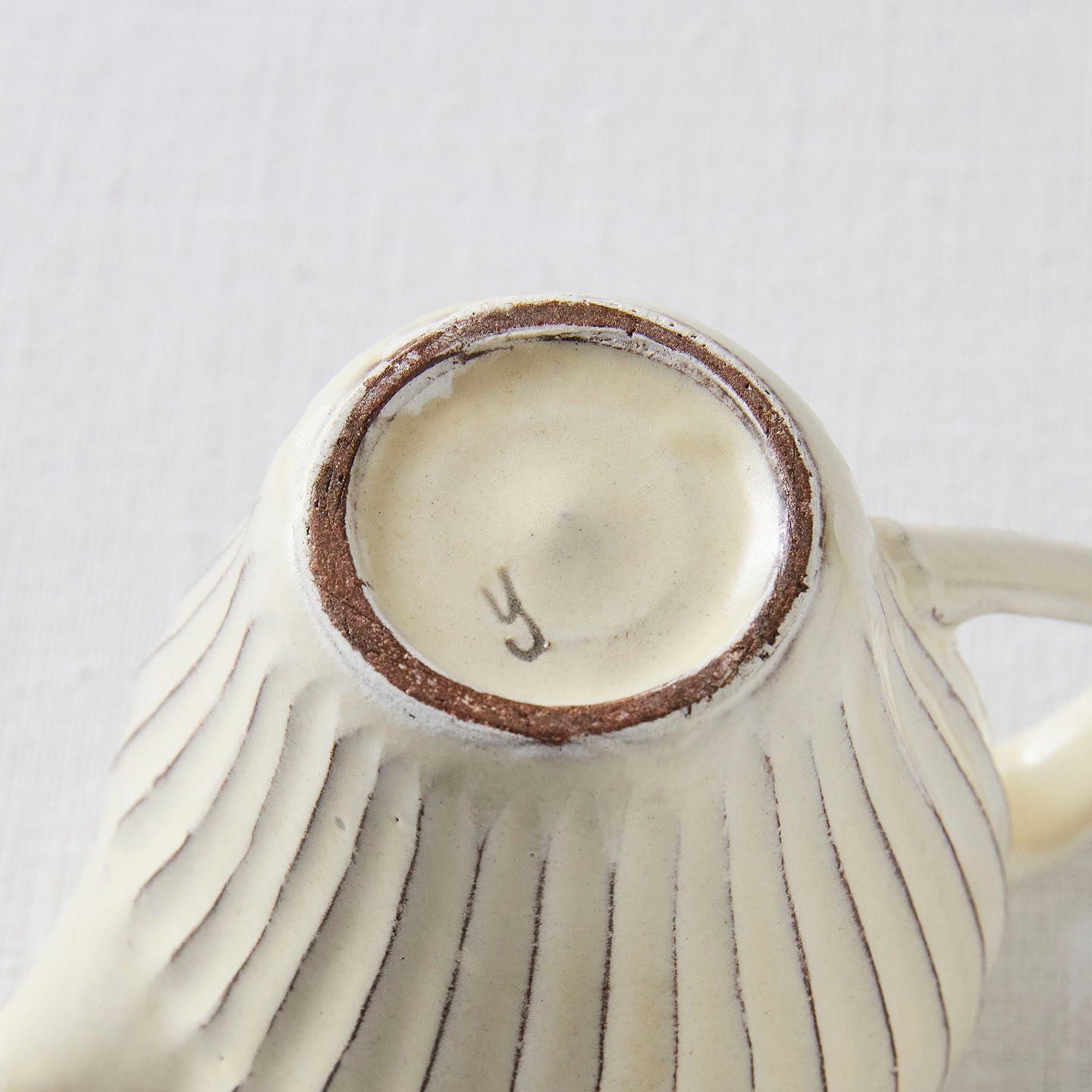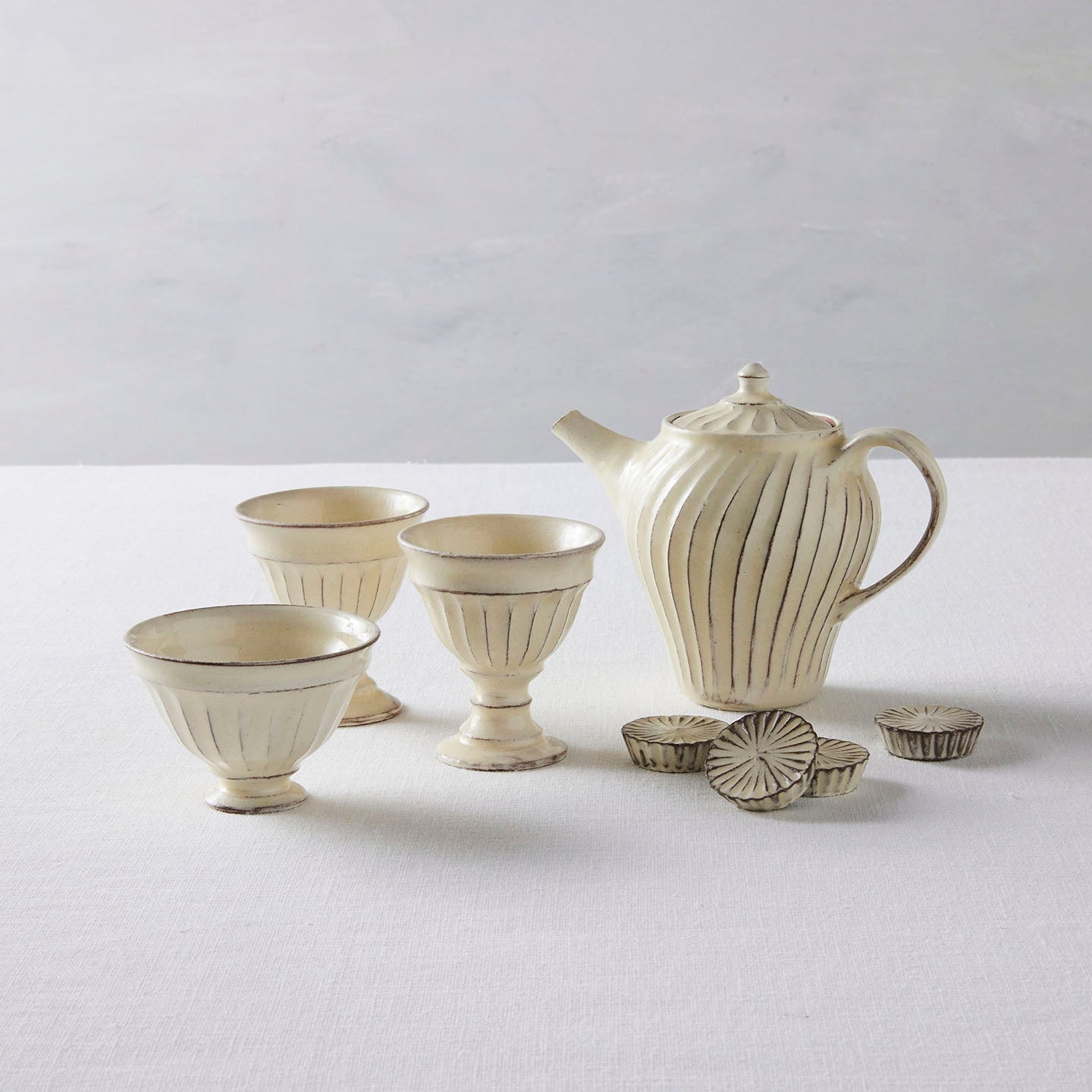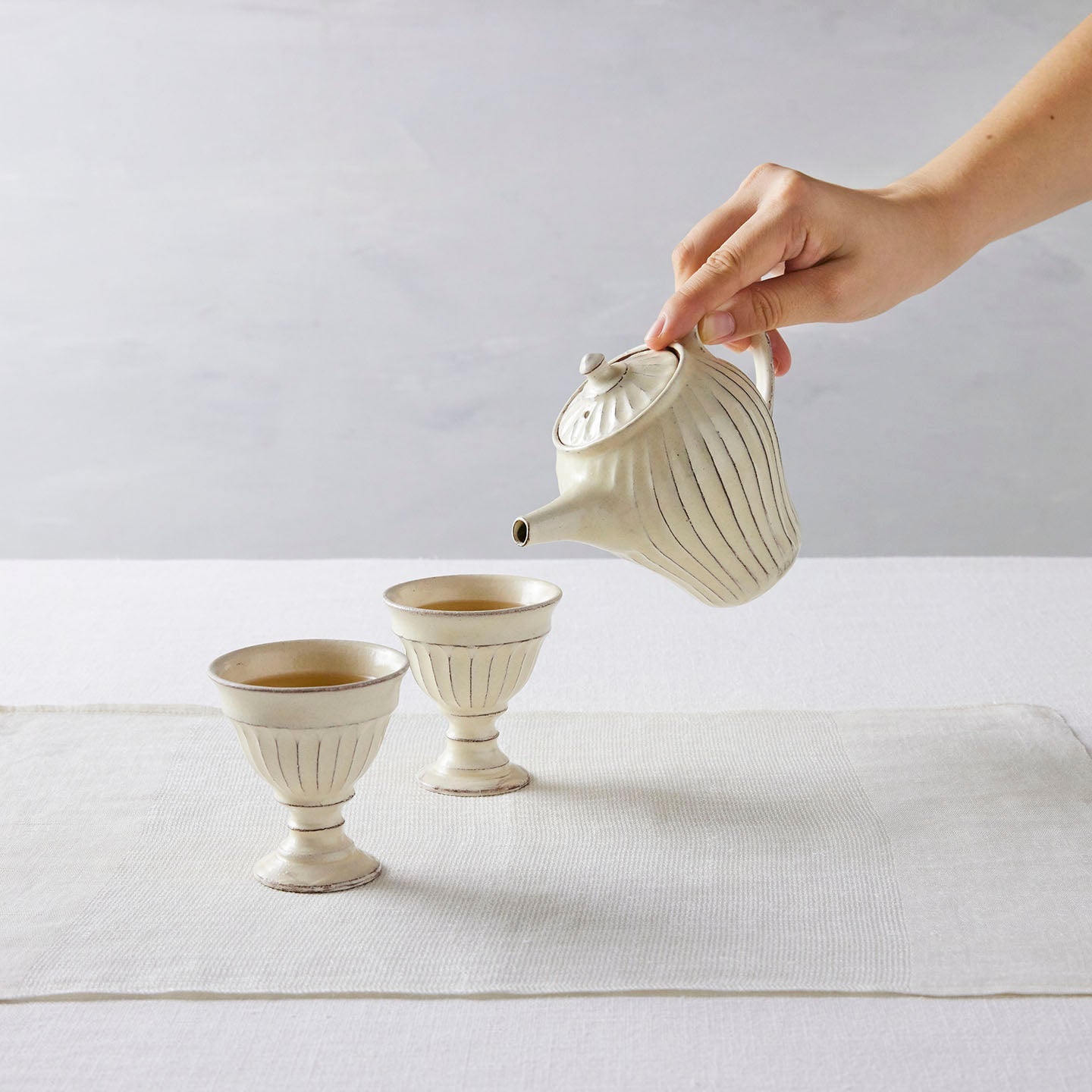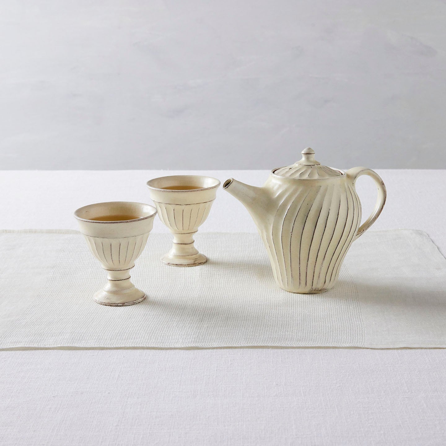 「ポット」は、側面に弧を描いたような削りの模様がほどこされたシリーズ。名前は「ポット」で洋食器のようでもありますが、日本茶や煎茶などをいれる「急須」としてもぴったり。