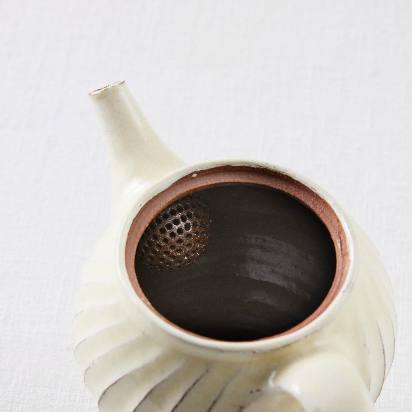 内側には丸い茶こしが取り付けられているタイプ。中に余裕が生まれるので、茶葉がお湯の中で開きやすく、おいしくお茶をいれることができます。