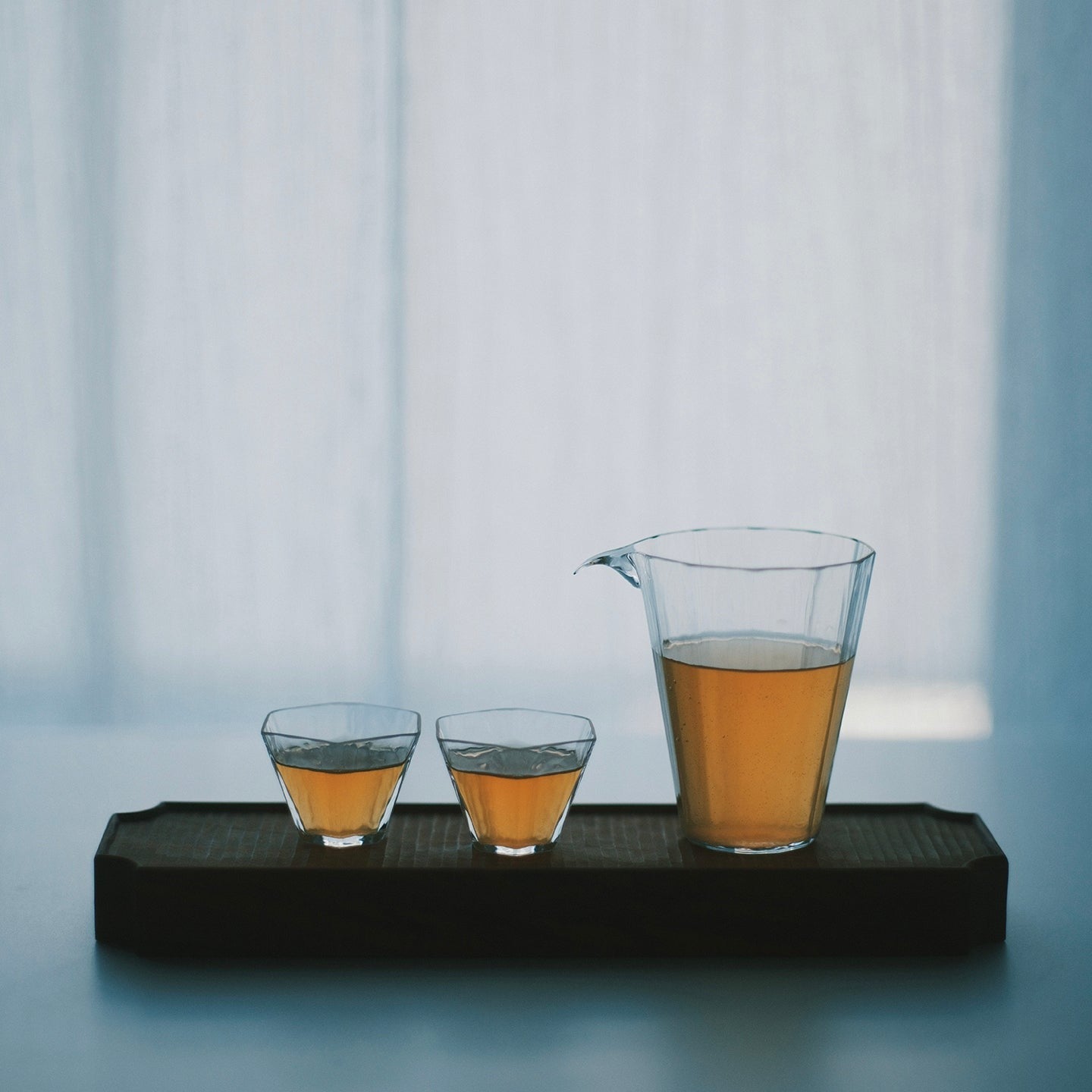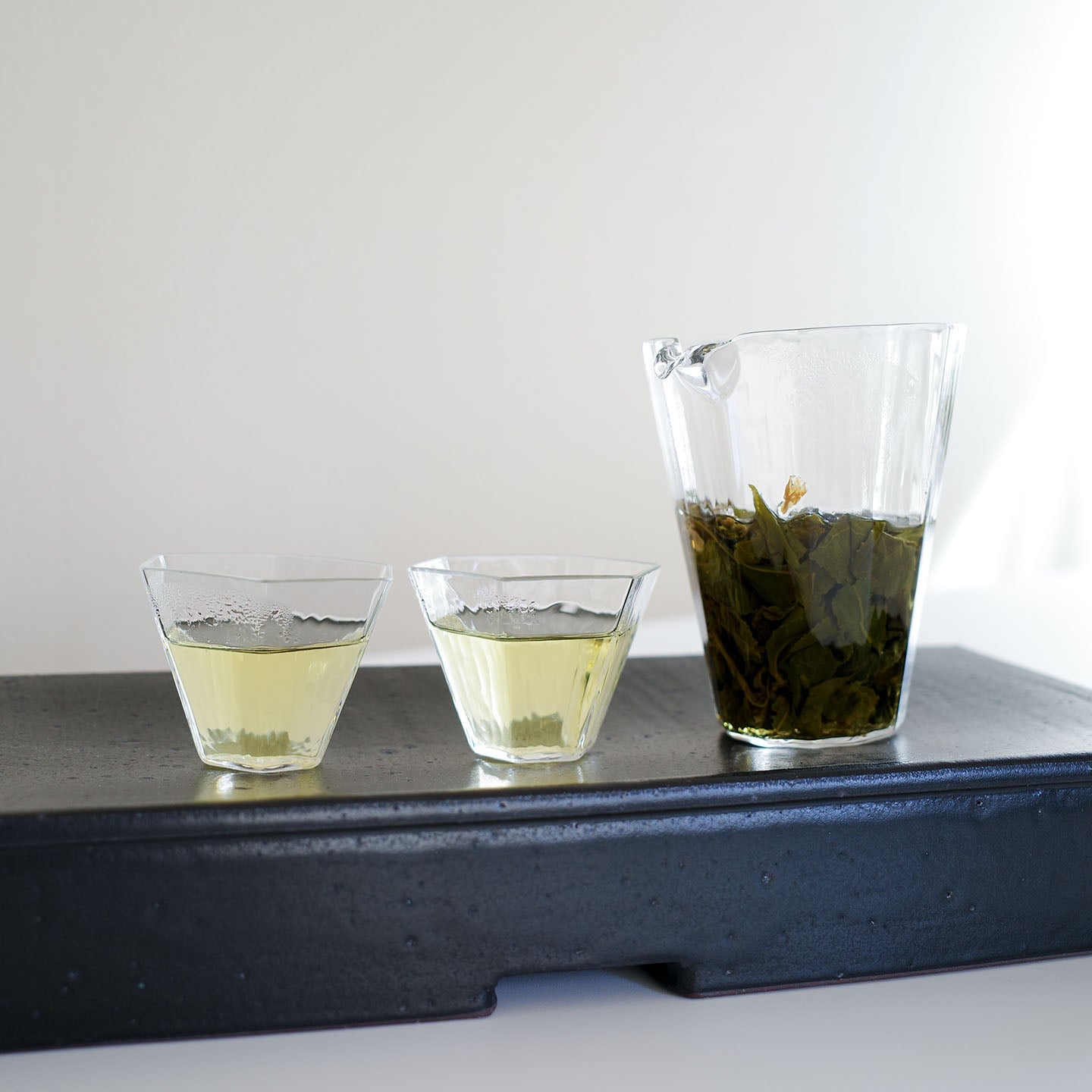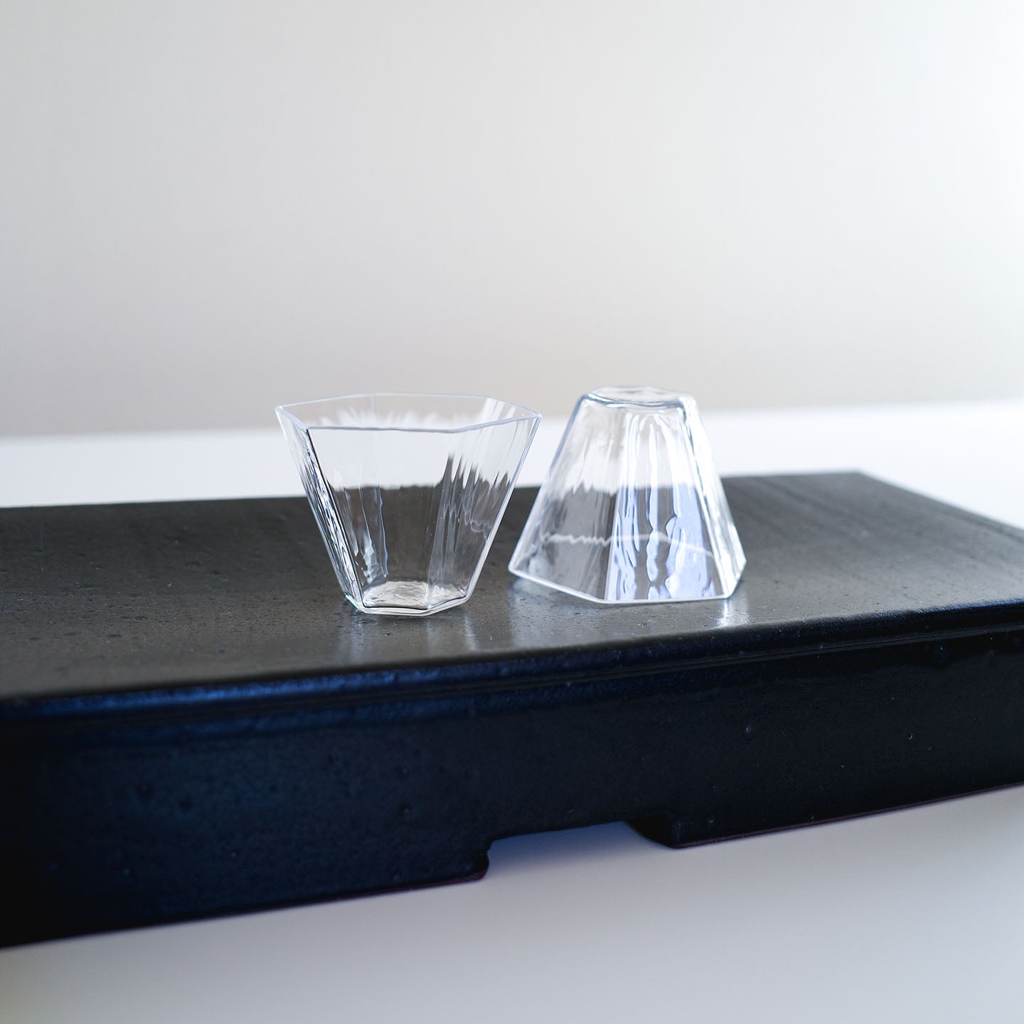 お茶を注げば、クリアなガラスの中でお茶がゆらゆらとゆらぎ、眺めているだけでうっとりした気持ちに。光を通すと、テーブルの上にキラキラと波打つ光の乱反射が美しく、小さな器が何倍にも輝いて見えます。