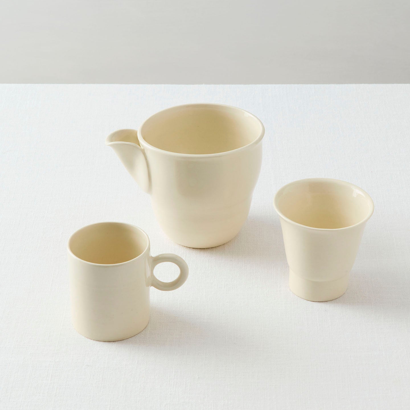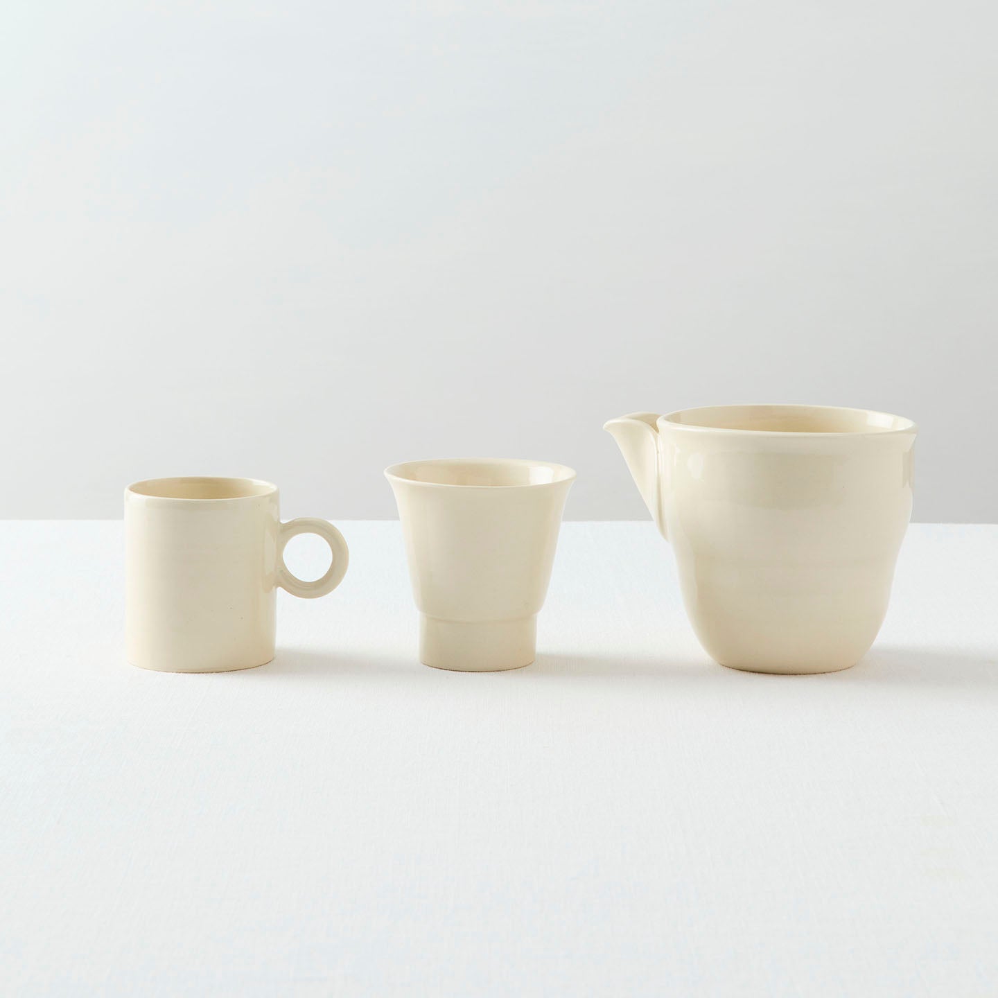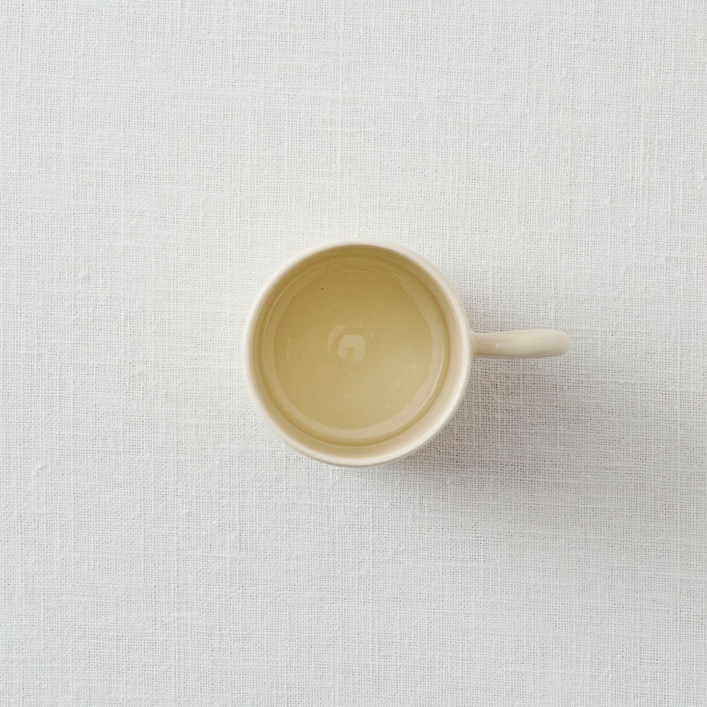 煎茶を愉しむシーンにぴったりの容量約120mlのカップです。秀野さんの作品には、円形をモチーフにしたものが多く登場しますが、そのエッセンスは器にも。カップの丸い持ち手はなんともいい塩梅で、遊んでくれています。