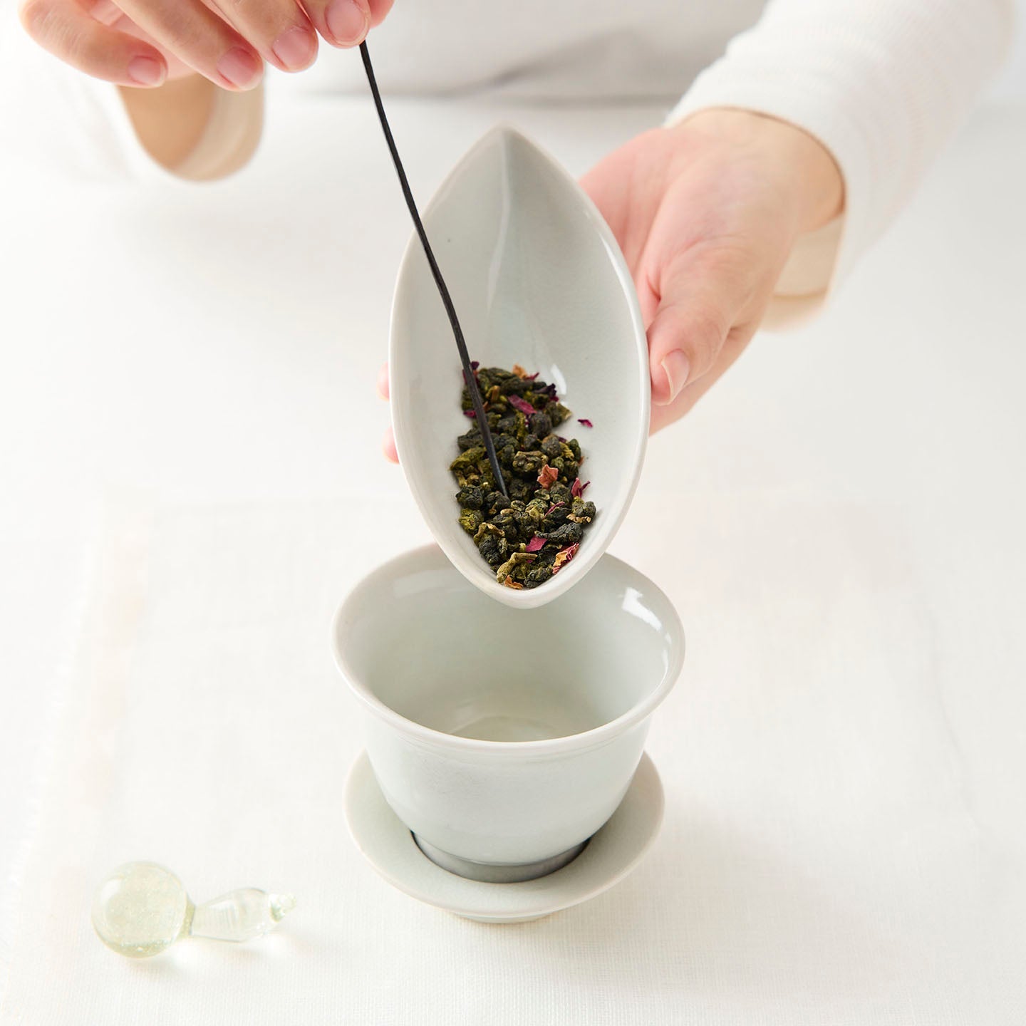 小舟のようなフォルムの小さな鉢は、食器としてはもちろん、茶則としてもお使いいただけます。両端は尖り方が異なるので、茶壷の大きさに合わせて変えることで、茶葉をスムーズに茶壷に移すことができます。
