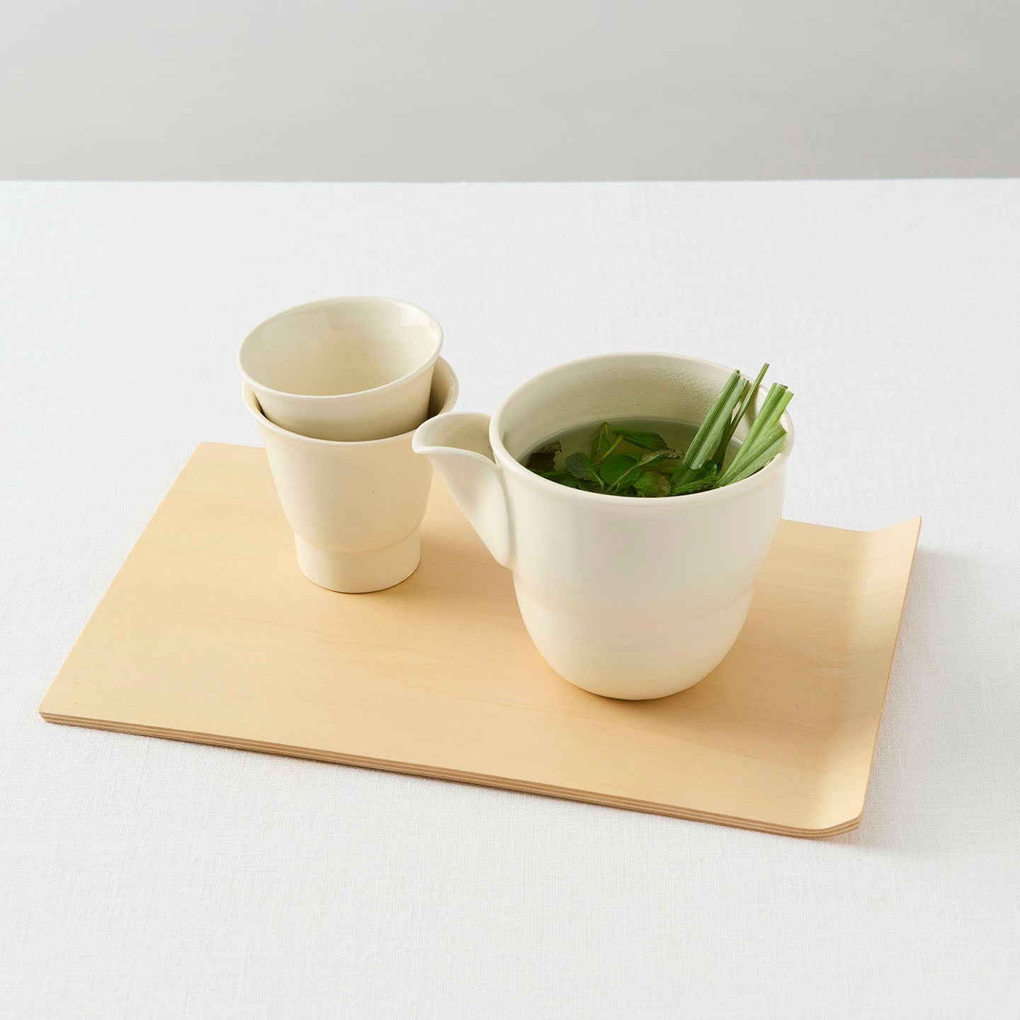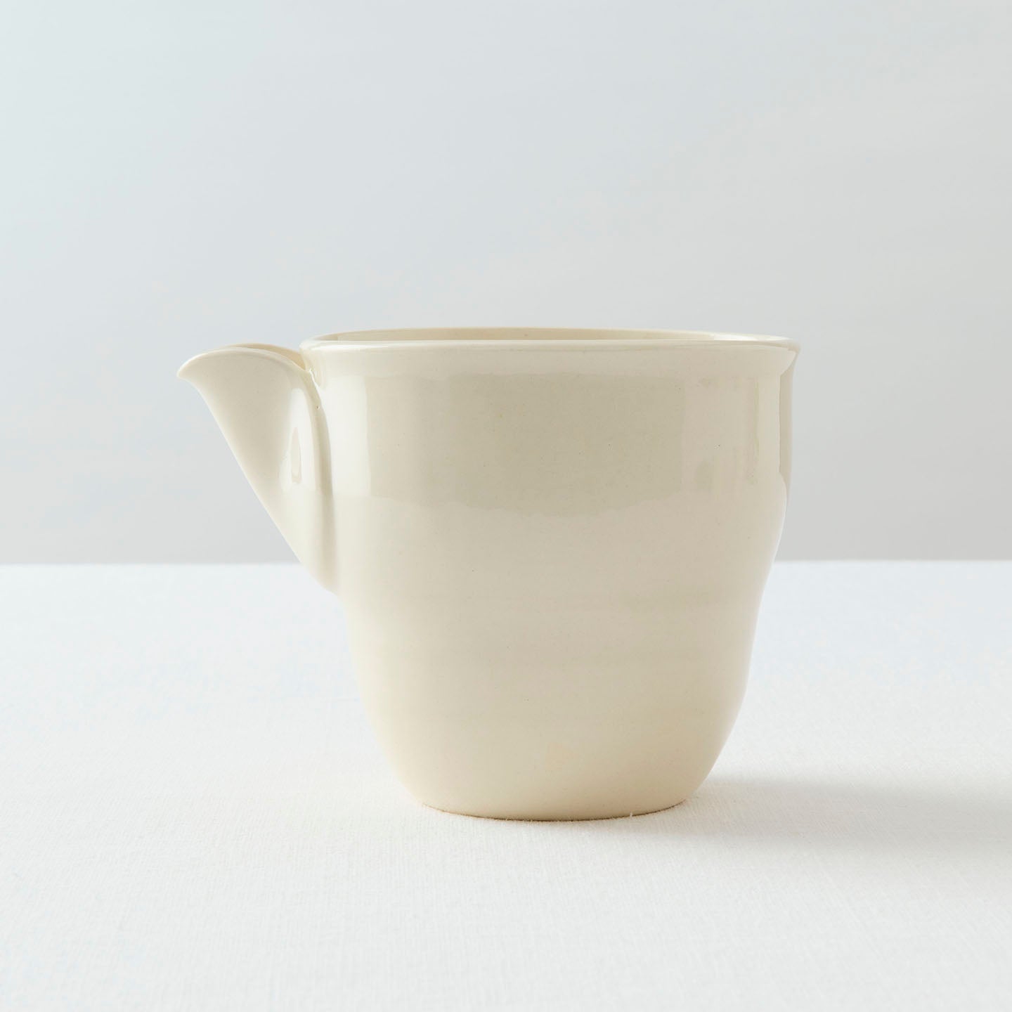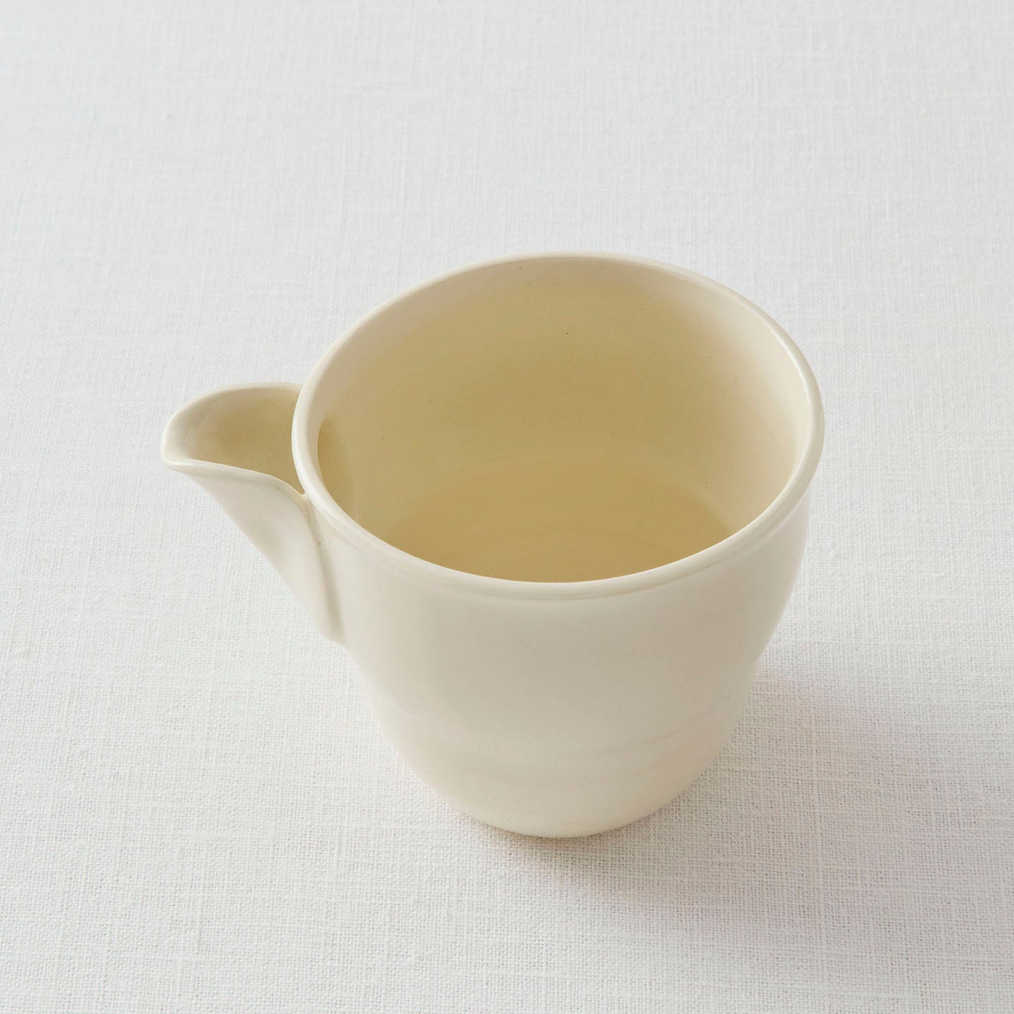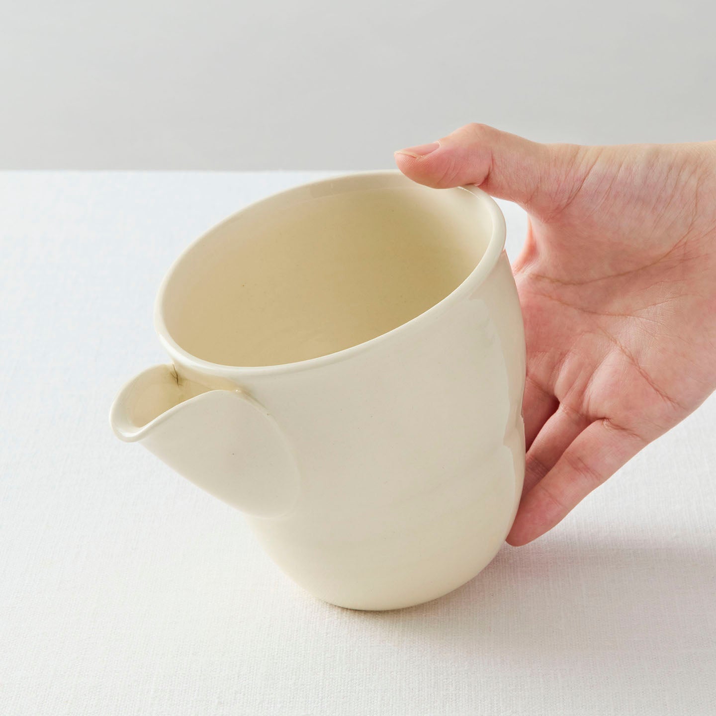 ぽってりとした愛らしい「片口」はまるでミルクピッチャーのよう。お茶のシーン以外にも、用途を選ばず活躍してくれそうです。薄い円形の粘土を注ぎ口になるようにつけたデザインと、ほんのりとくびれたフォルム。やさしい線の揺らぎに心打たれます。