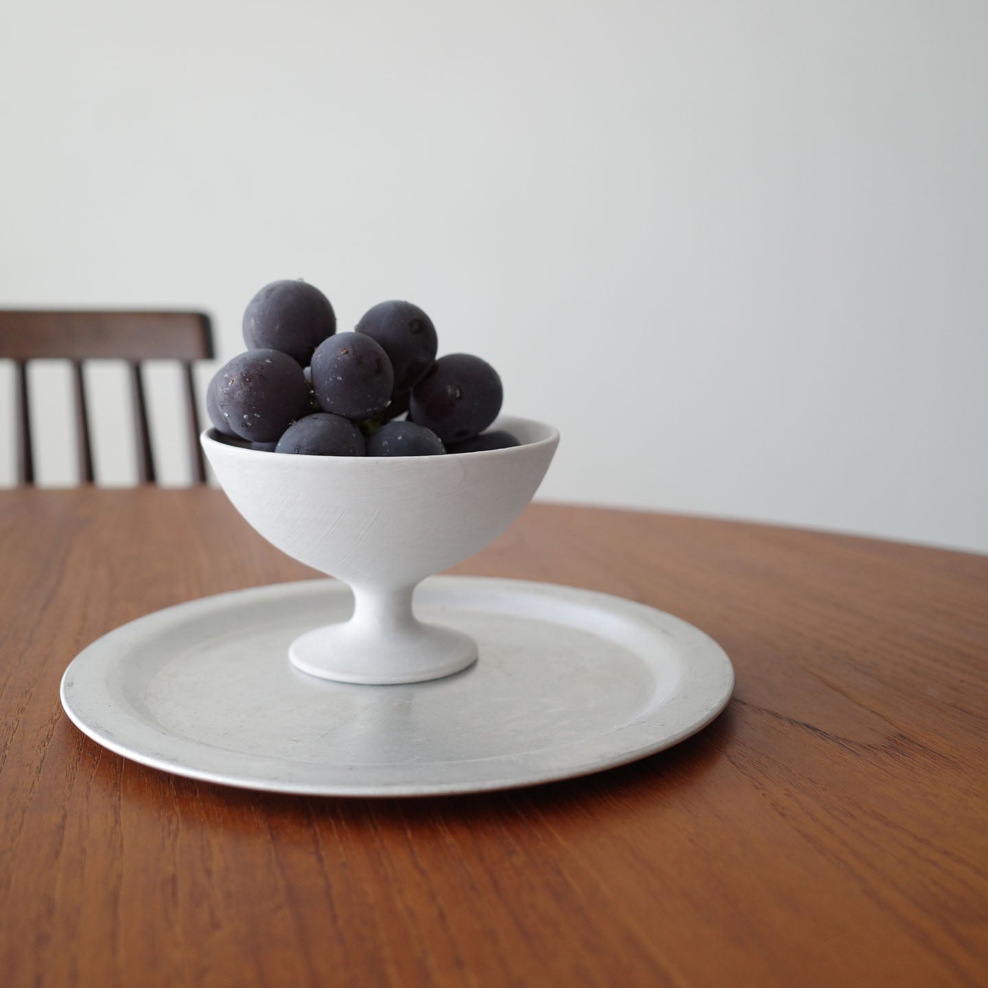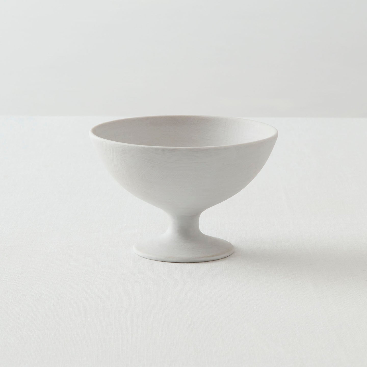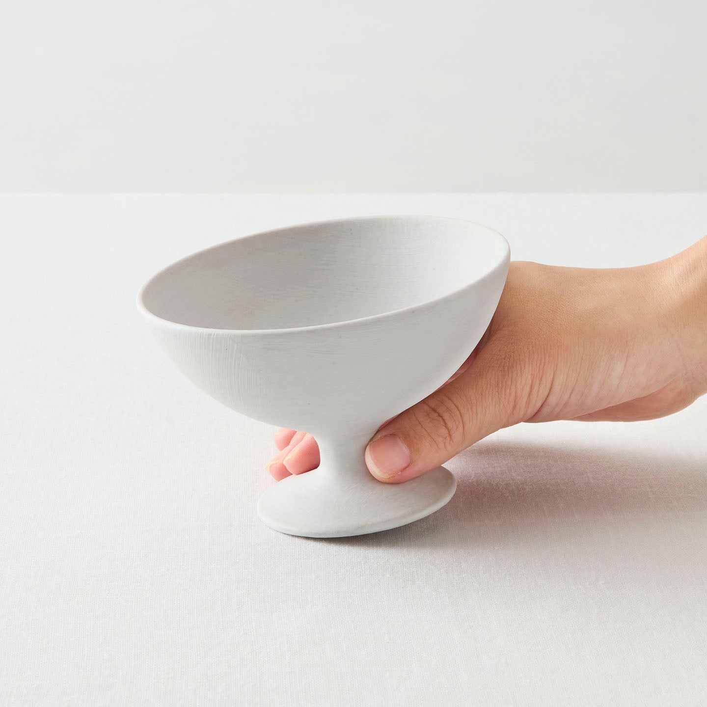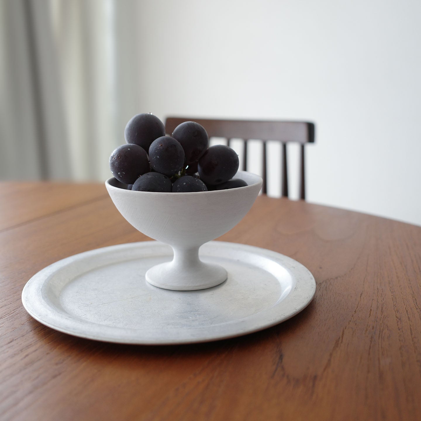 絵画のモチーフのような存在感のあるフォルムと、質感がバランスの良いデザートカップ。脚付きの器はさまざまな作り方がありますが、児玉さんは削り出しの工程を採用しています。