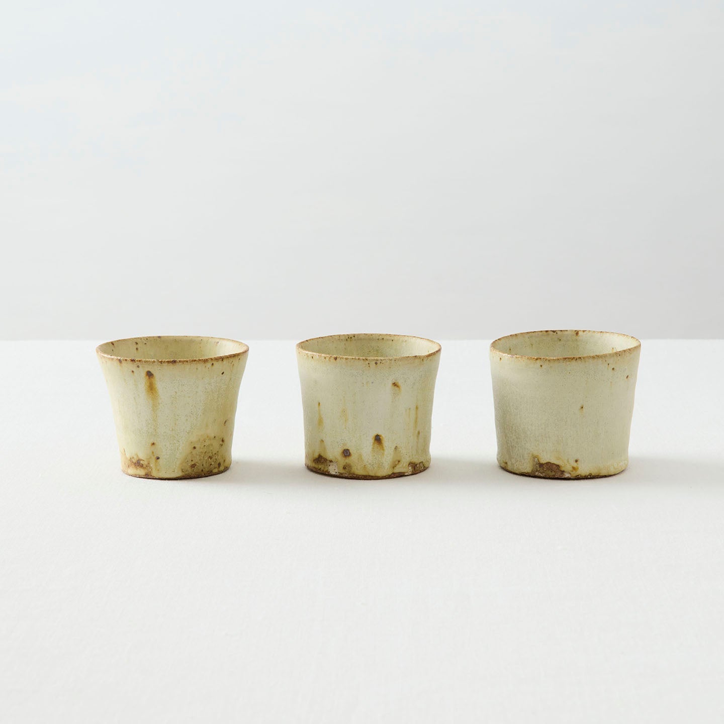 ゆるやかに口が広がる「蕎麦猪口」。釉薬の下から覗く素地や粘土の粒子が魅せる表情はひとつずつ異なる1点モノ。集めて違いを楽しみたくなります。