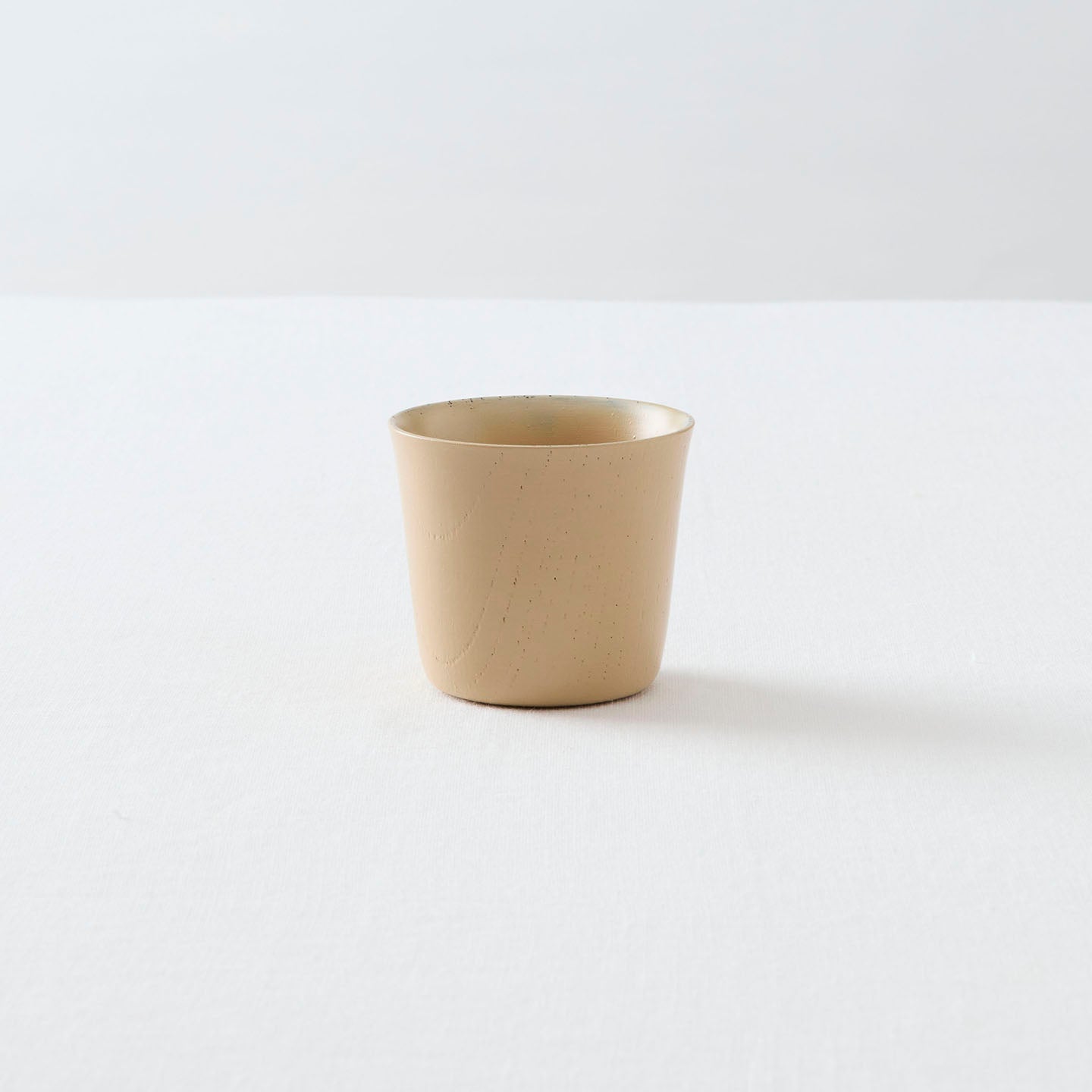 木目が透けて見えるミルクティー色の「茶杯」。高さ5.5cmほどの小ぶりなサイズと、わずか35gという軽さで、すっと手のひらになじみます。