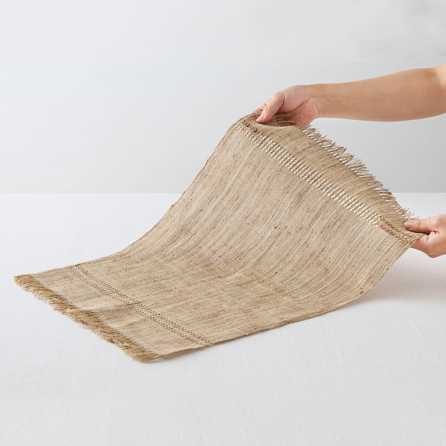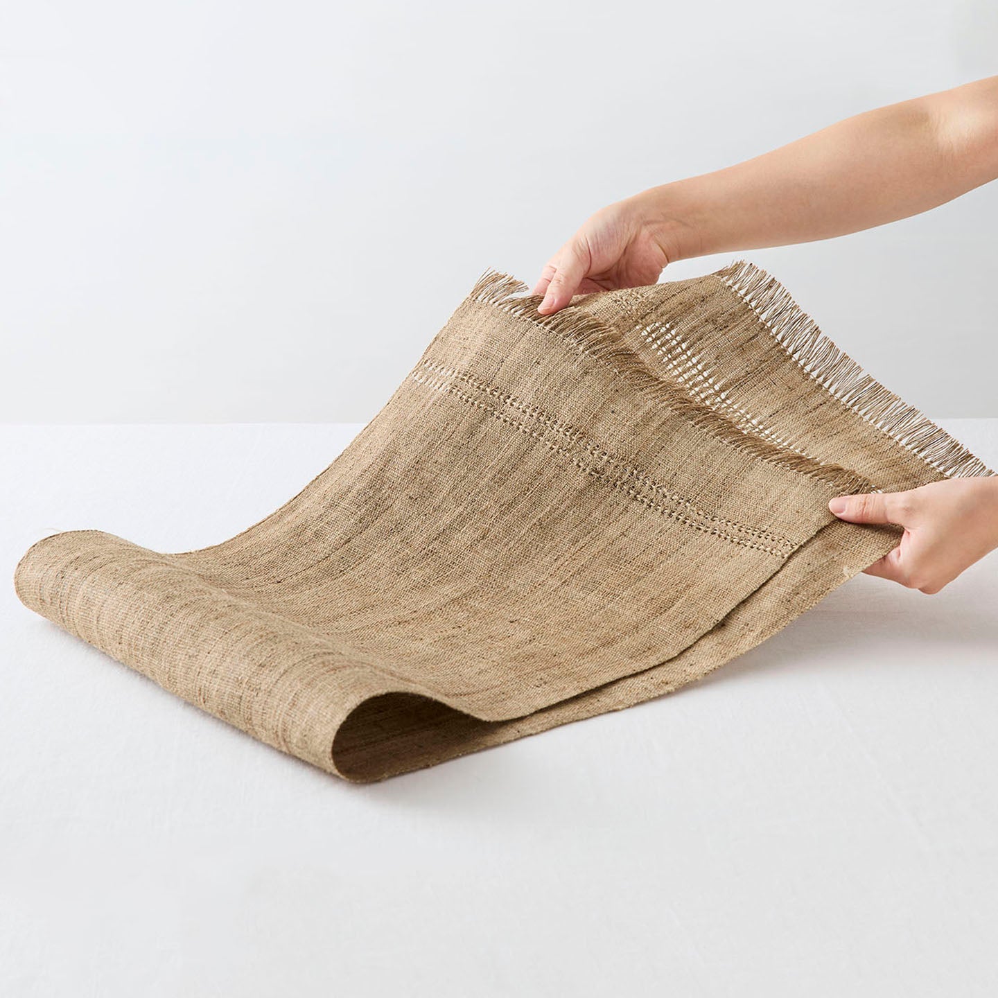麻の一種でありながらジュートとは異なり、シルクのような艶も持ち合わせ、機械で紡がれた糸にはない自然の風合いが楽しめます。