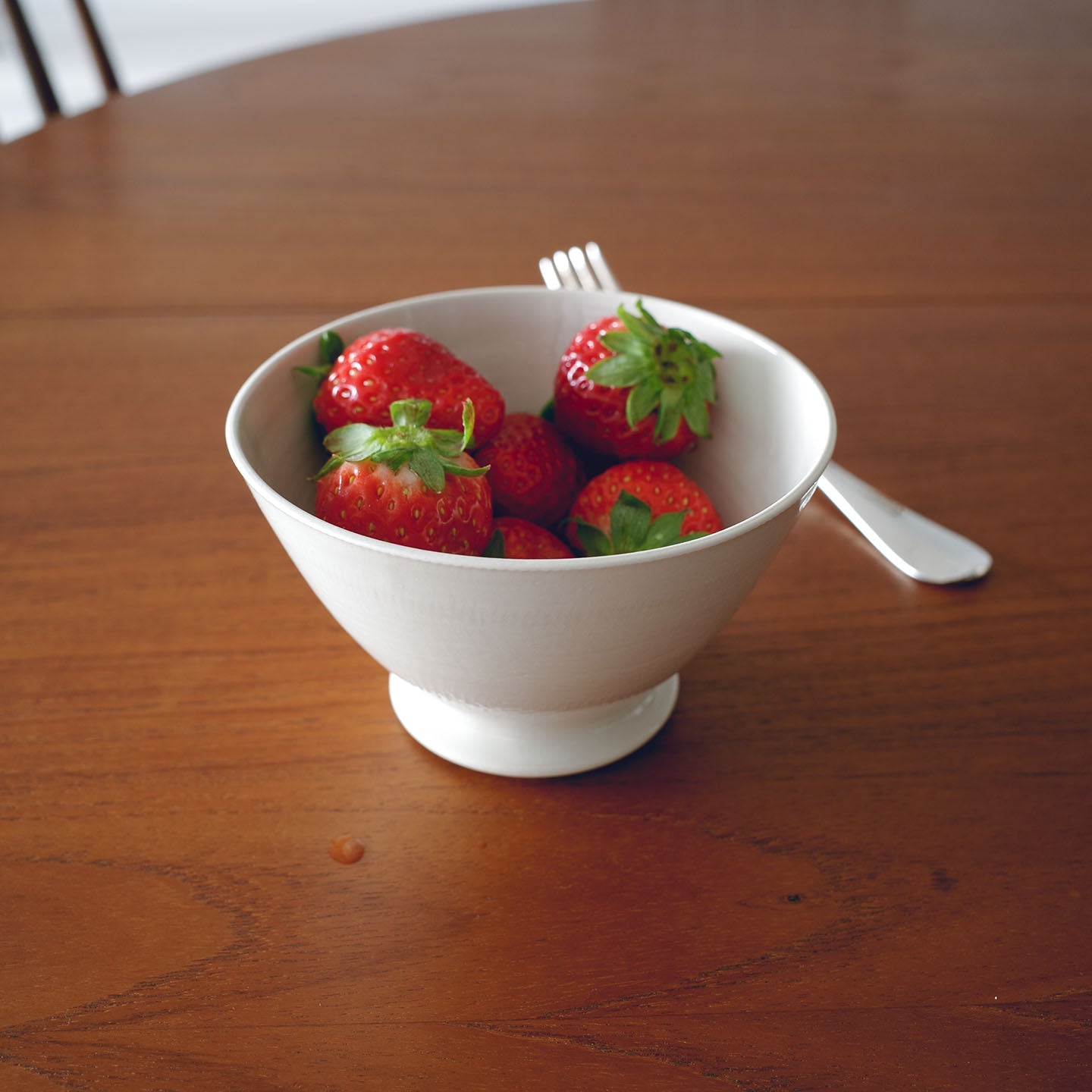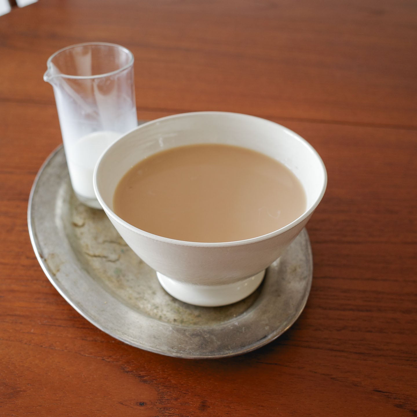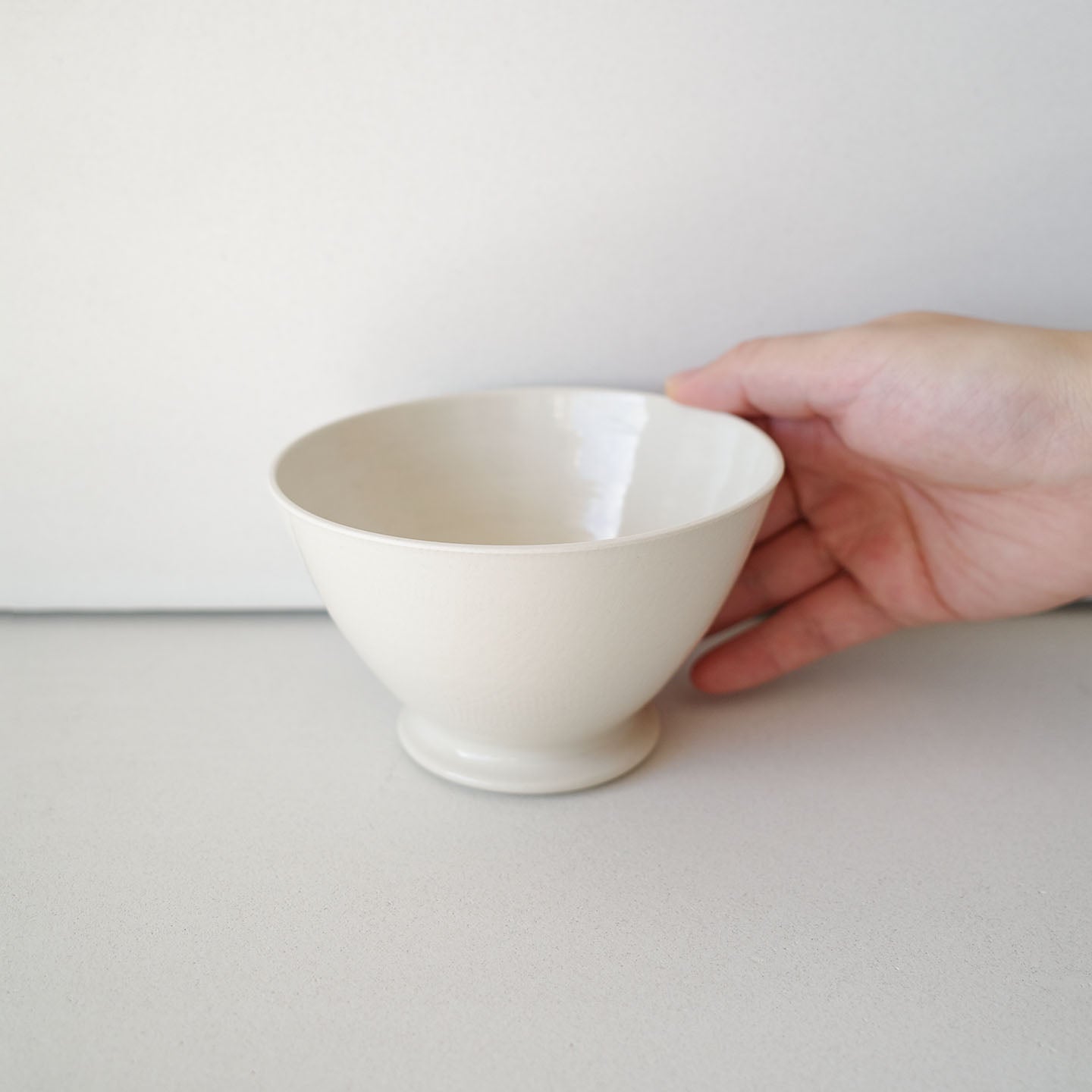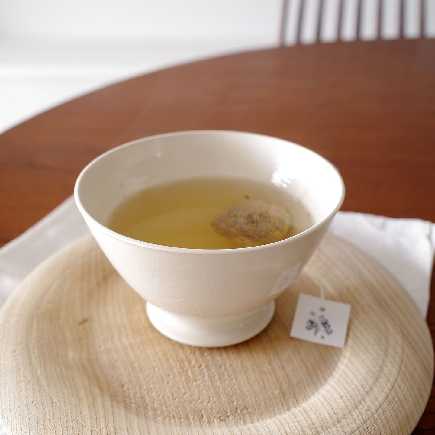 アイボリーに近い乳白色は、どんなお茶の色もよく映えます。凛としたシルエットとも相まって、合わせる道具も、陶器、金属、木製と、なんでも受け入れてくれる懐の広い器です。