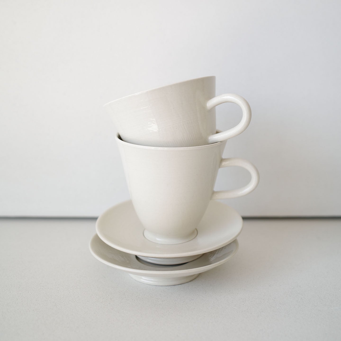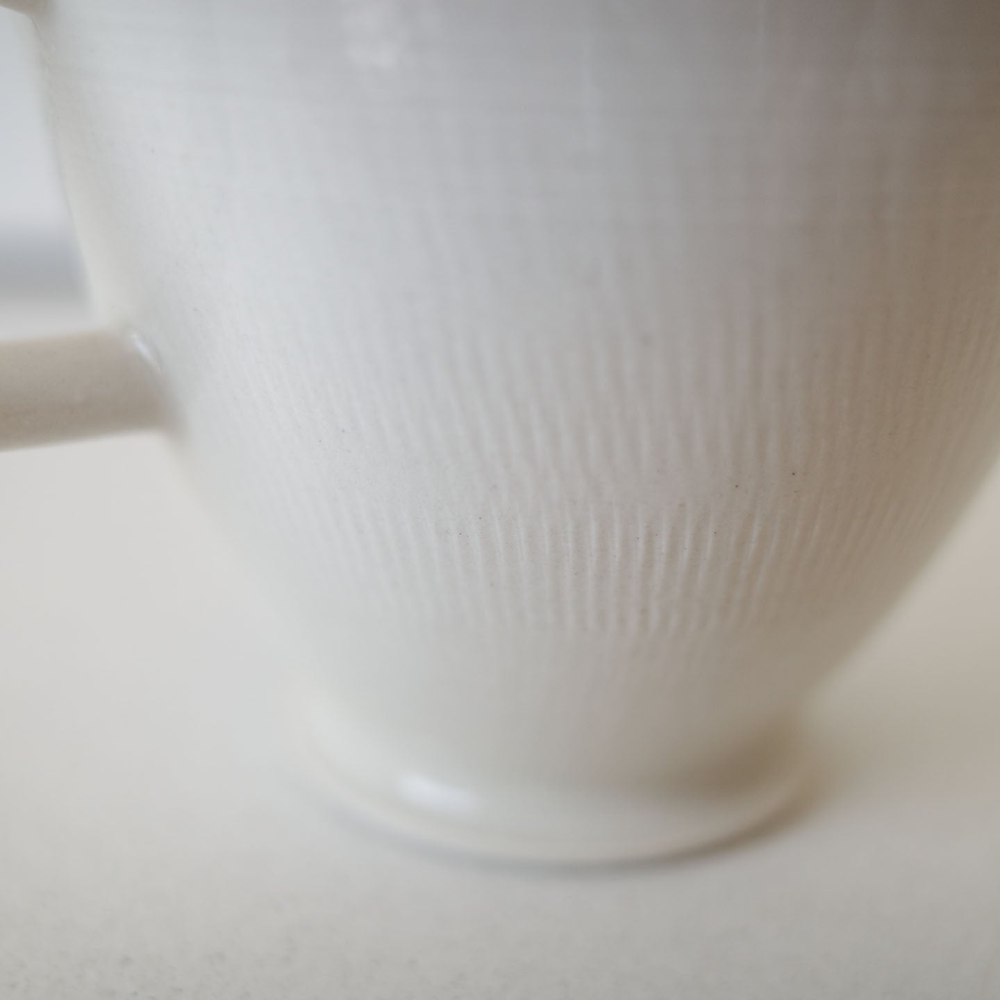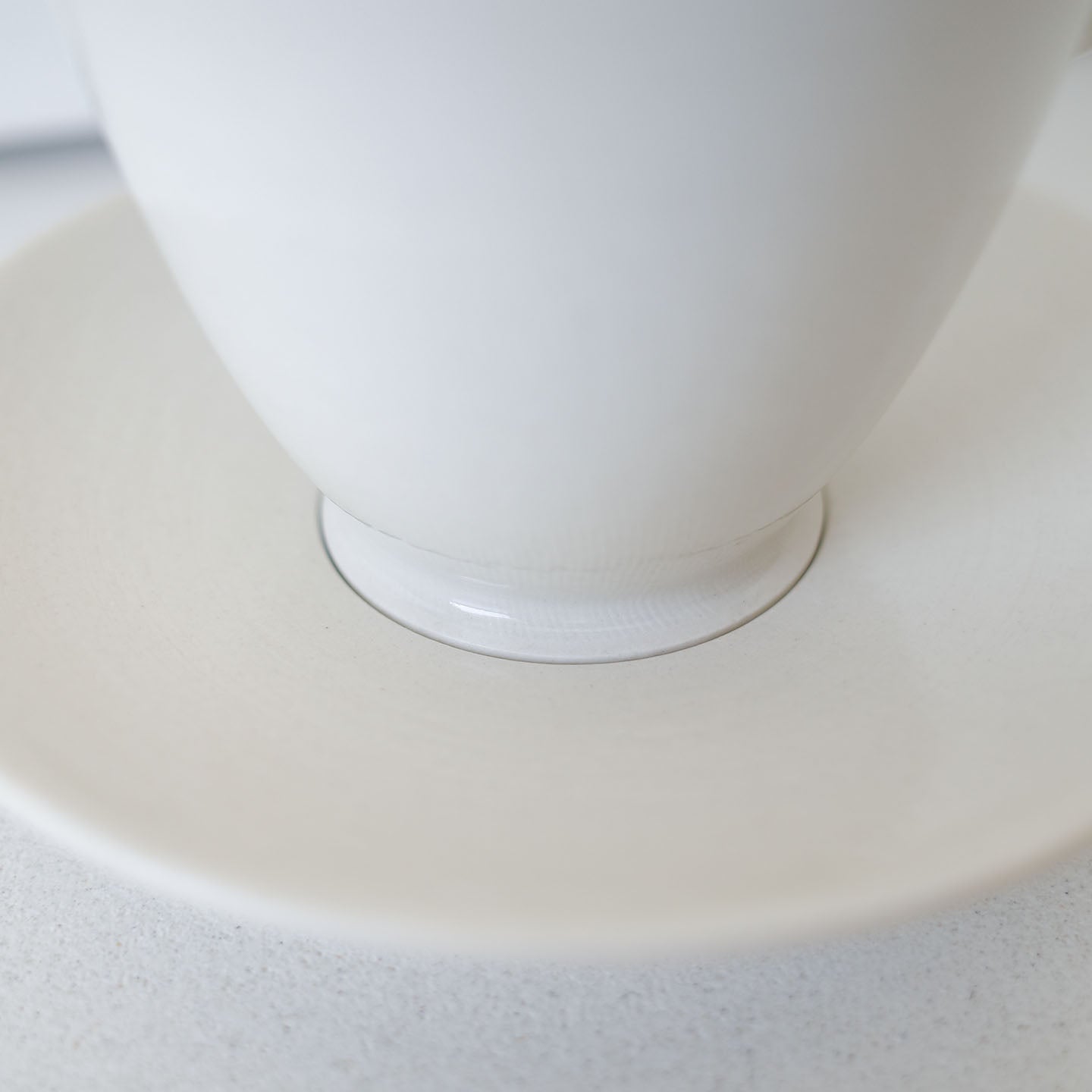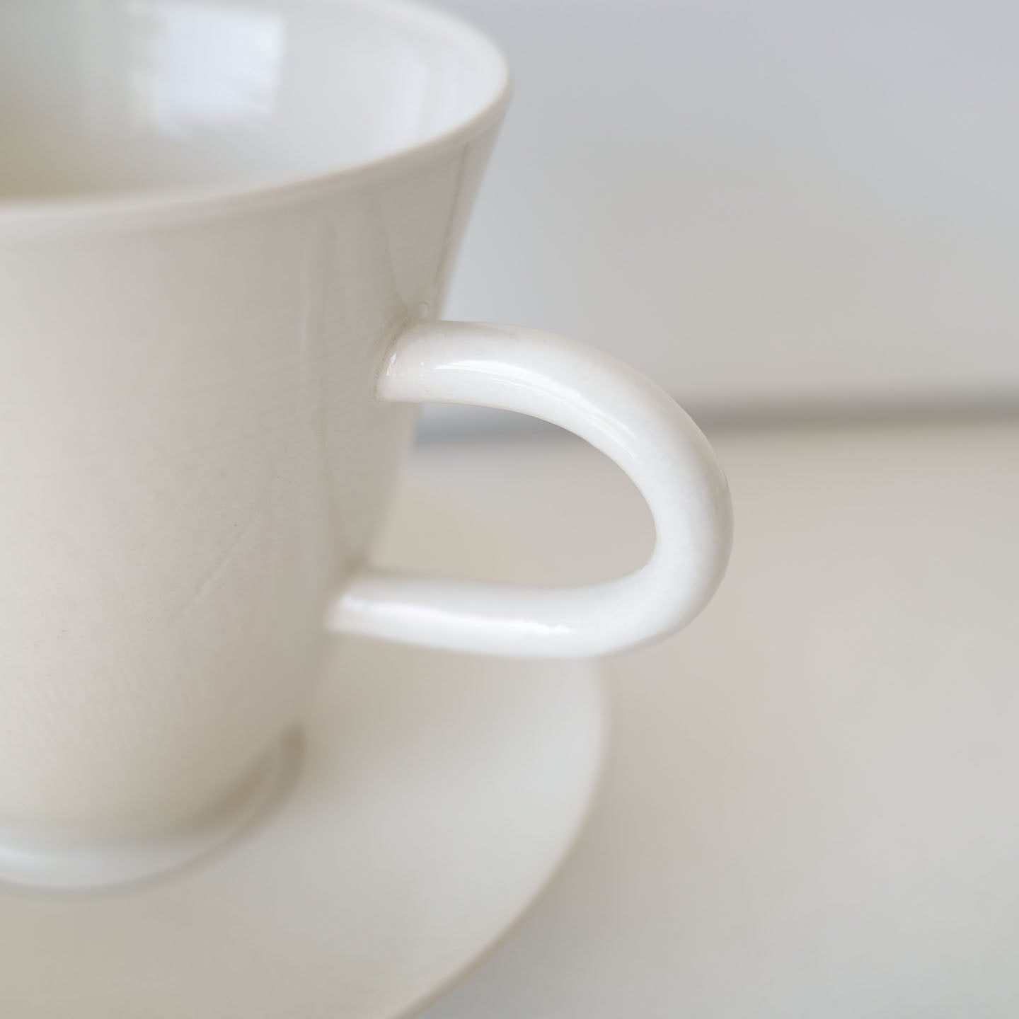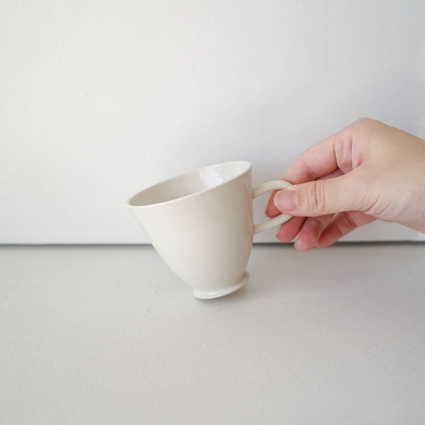 やわらかな乳白色の、凛とした佇まいの「丸カップ」。高台に向けてスッと細くなるシルエットが、聖杯のようでもあります。
