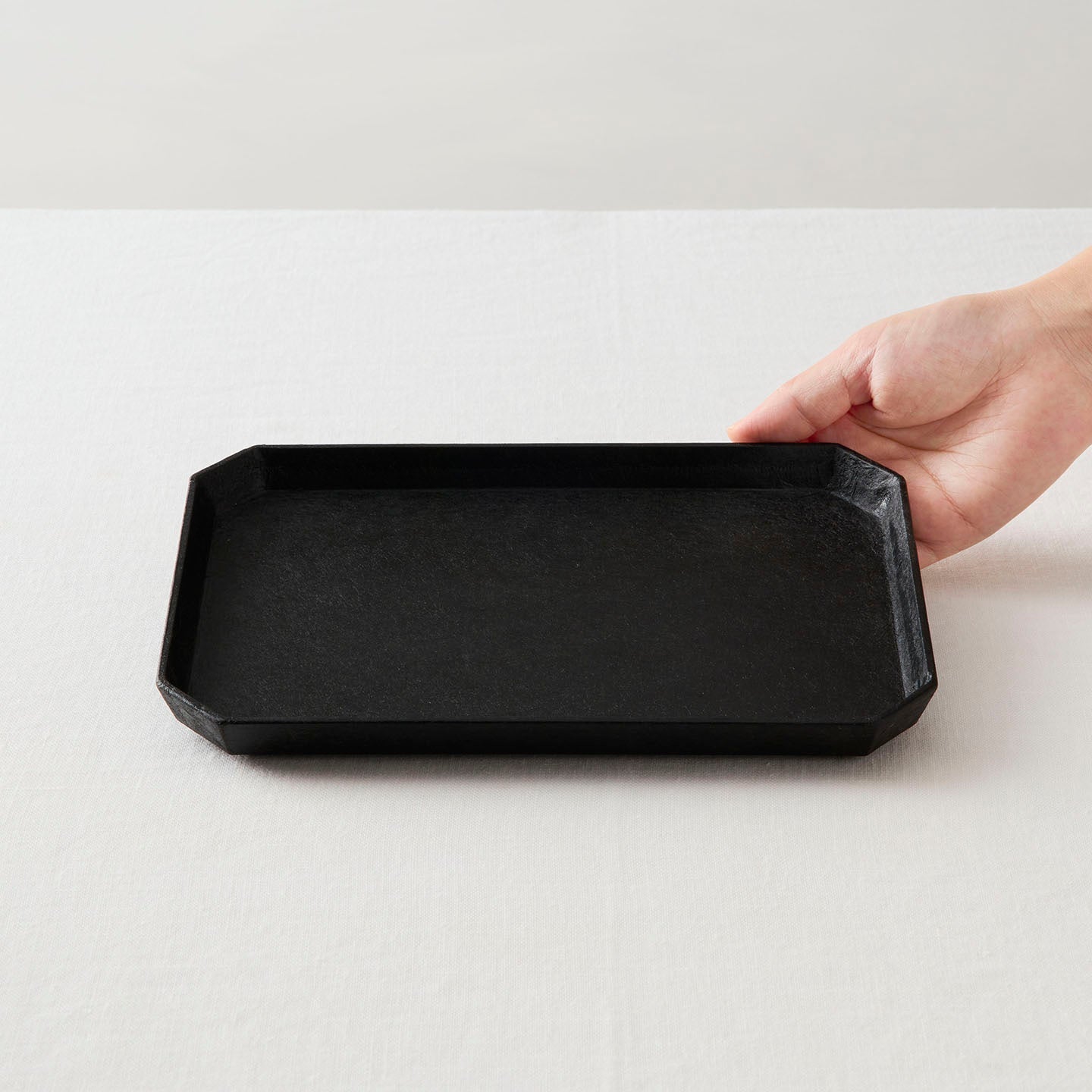 器の佇まいを静かに引き立てながら、スッと手を添えやすく、運ぶための実用性も兼ね備えた「すみきり茶盆」。約幅22.5cm、奥行15cmと日常使いしやすい大きさです