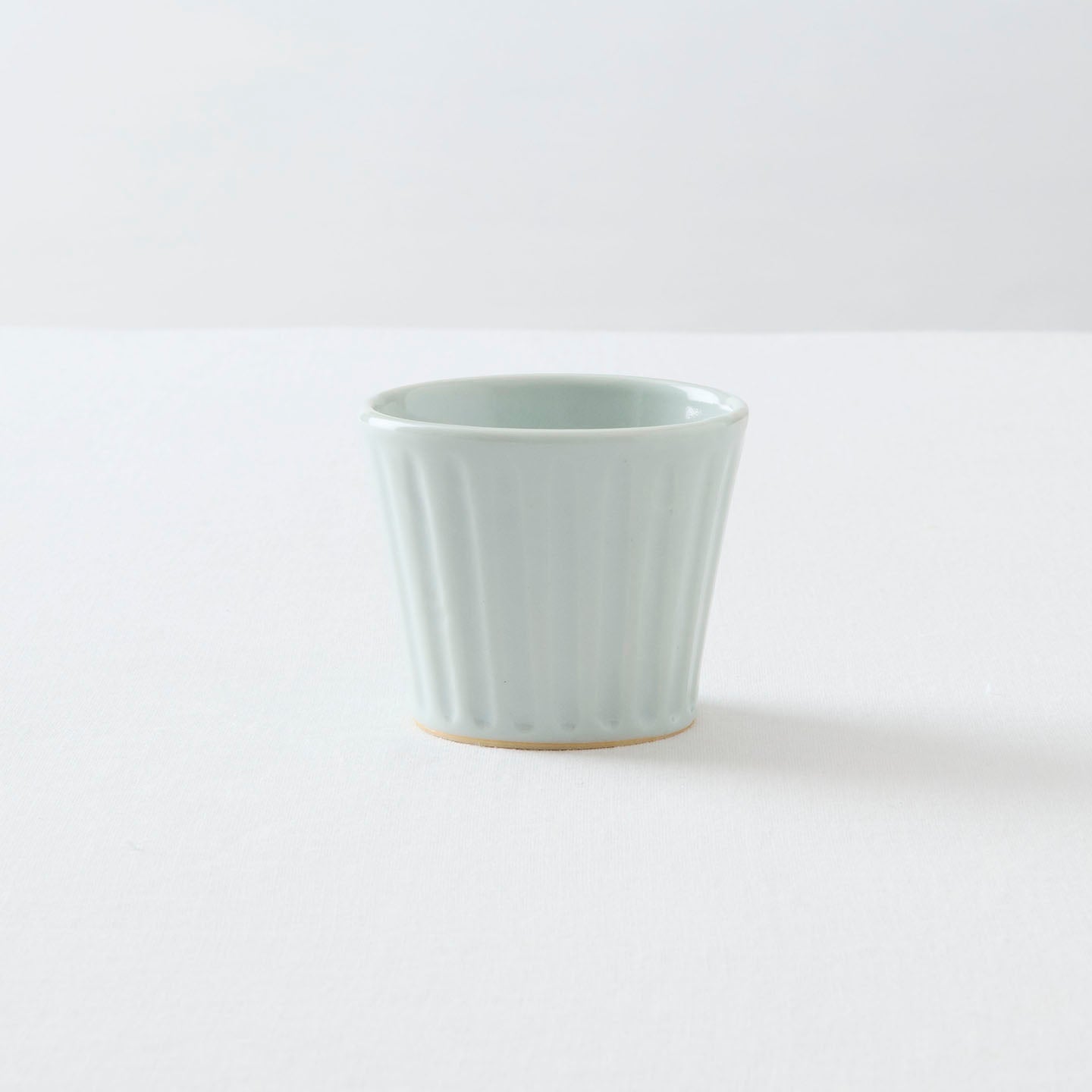 ぽってりと乳白色の釉薬がかかった「乳白釉シノギ猪口」。広く削られたシノギ模様がモダンな印象です。