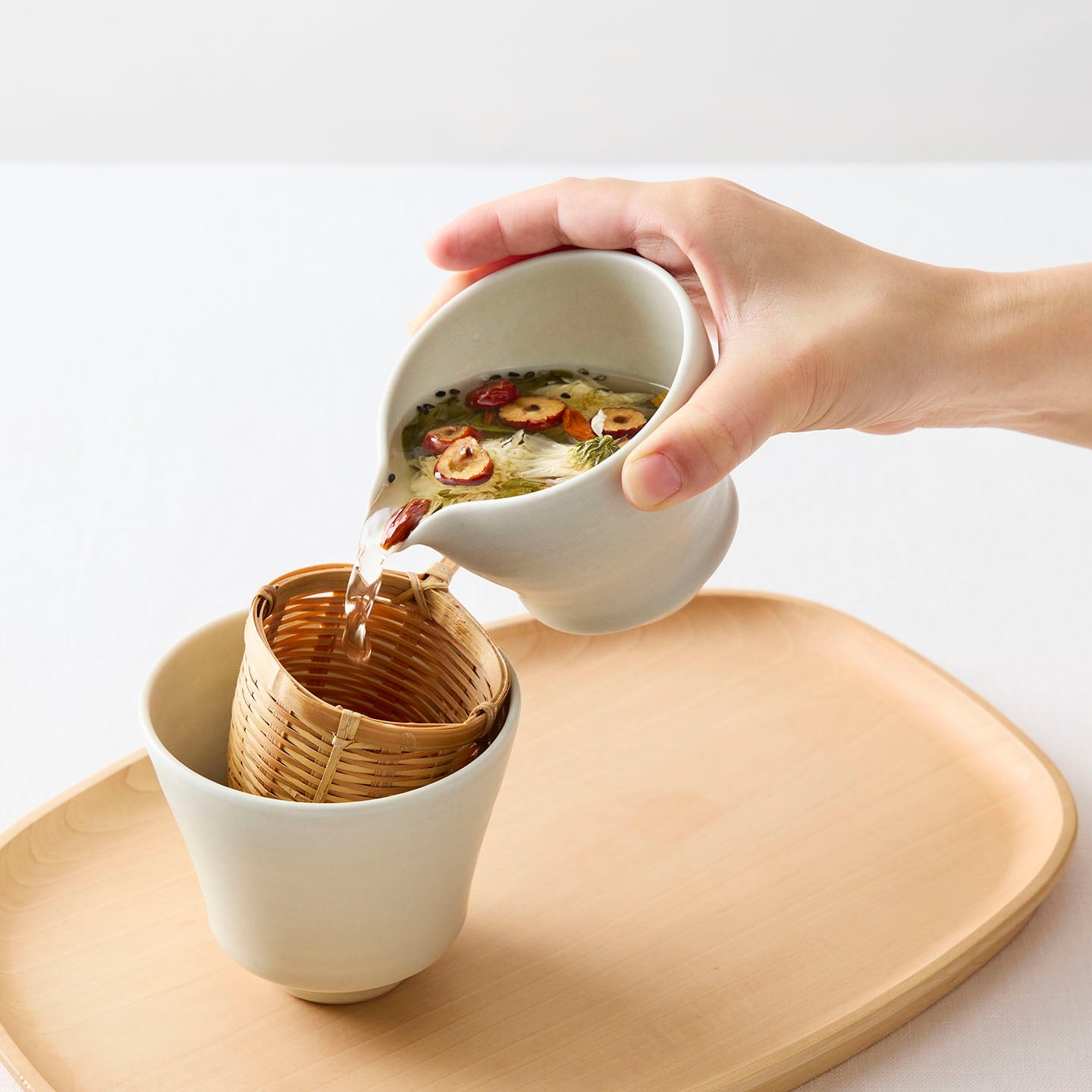 土井さんの「緑白釉茶海」は、腰のラインがほっそりしていて、凛とした佇まいに目が惹きつけられます。持ったときも手になじみやすく、お茶を注ぎ分ける仕草も美しく見えます。