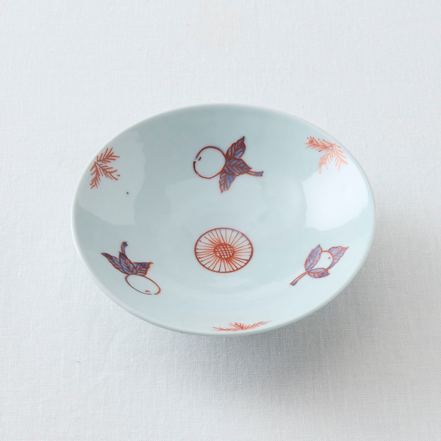 中国から伝来し、日本で発展した唐草の模様を取り入れた「色絵6寸浅鉢」。清水さんのやわらかい筆使いと、愛らしく上品な色使いで、ぐっと親しみやすい器になっています。