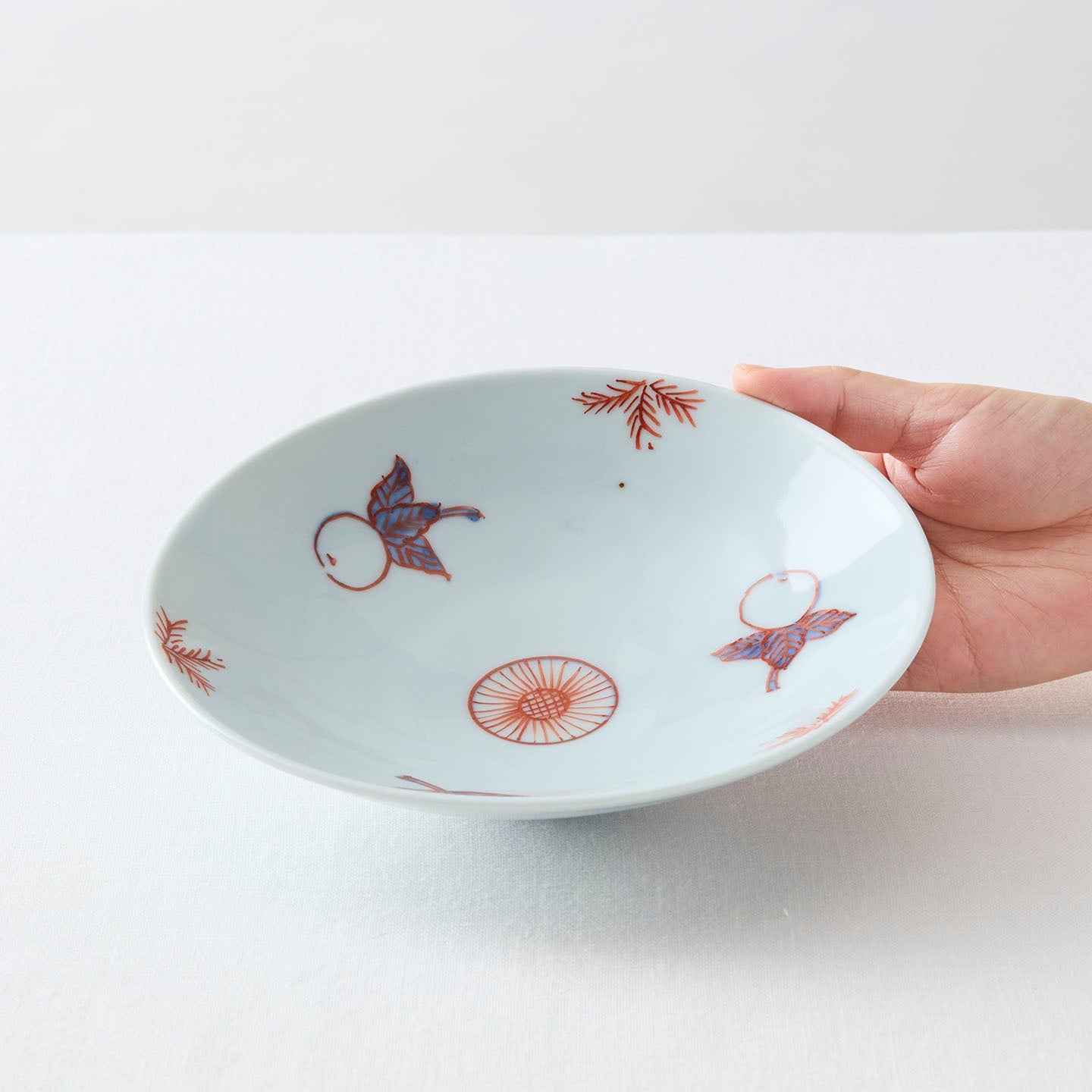 ぷっくりと描かれた果実が愛らしい「色絵鬼灯唐草6寸浅鉢 鬼灯」。水彩のように青く染まった鄂(がく)も上品です。ほんのり青みを帯びた釉薬と古典柄が相まって、骨董品のような雰囲気に。柿やカボチャなどビビッドな食材と相性が良さそうです。