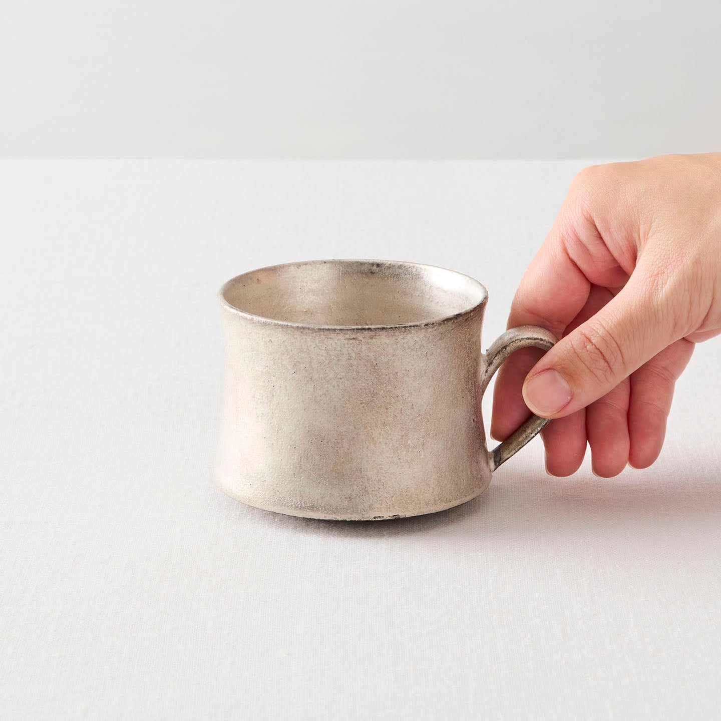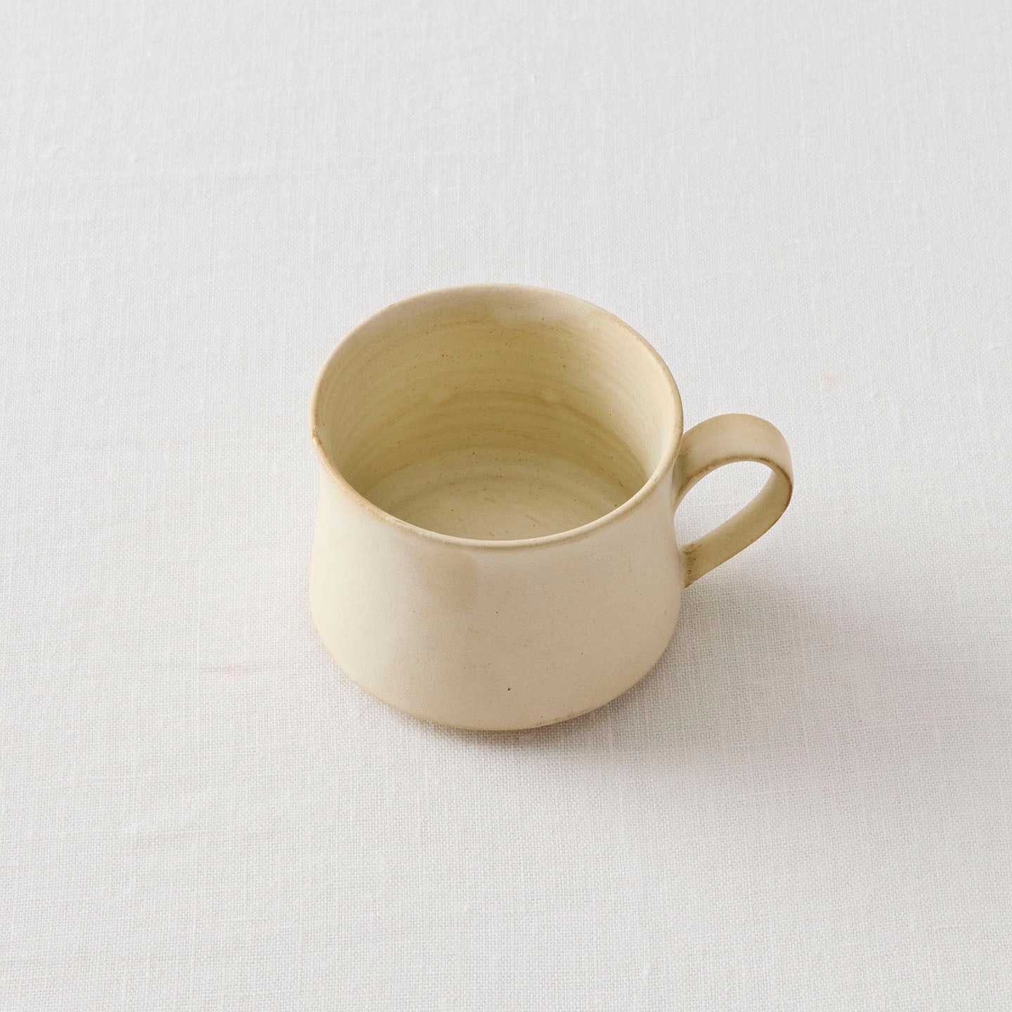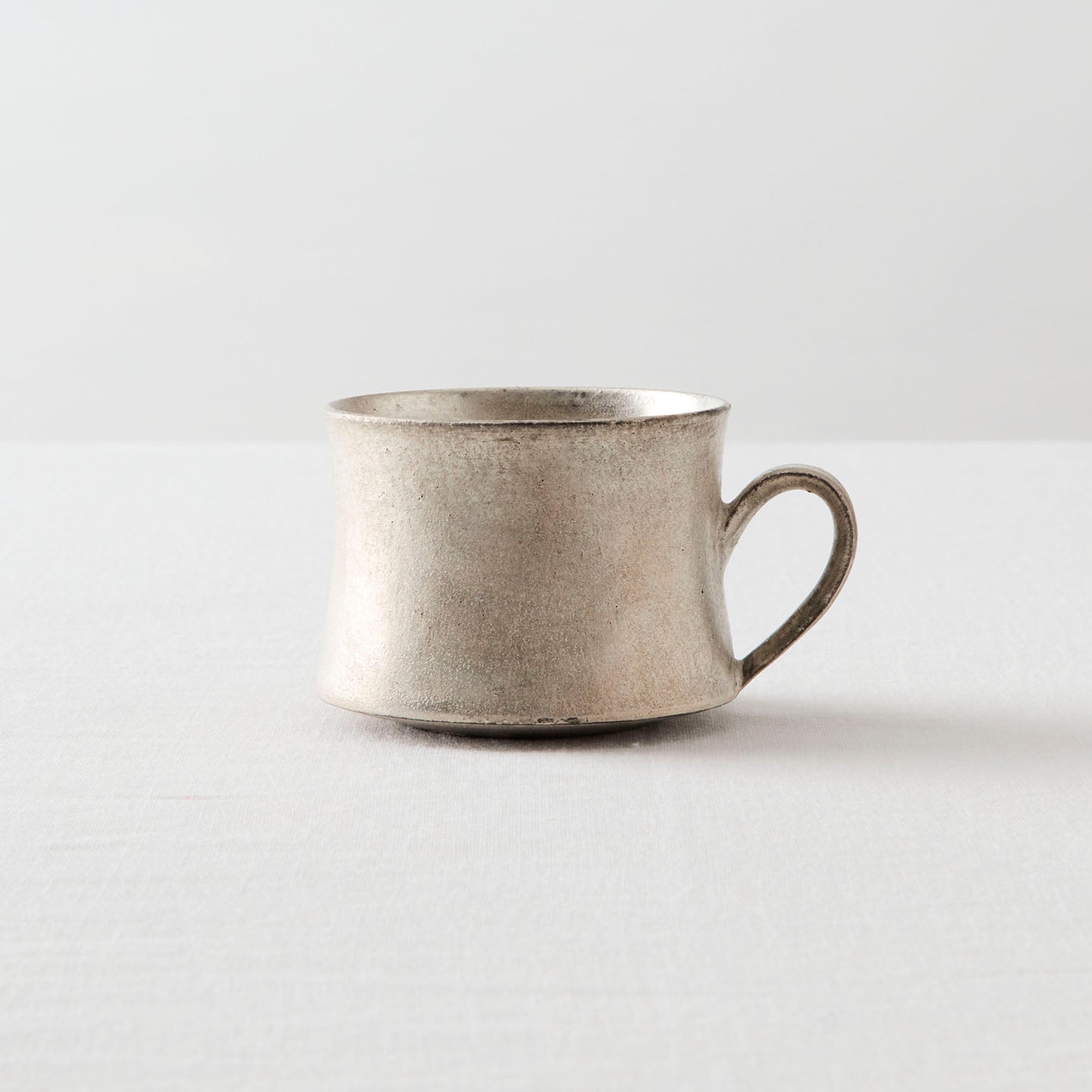 底に向かって広がりを見せる、落ち着いた佇まいの「コーヒーカップ」。取っ手も胴中から下方に配置されており、揺るぎない安定感にほっと心がなごみます。