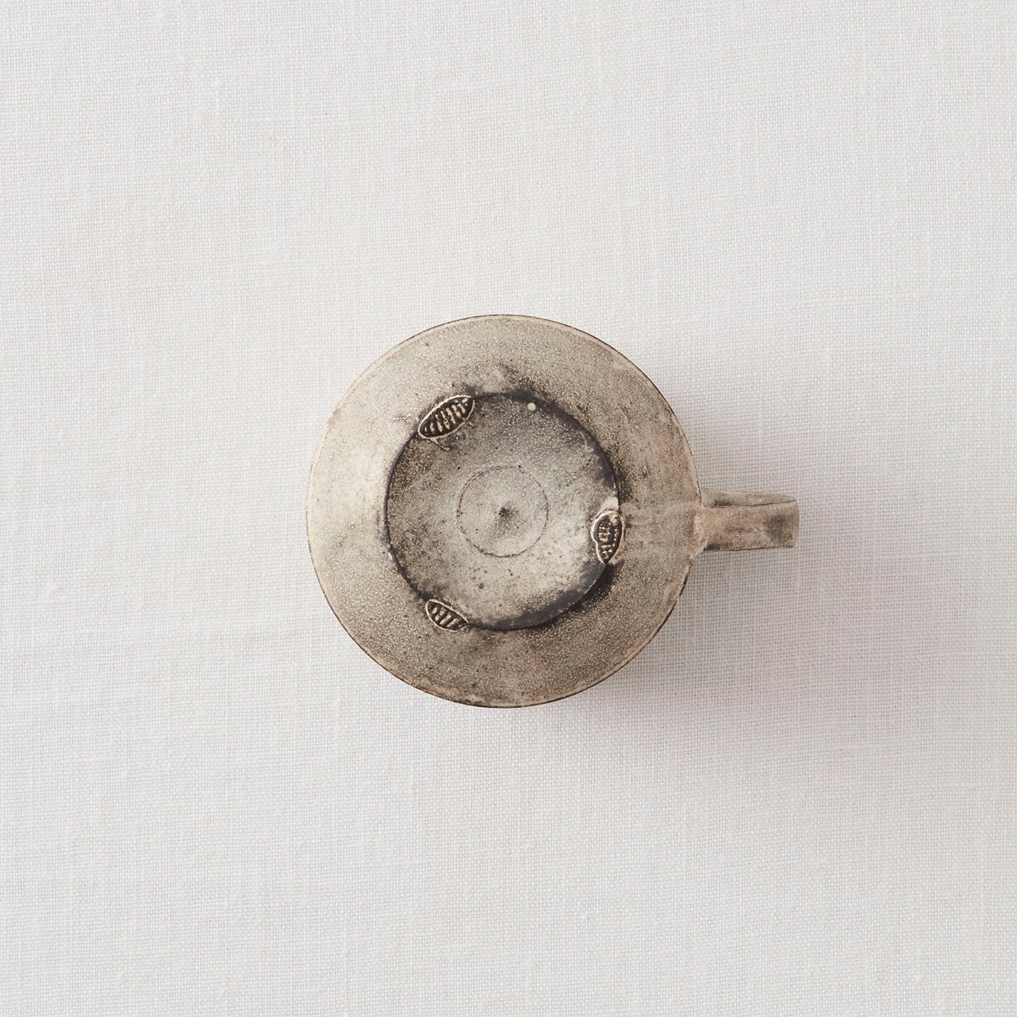 銀を焼き付けた「総銀彩」は、白みを帯びたシルバーの輝きを放っています。当たる光によっては黒っぽく見えたり、周りに置いたものがぼんやりと映り込んだりと、さまざまな表情を見せてくれます。