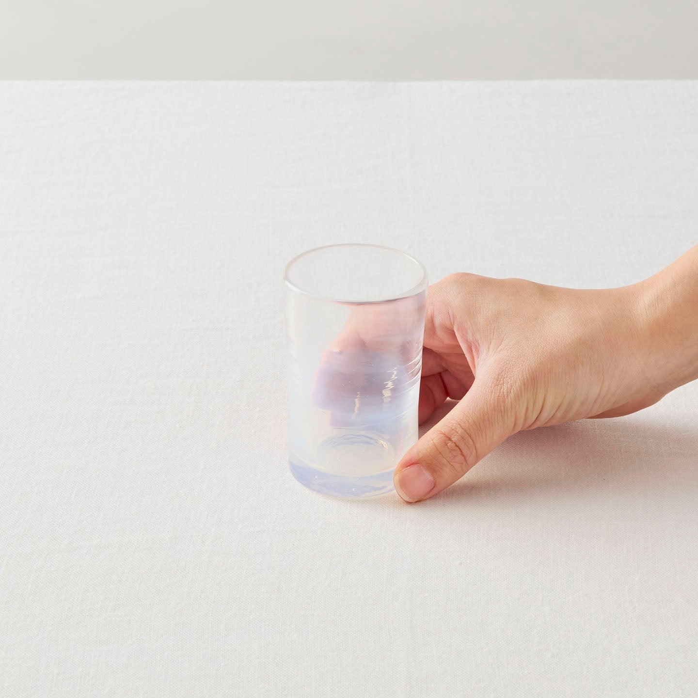 高さ7.5cmほどのストンとしたシルエットの「筒コップ」。波打つ模様や横筋は、手吹きガラスならではの味わいです。光を通すと、テーブルにゆらめく影が落ち、その美しさに思わず見入ってしまいます。