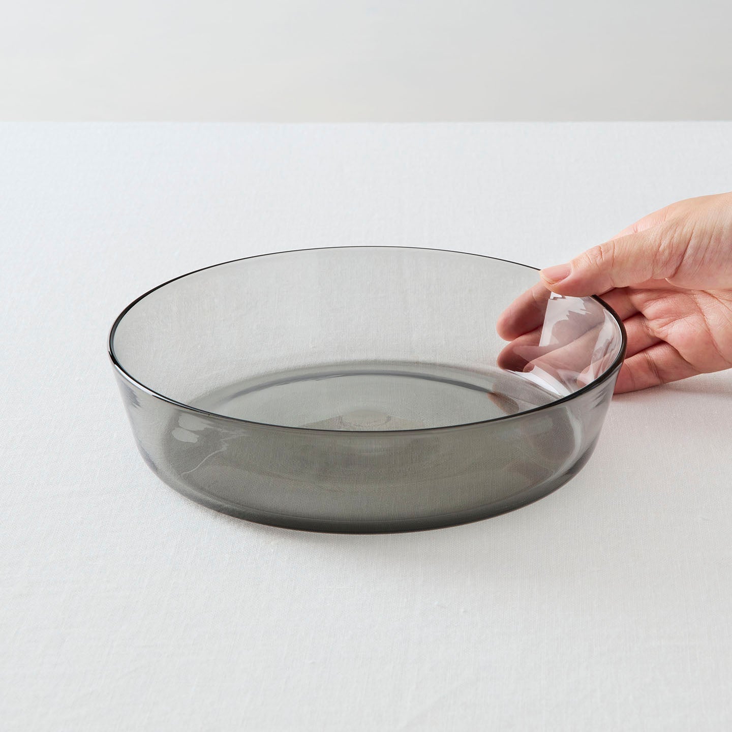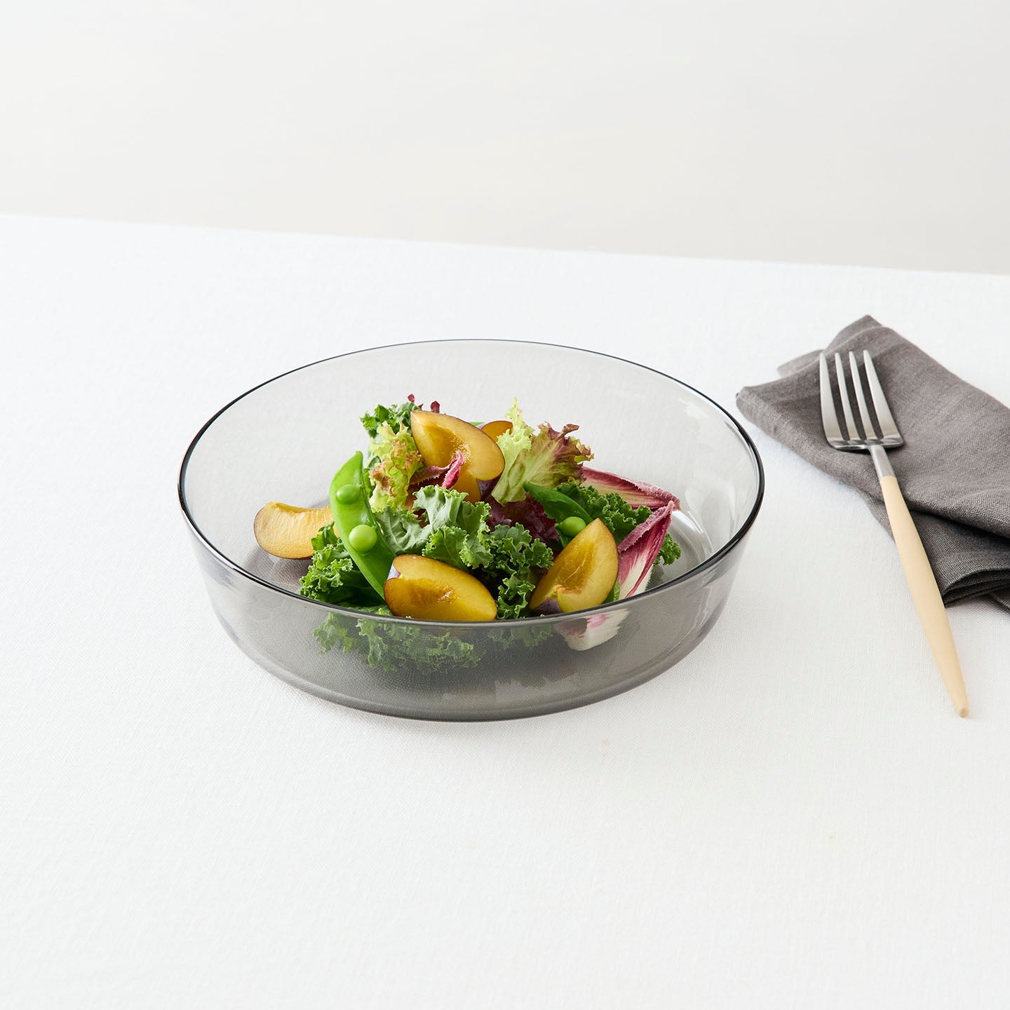 ガラスのプレートと聞くと、使いにくい印象を持つ方もいるかもしれません。でも、料理や果物を盛りつけたときに初めてわかるのが、この器の包容力。たとえば、桃や無花果、紫蘇を添えたサラダなど、瑞々しい食材をのせれば、器がすっと背景になり、素材の輪郭を美しく引き立ててくれます。
