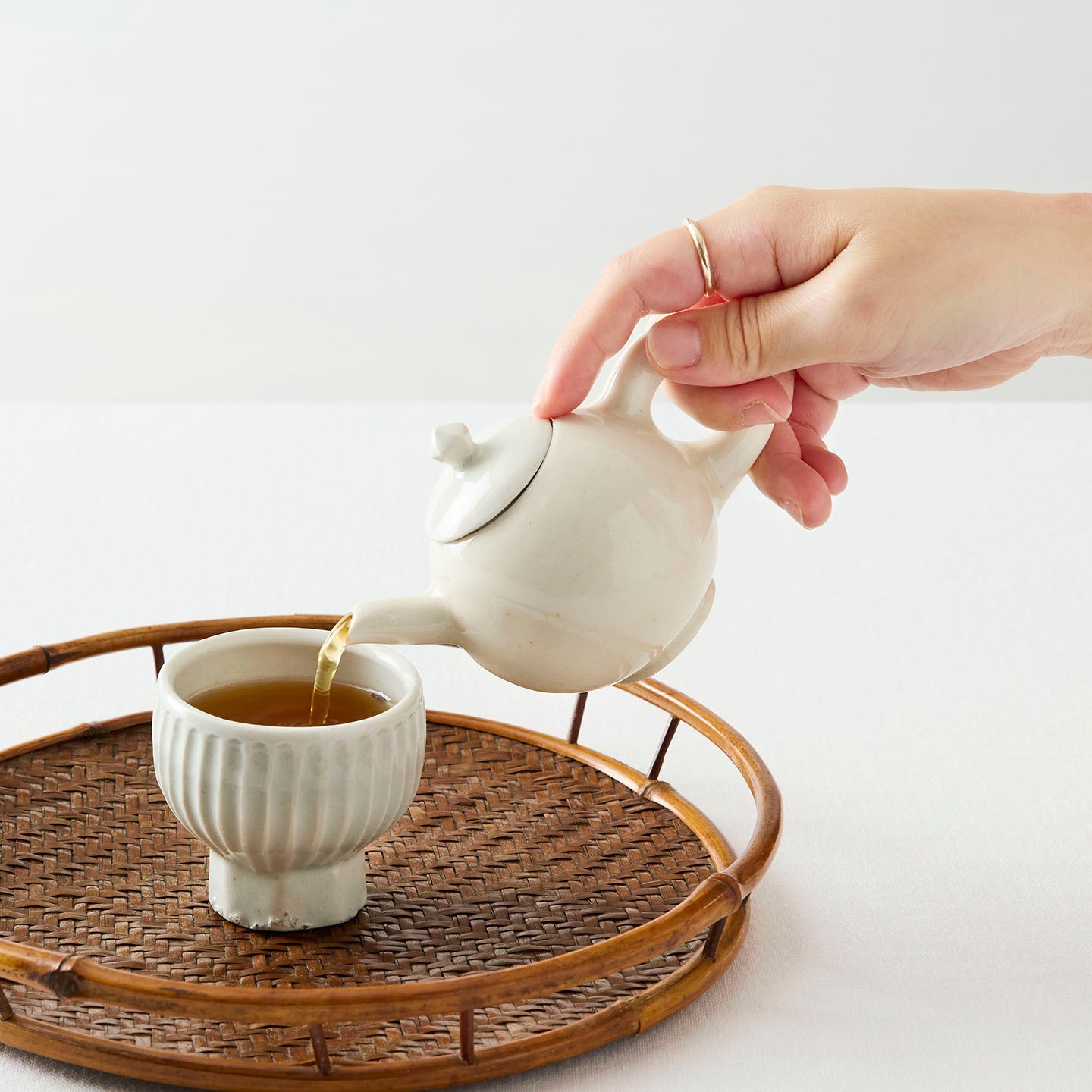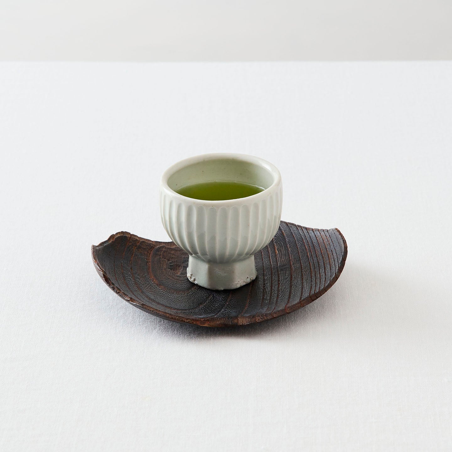 静けさと、深いぬくもりが宿るタナカさんの器たち。このたび、煎茶堂東京でお取り扱いが始まります。今回は「白瓷高台面取鎬盃(約60ml)」をご紹介します。