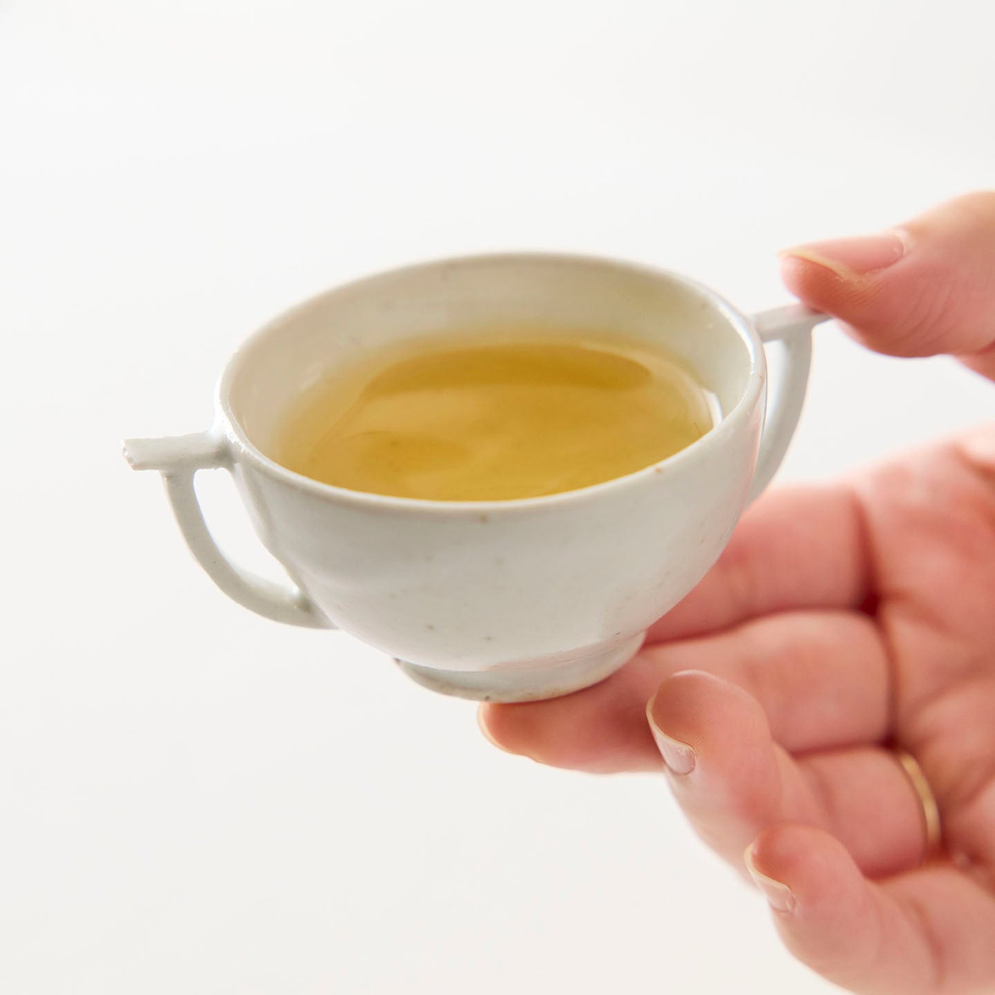 静けさと、深いぬくもりが宿るタナカさんの器たち。このたび、煎茶堂東京でお取り扱いが始まります。今回は「白瓷耳坏(約20ml)」をご紹介します。