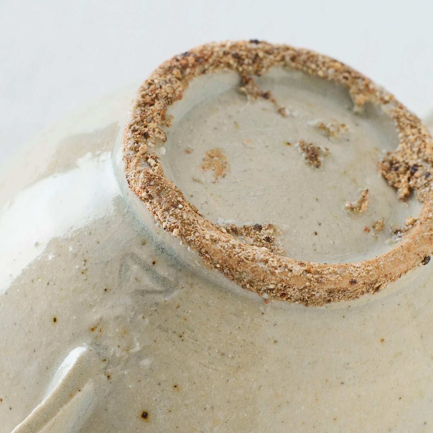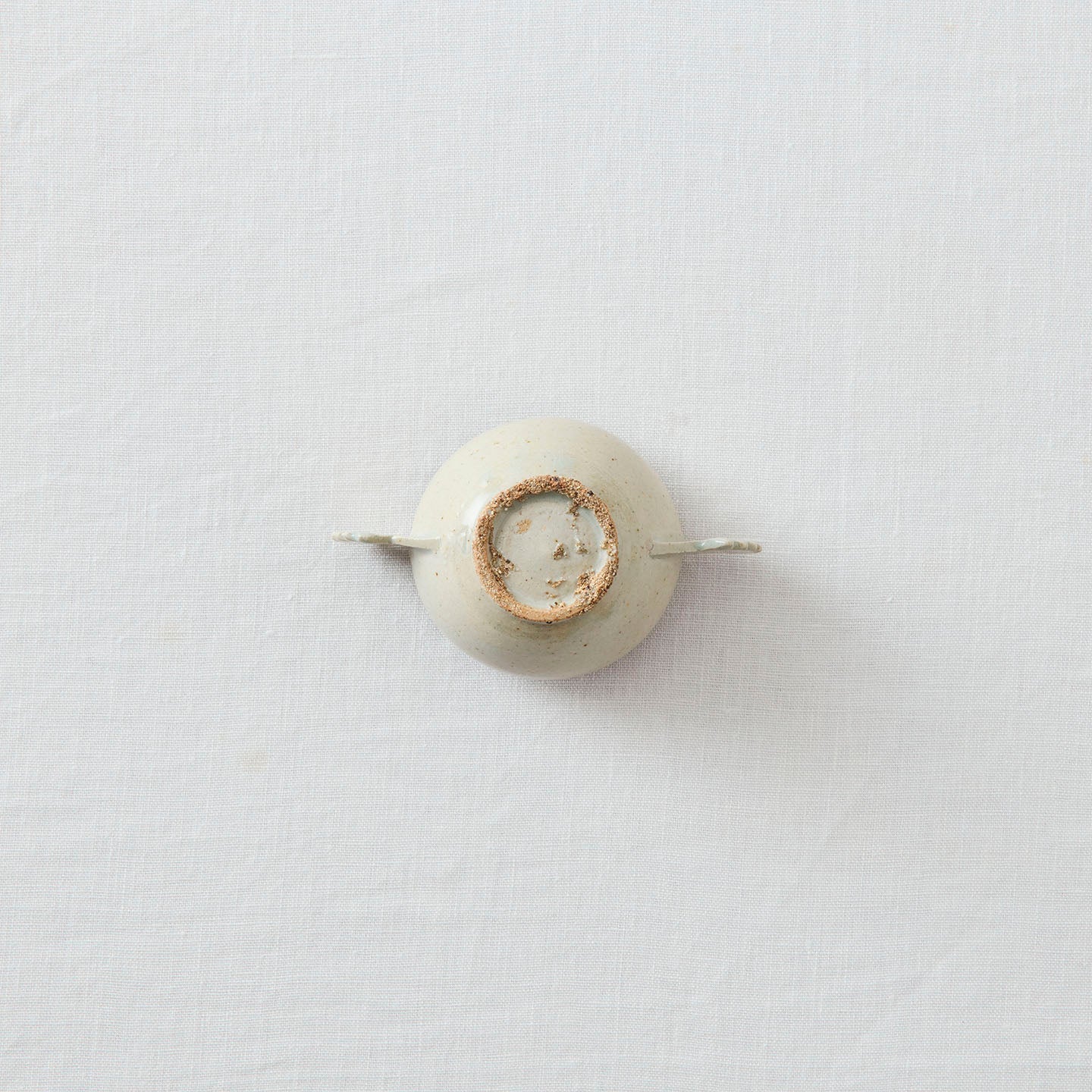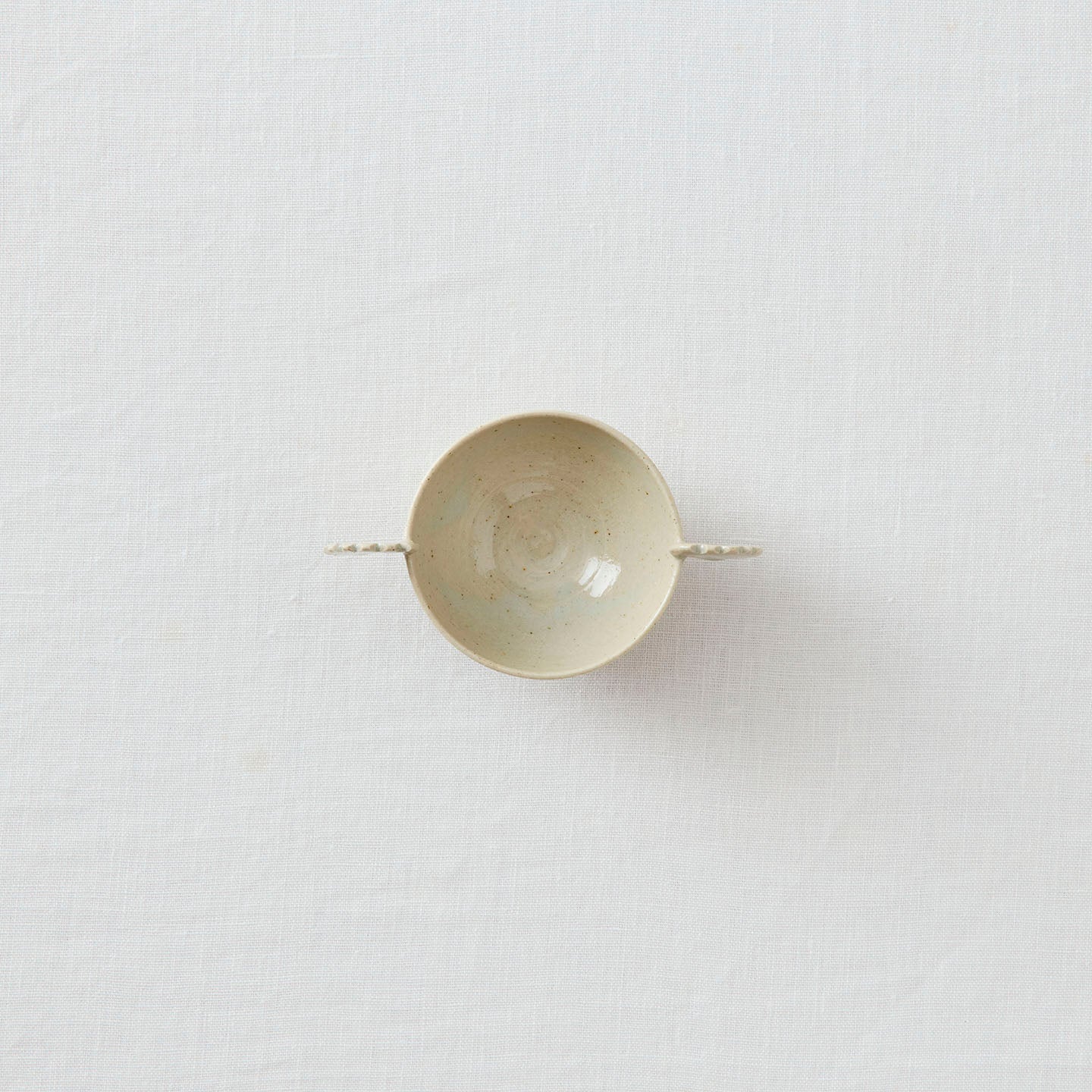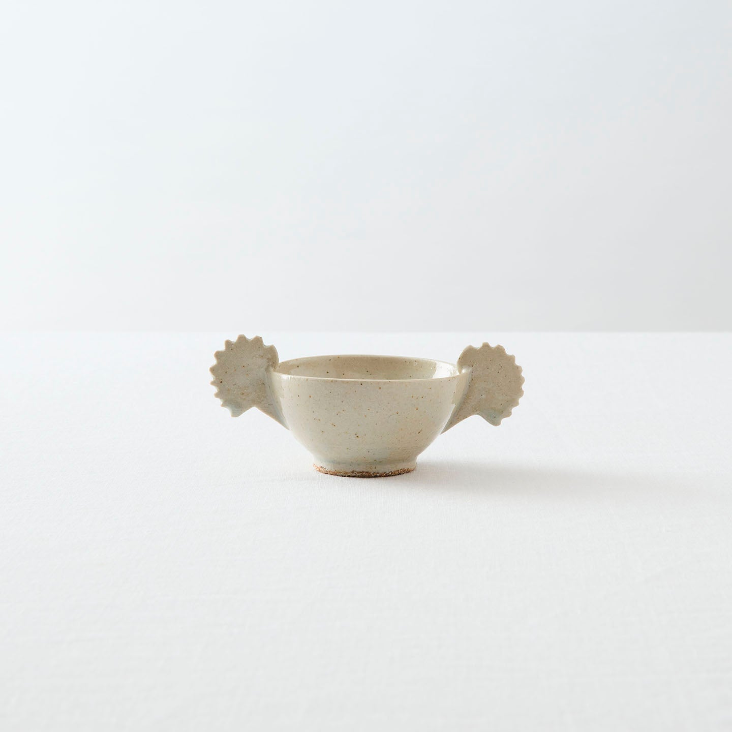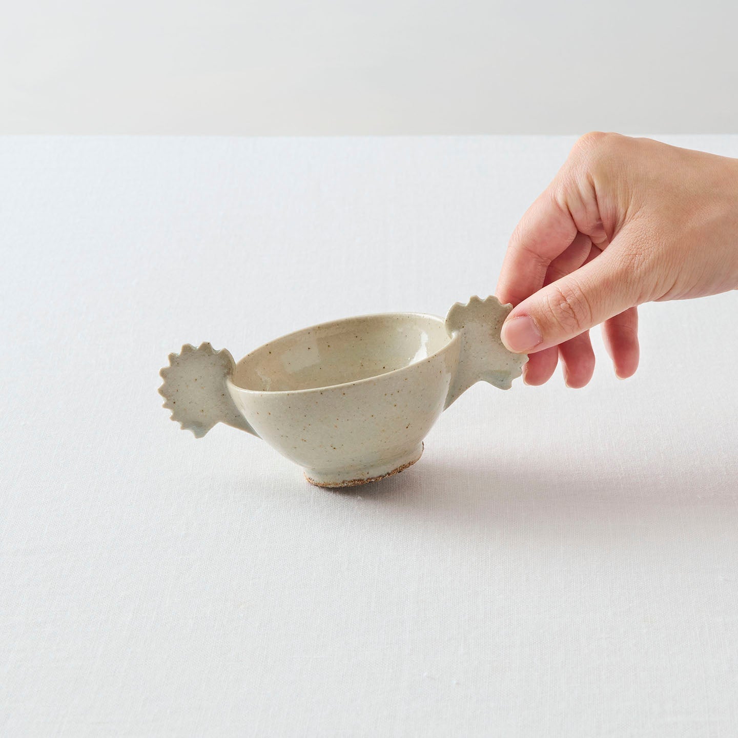 やや灰色みを帯びた、砂混じりの釉薬が生み出す景色。「堅手耳盃(約60ml)」は朝鮮の李朝時代の陶磁器をモチーフにしています。