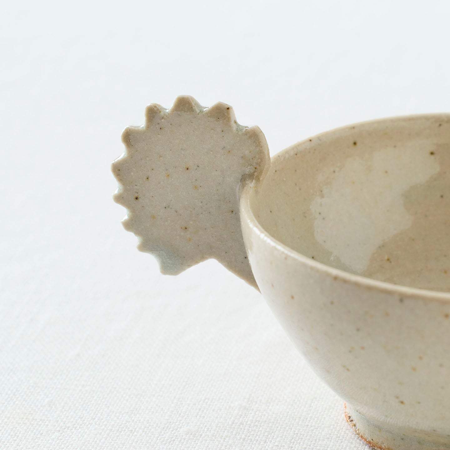 丸みを帯びた素朴なかたちに、ノコギリ状の耳(持ち手)がそっと添えられ、持ちやすさと装飾性の両方をそなえた、小さな遊び心が感じられるつくり。
