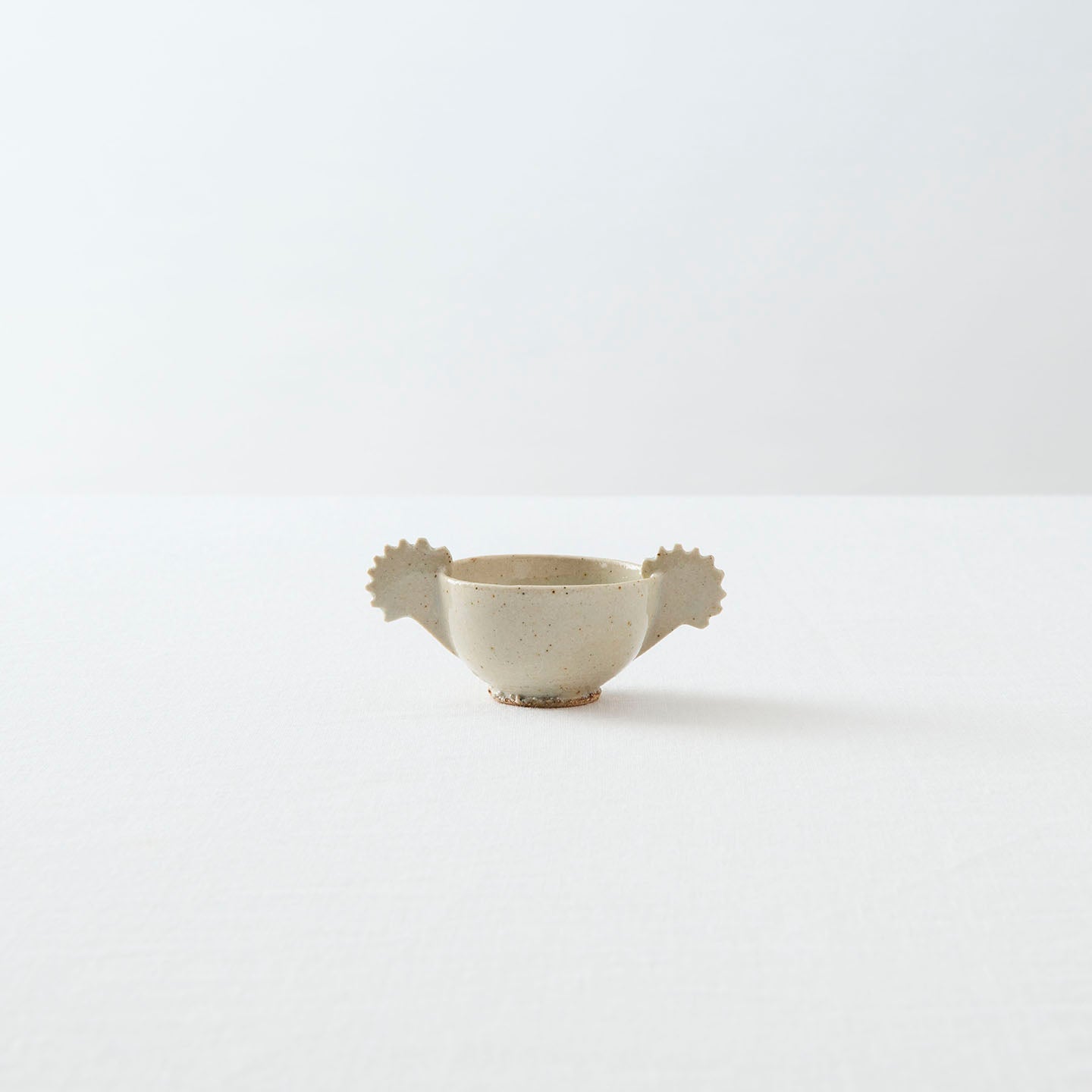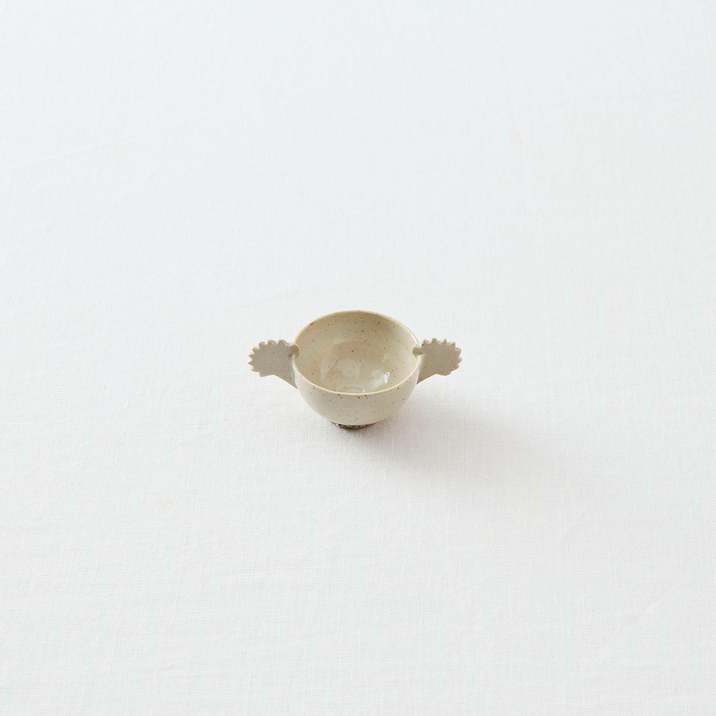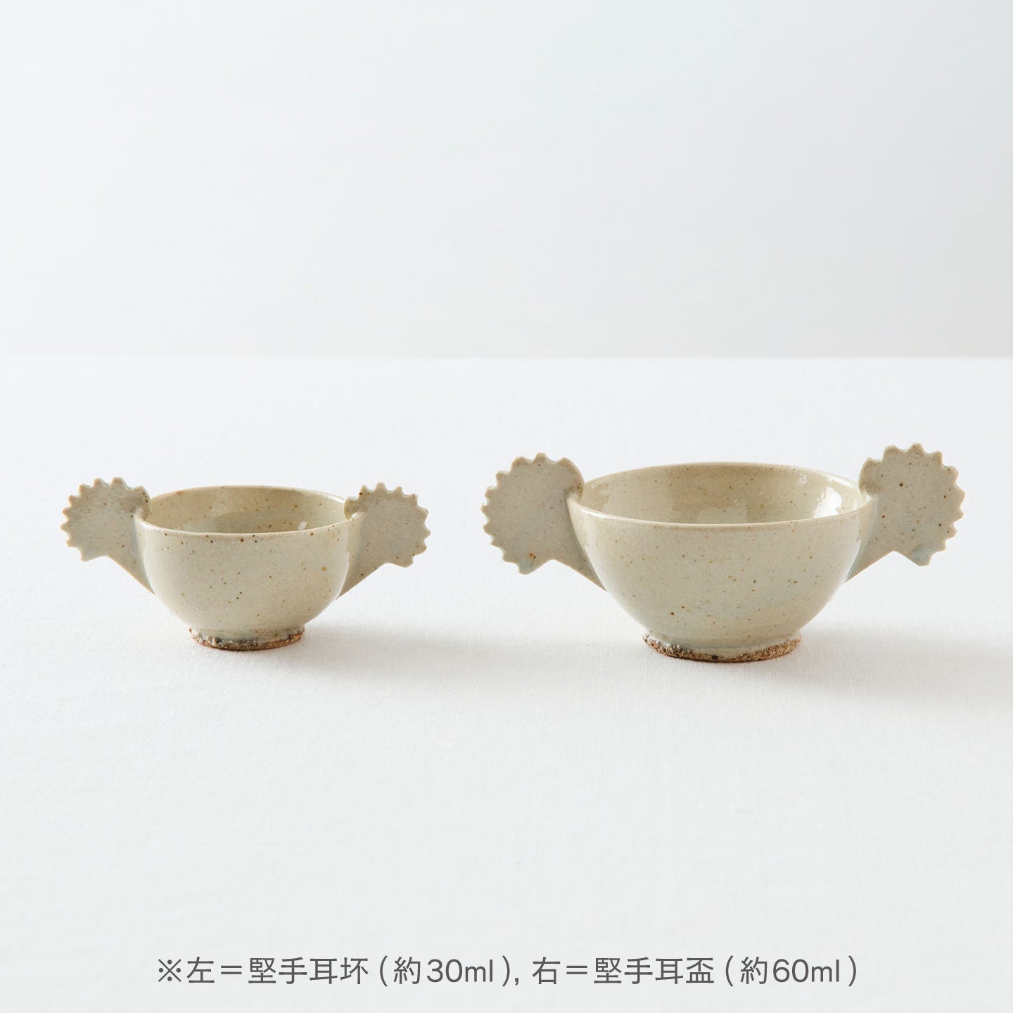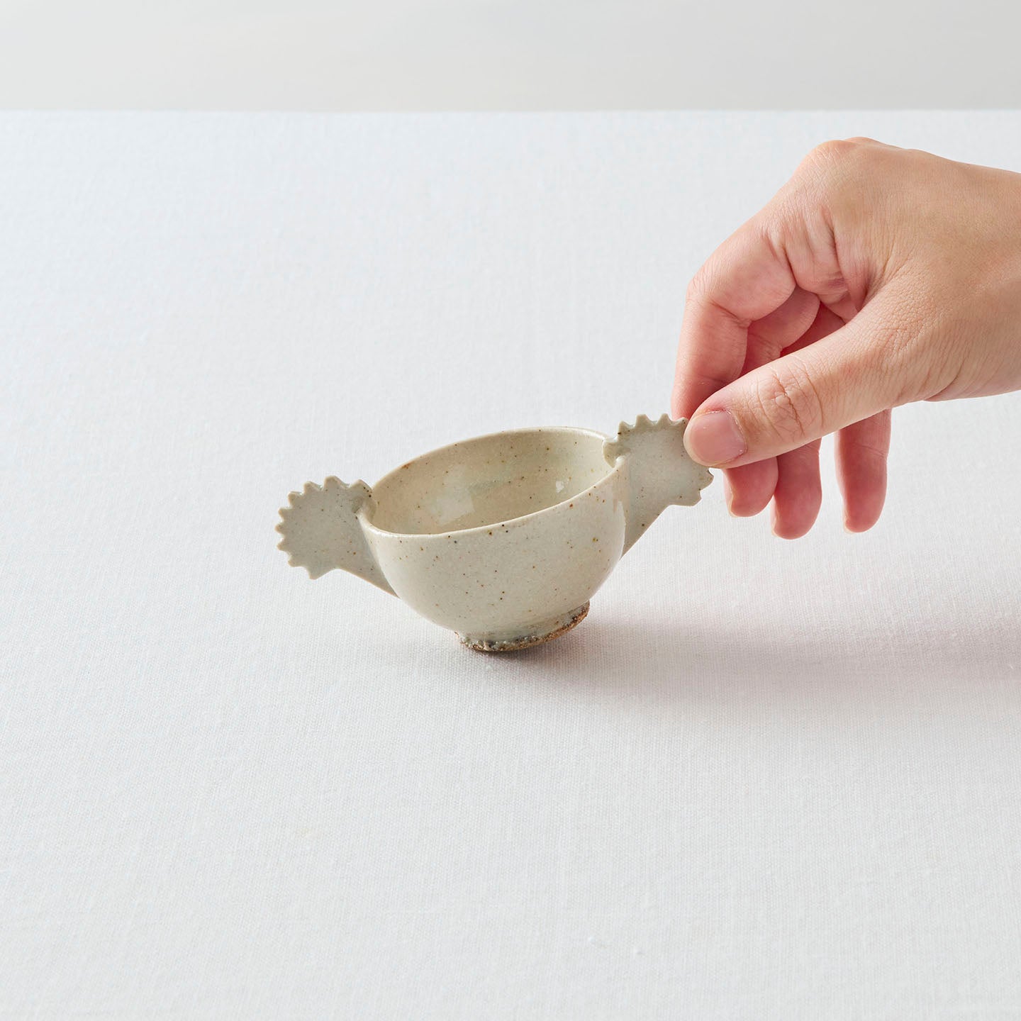 やや灰色みを帯びた、砂混じりの釉薬が生み出す景色。「堅手耳坏(約30ml)」は朝鮮の李朝時代の陶磁器をモチーフにしています。