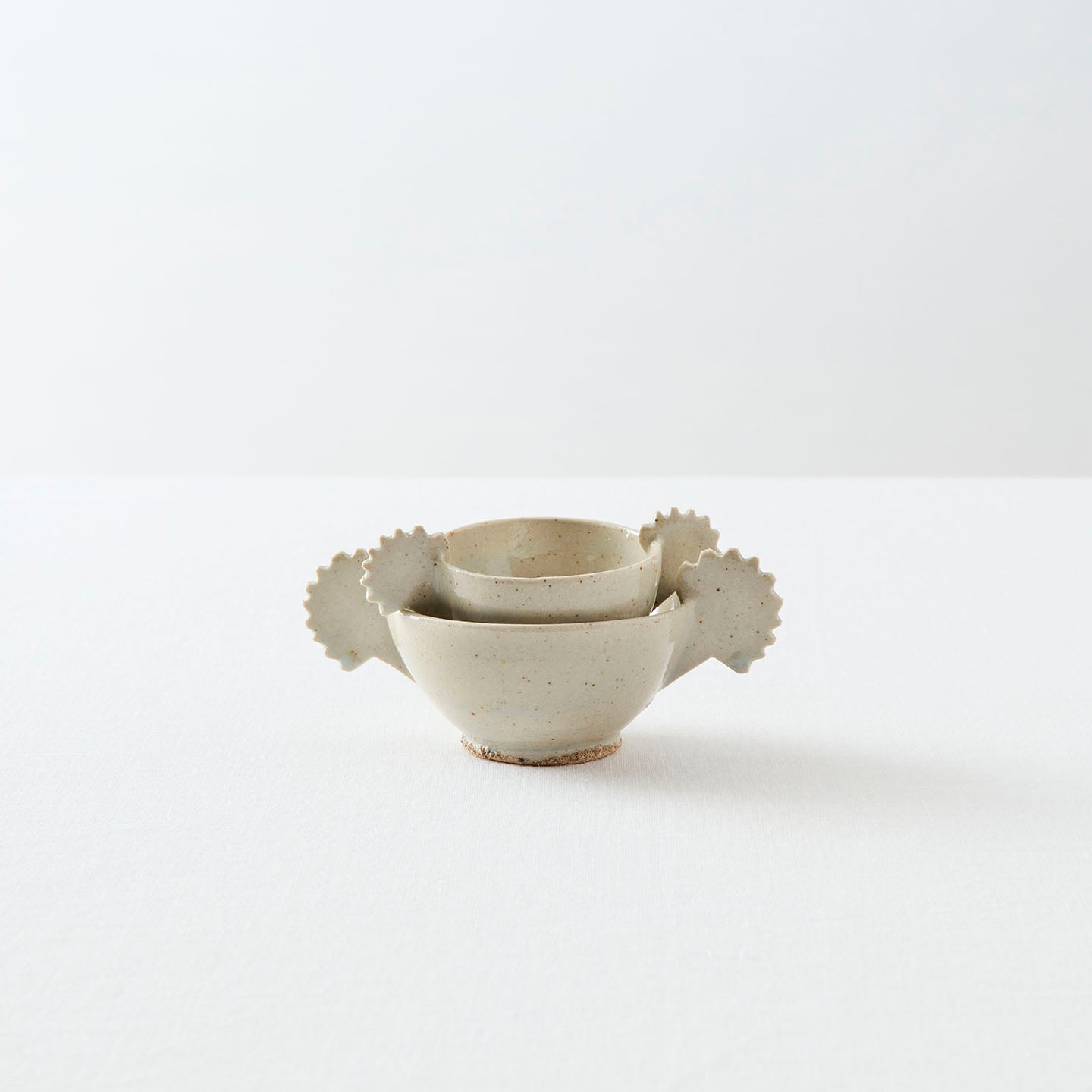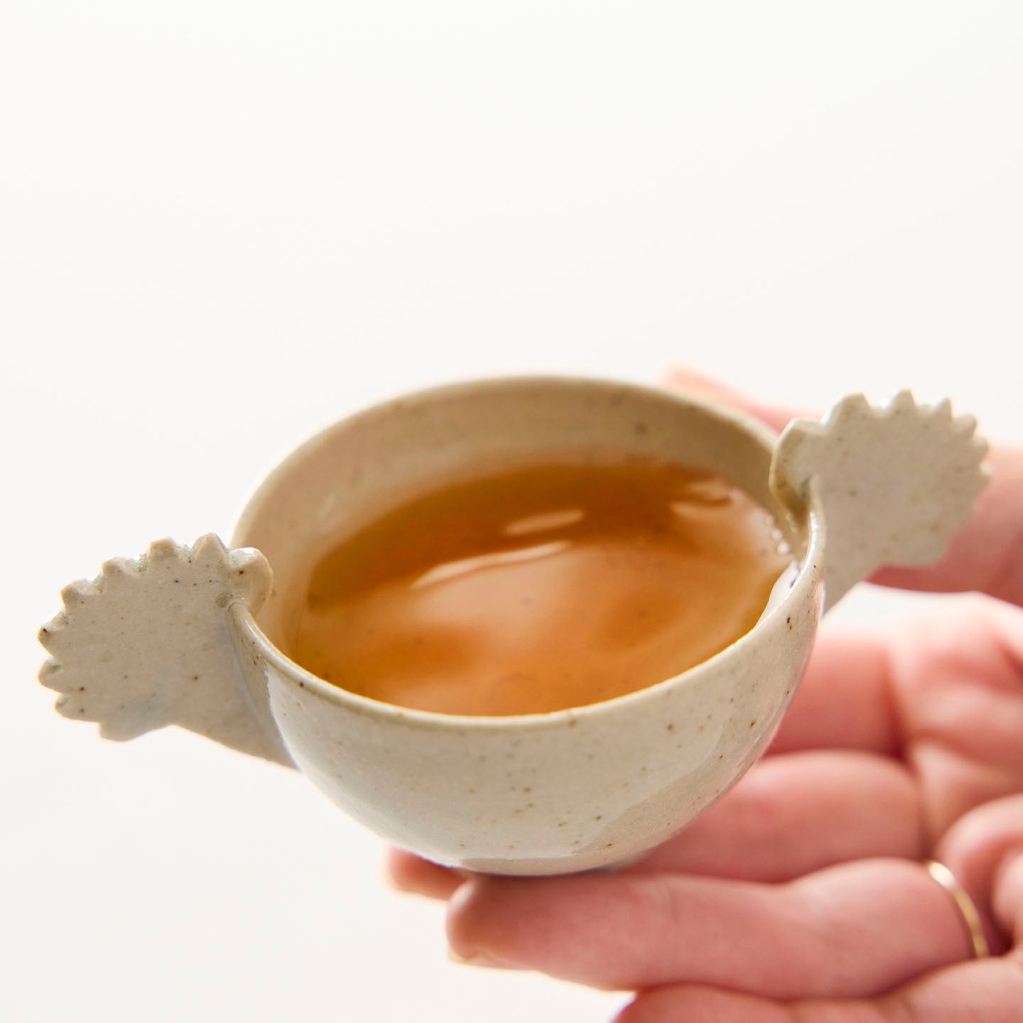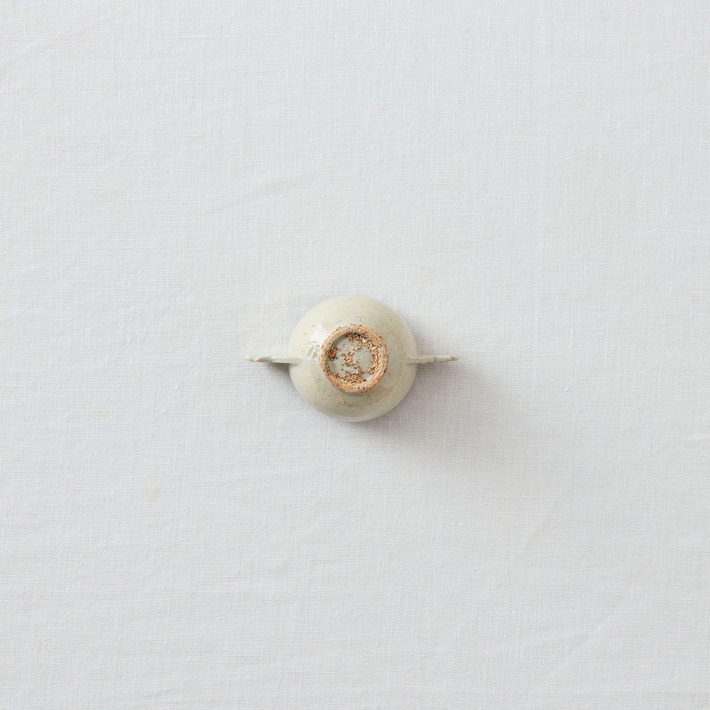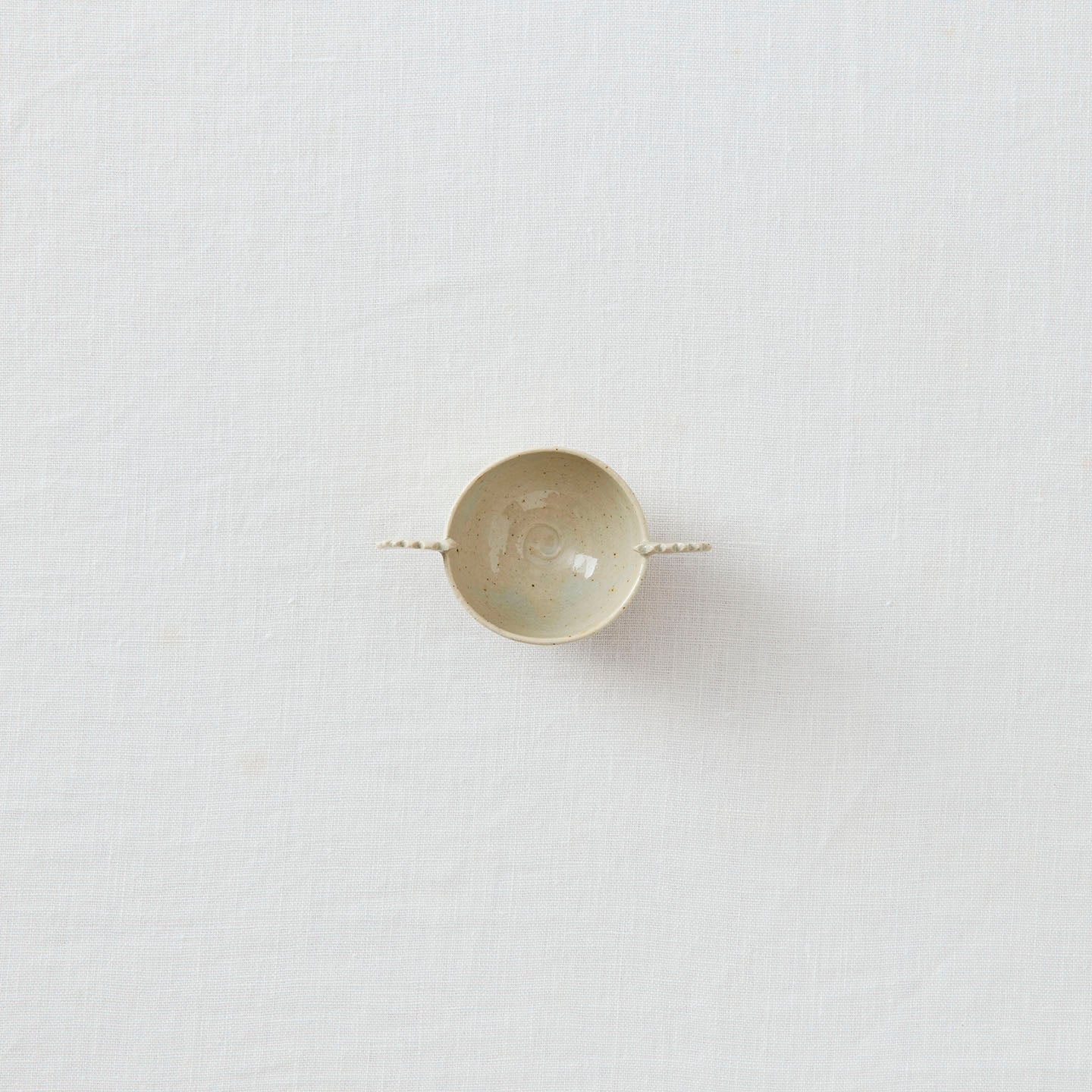 やや灰色みを帯びた、砂混じりの釉薬が生み出す景色。「堅手耳坏(約30ml)」は朝鮮の李朝時代の陶磁器をモチーフにしています。