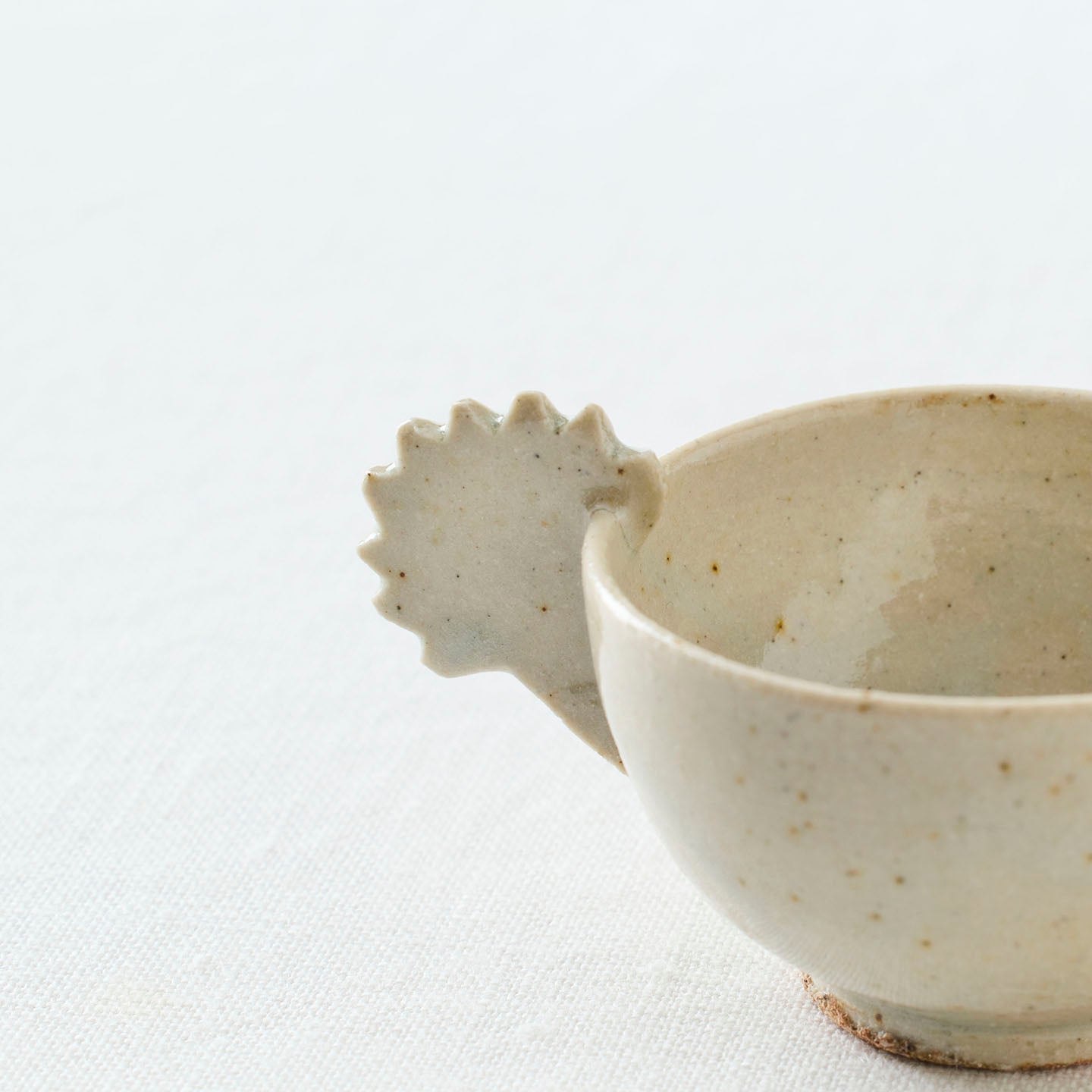 丸みを帯びた素朴なかたちに、ノコギリ状の耳(持ち手)がそっと添えられ、持ちやすさと装飾性の両方をそなえた、小さな遊び心が感じられるつくり。