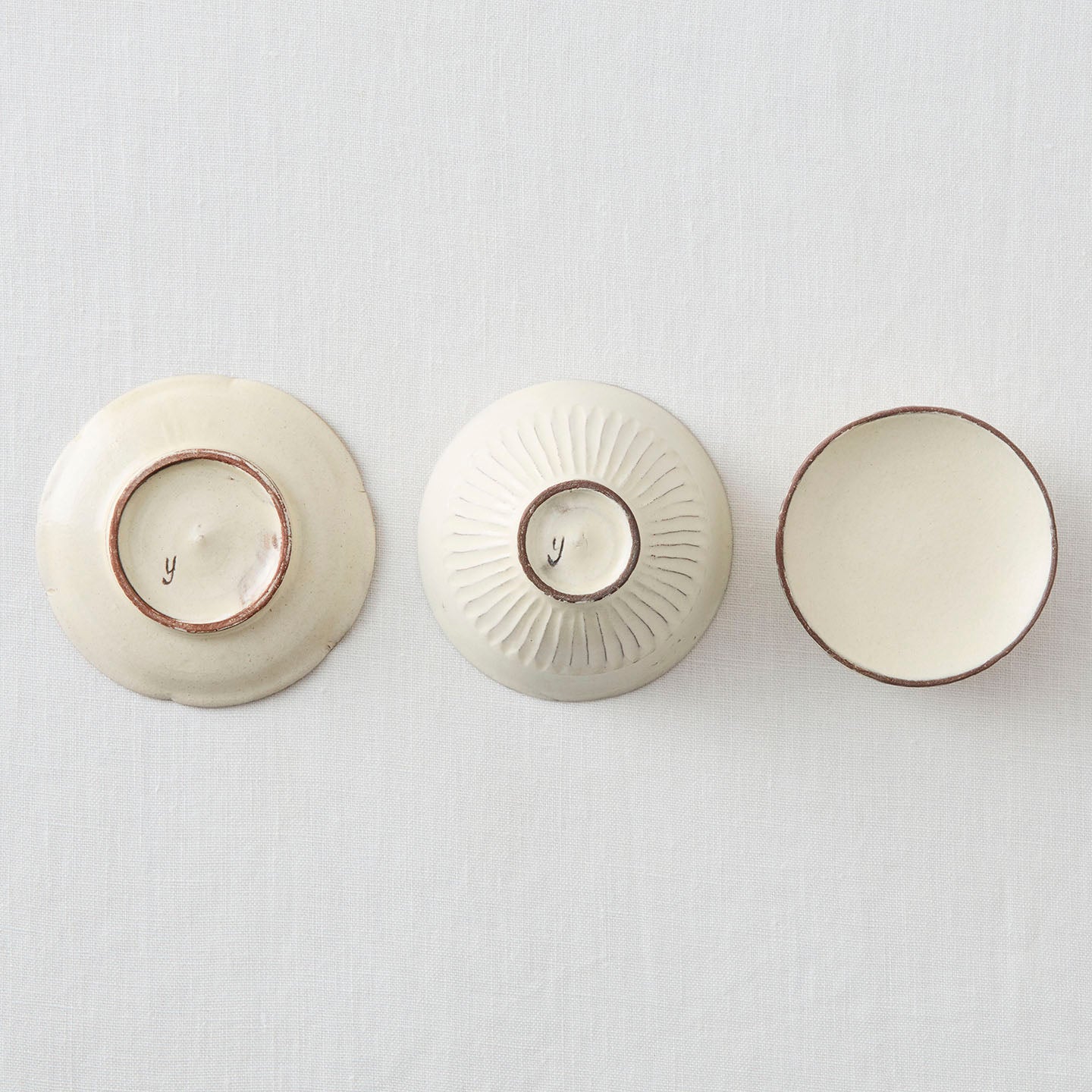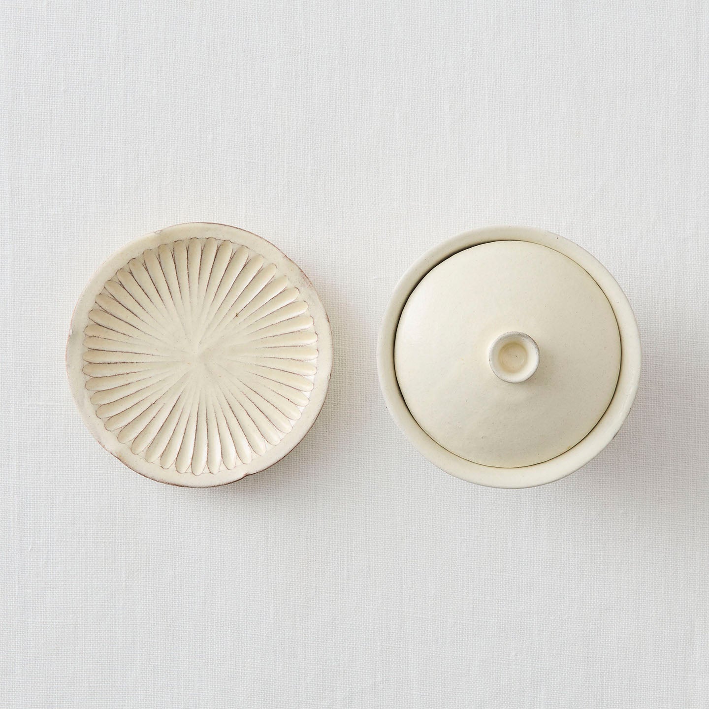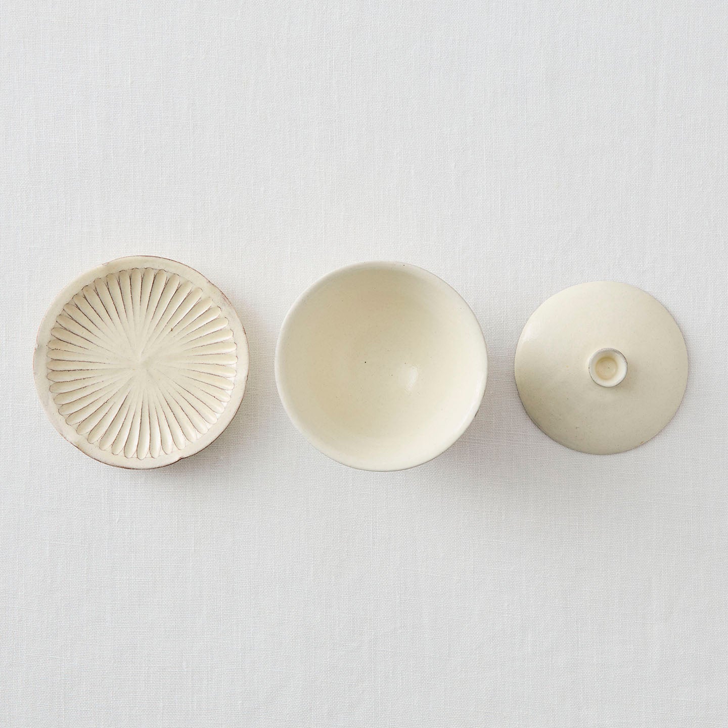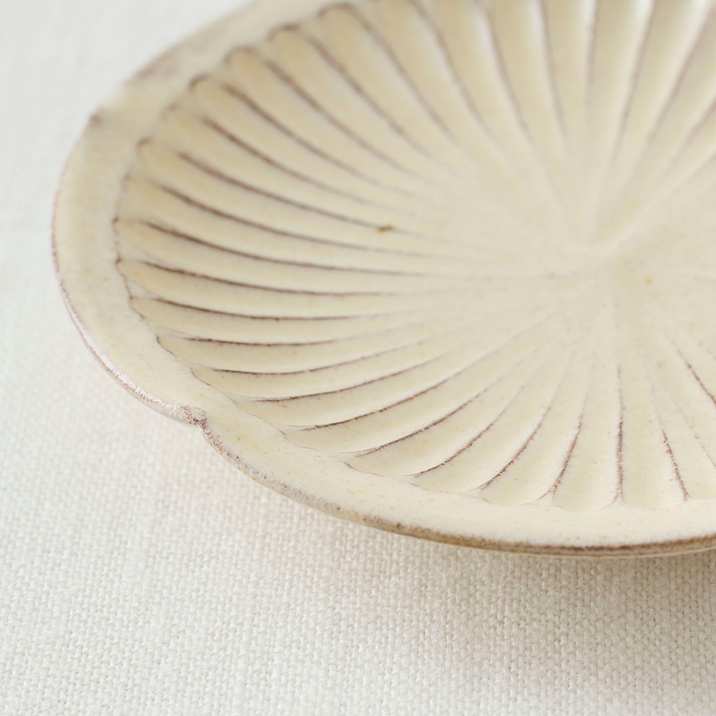 白い釉薬は柔らかい発色で、木のトレイや麻布のランチョンマットなど、素材を選ばず馴染みます。