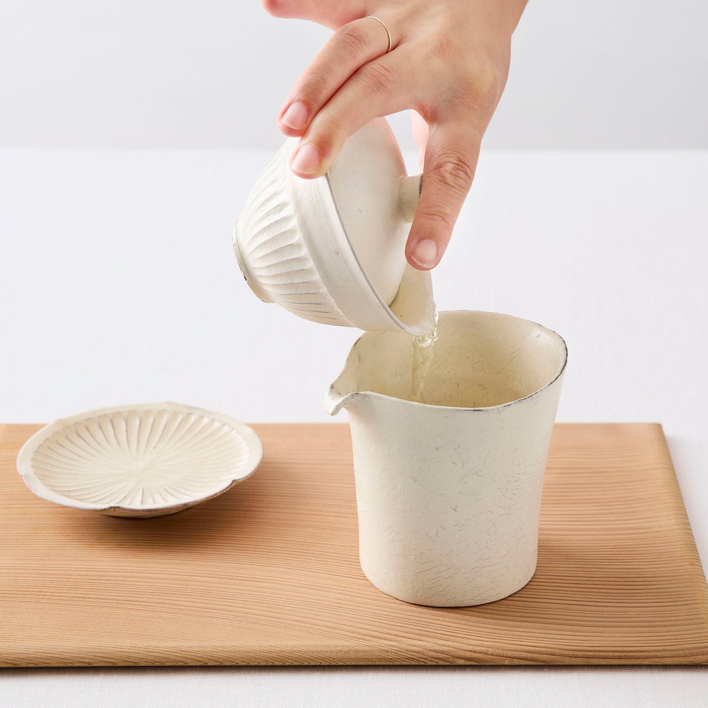 受け皿には三か所に小さな凹みがあり、持つと指先が自然にフィットします。意匠としての美しさと、道具としての使いやすさが同居する、後藤さんらしいバランス感覚が光ります。