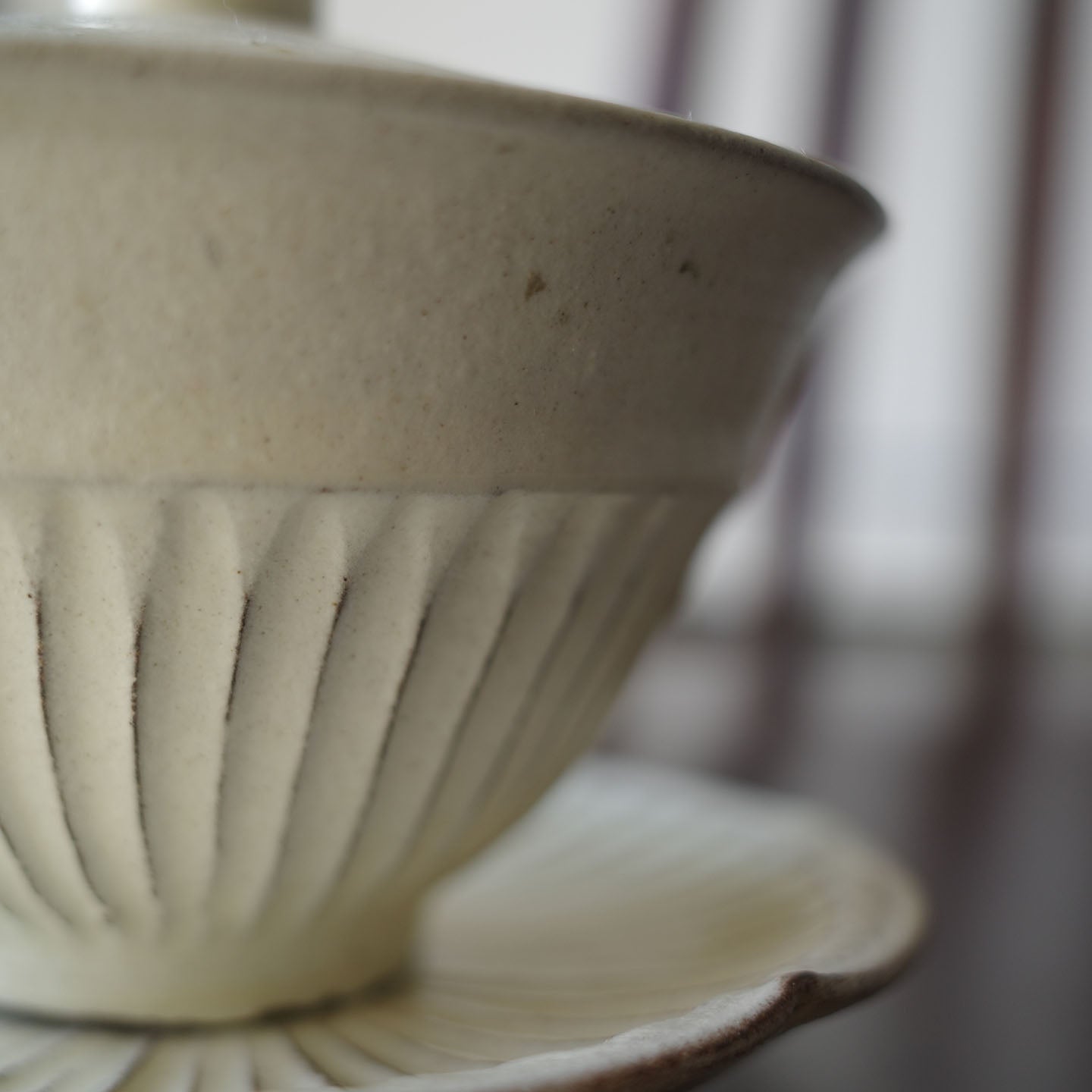 縞蓋碗は、蓋・碗・受け皿の三つが一体となったお茶の道具。横から見ると、鎬の縞模様が上下につながり、まるでひとつの花を思わせる伸びやかな造形が魅力です。