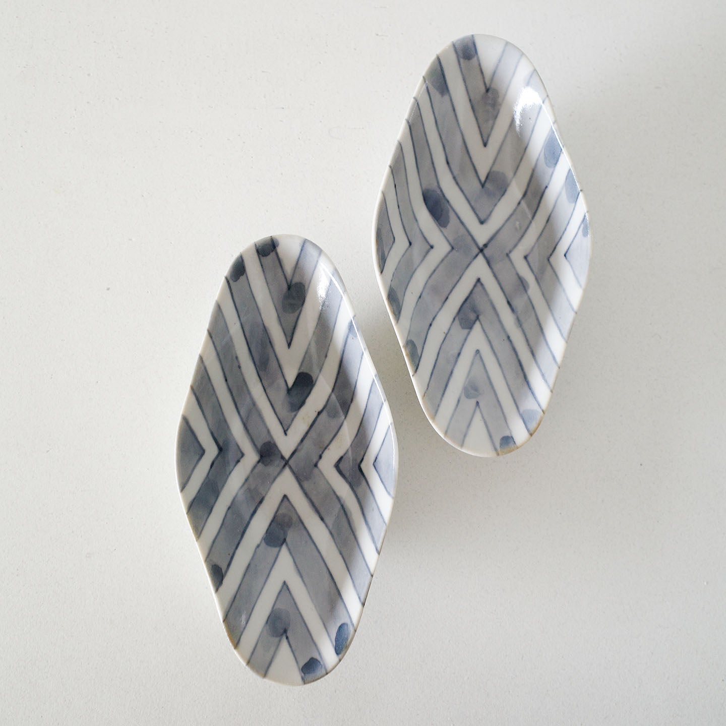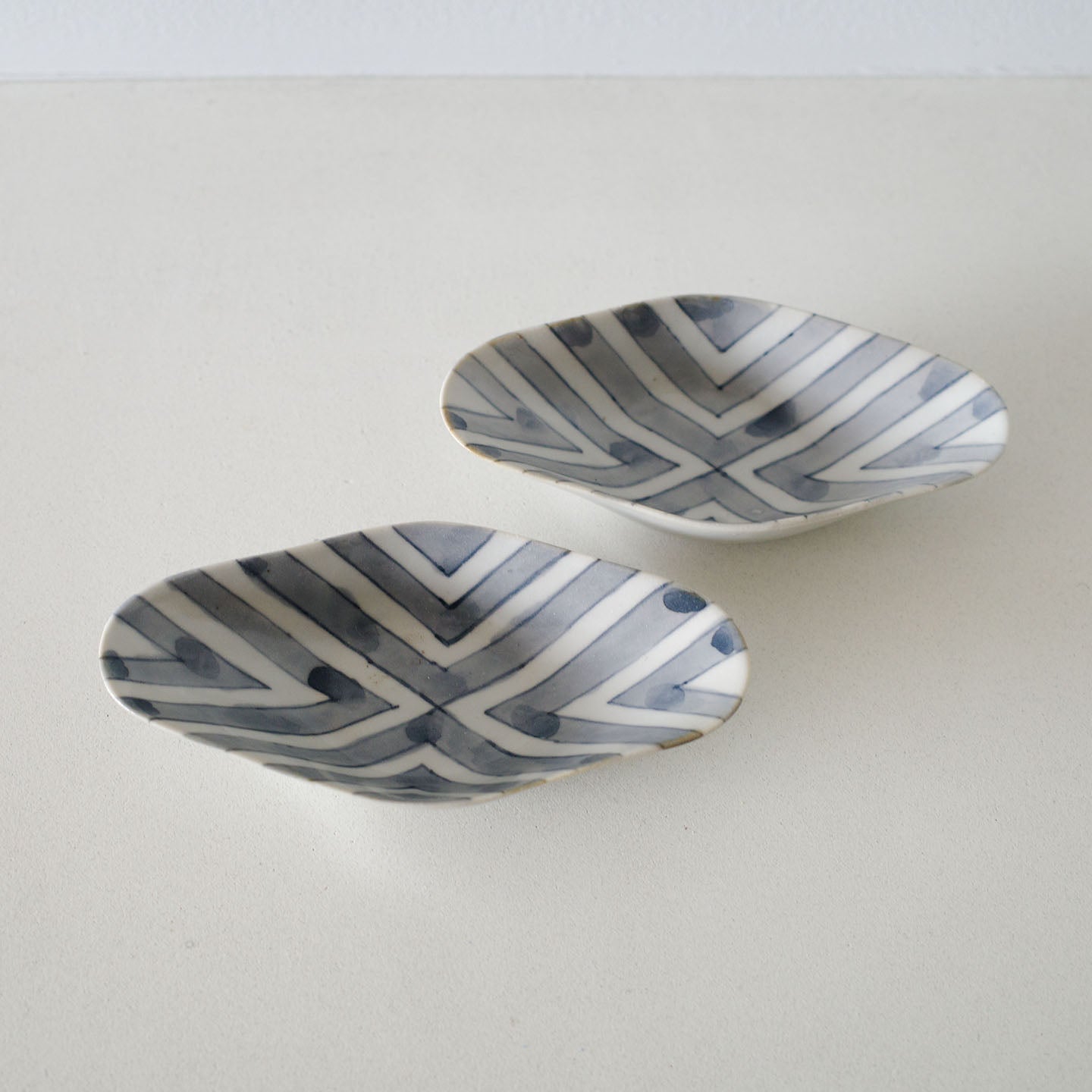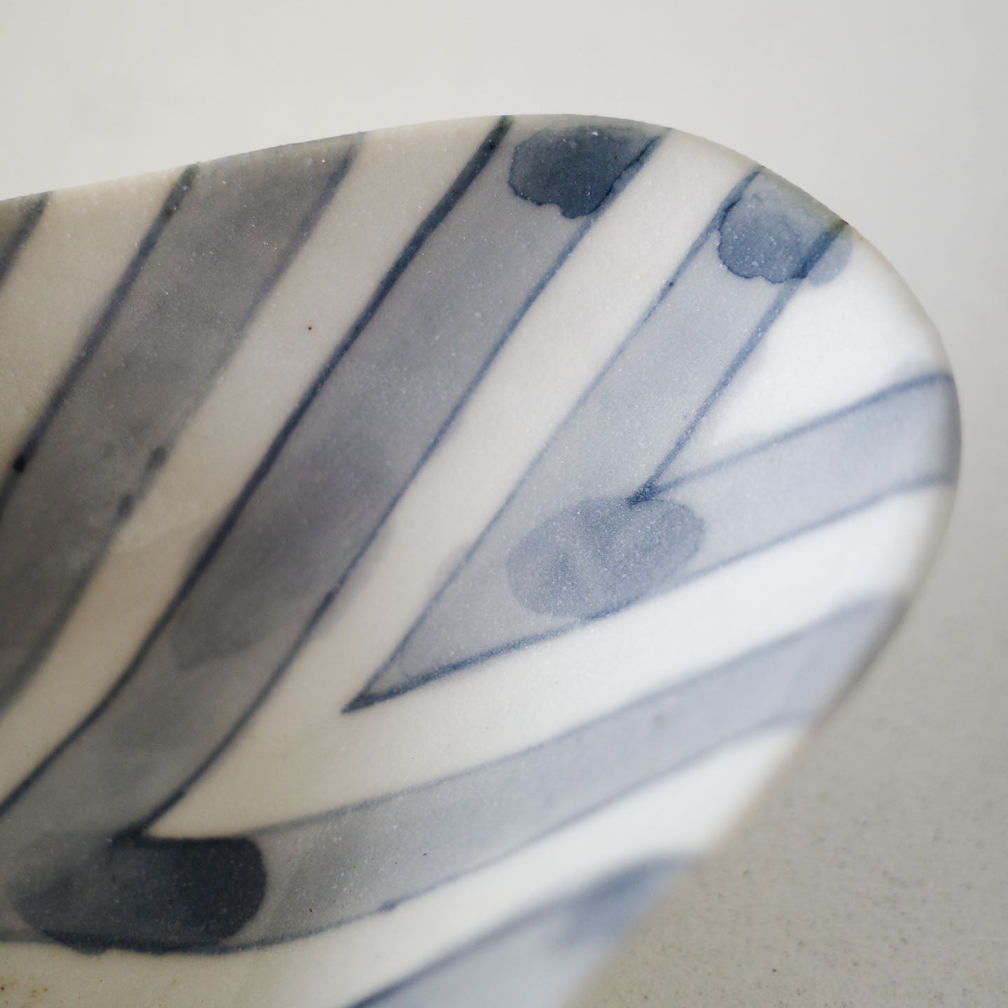 絵柄は、斜めの線が折り返しながら交差し、中央で“X”を描くような構成。きっちりとした幾何学のはずなのに、ところどころに見える染付のにじみが、温度を与えています。
