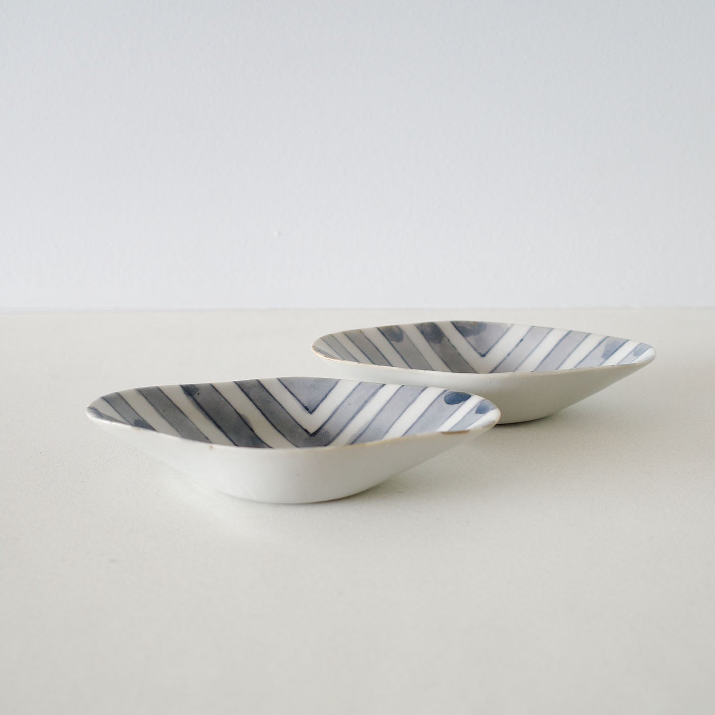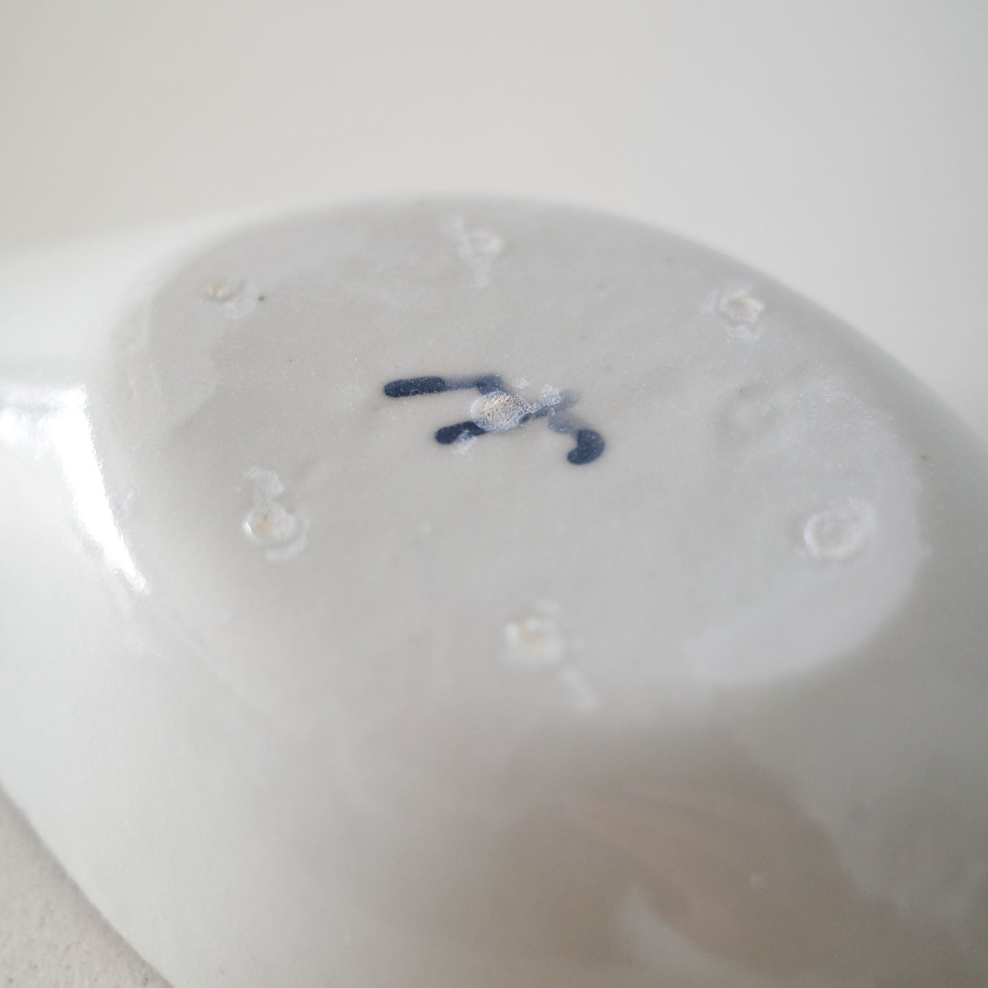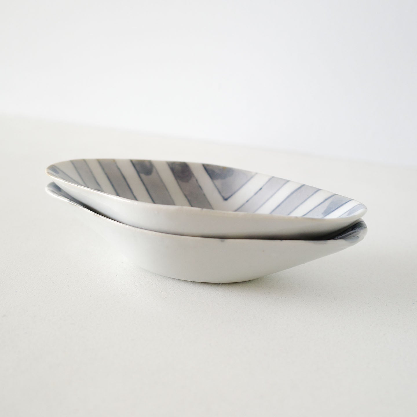 舟のように細長い輪郭。中央に向かってゆるやかにくぼみ、縁がすっと持ち上がるかたち。そこに、藍の線がリズムよく走り、淡いにじみが点在する。白と藍のコントラストは明快なのに、硬くならない。むしろ、光の当たり方で、絵付けの濃淡がすっとほどけていくように見えます。