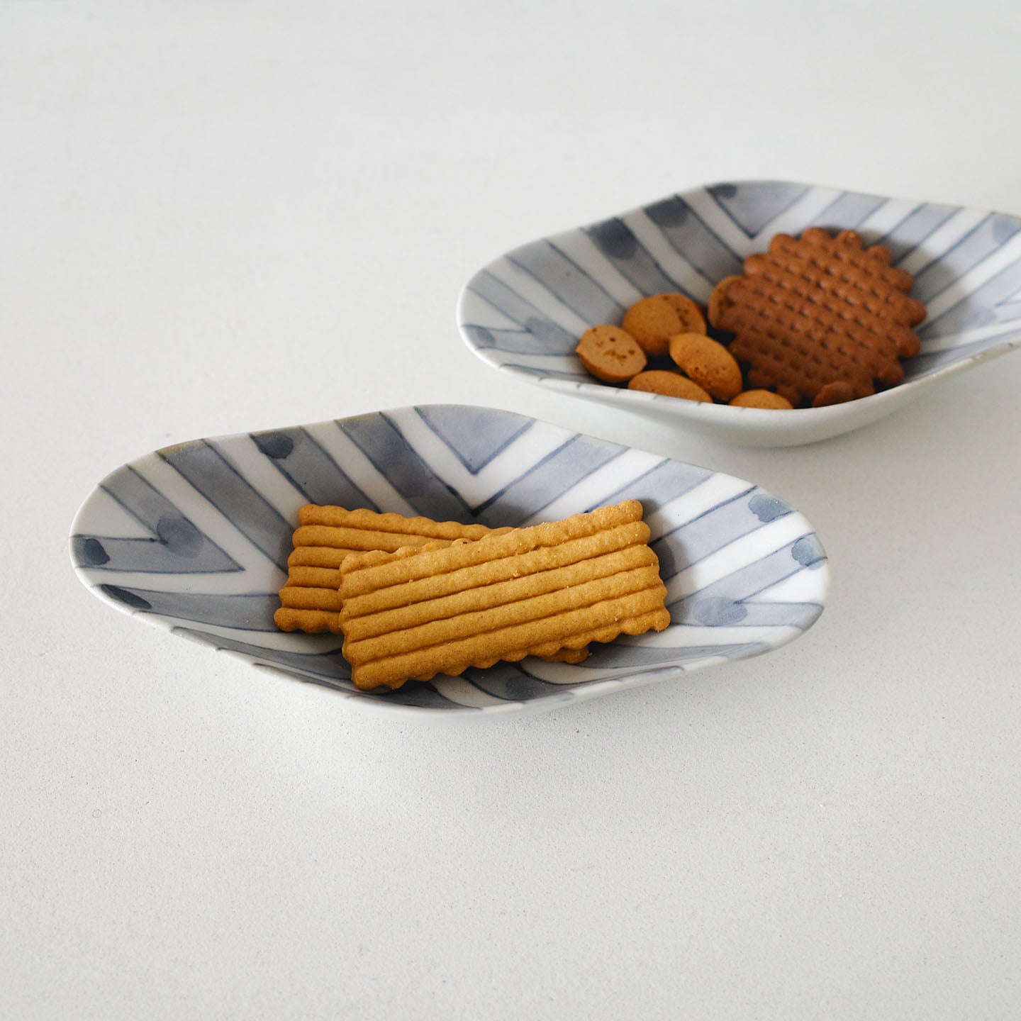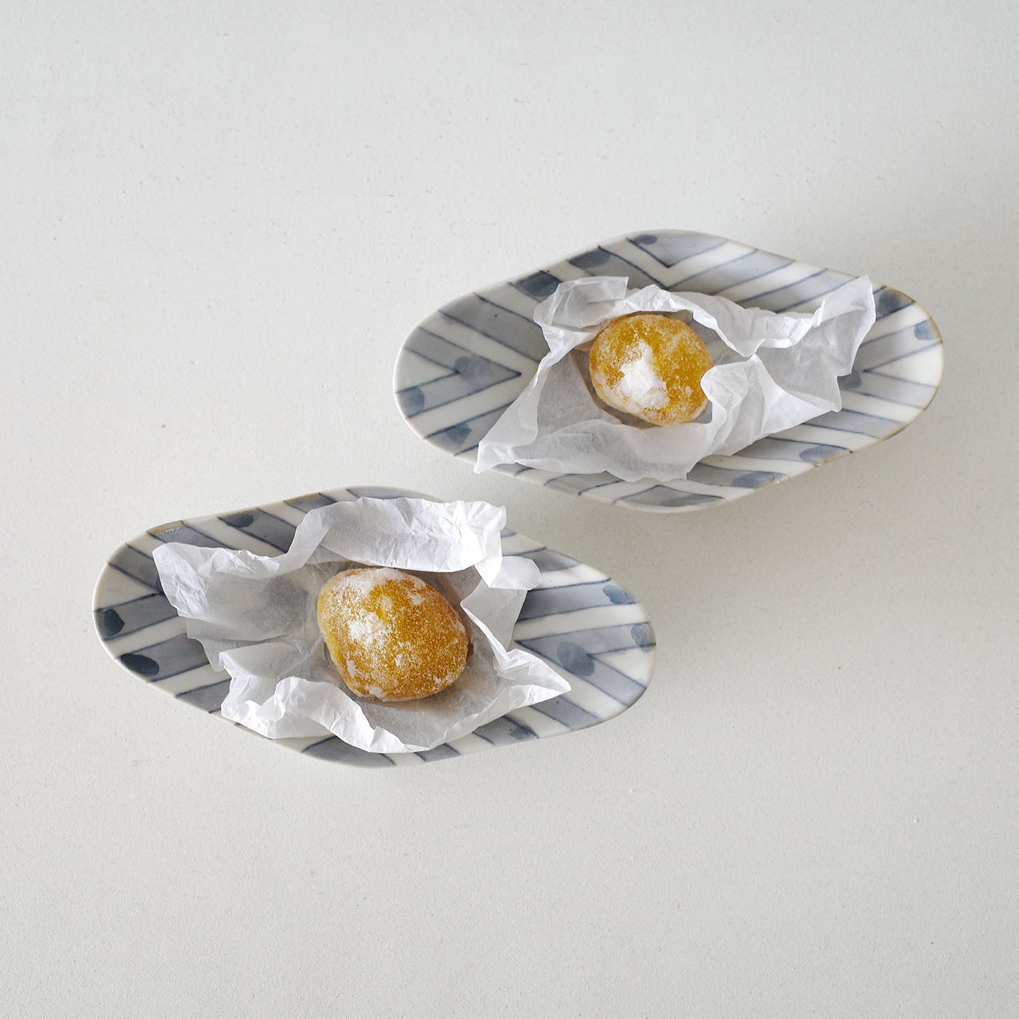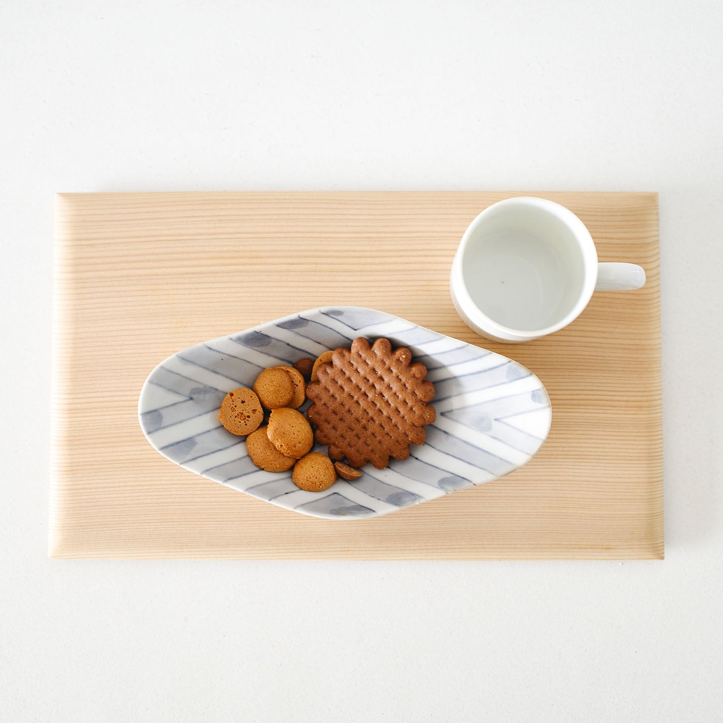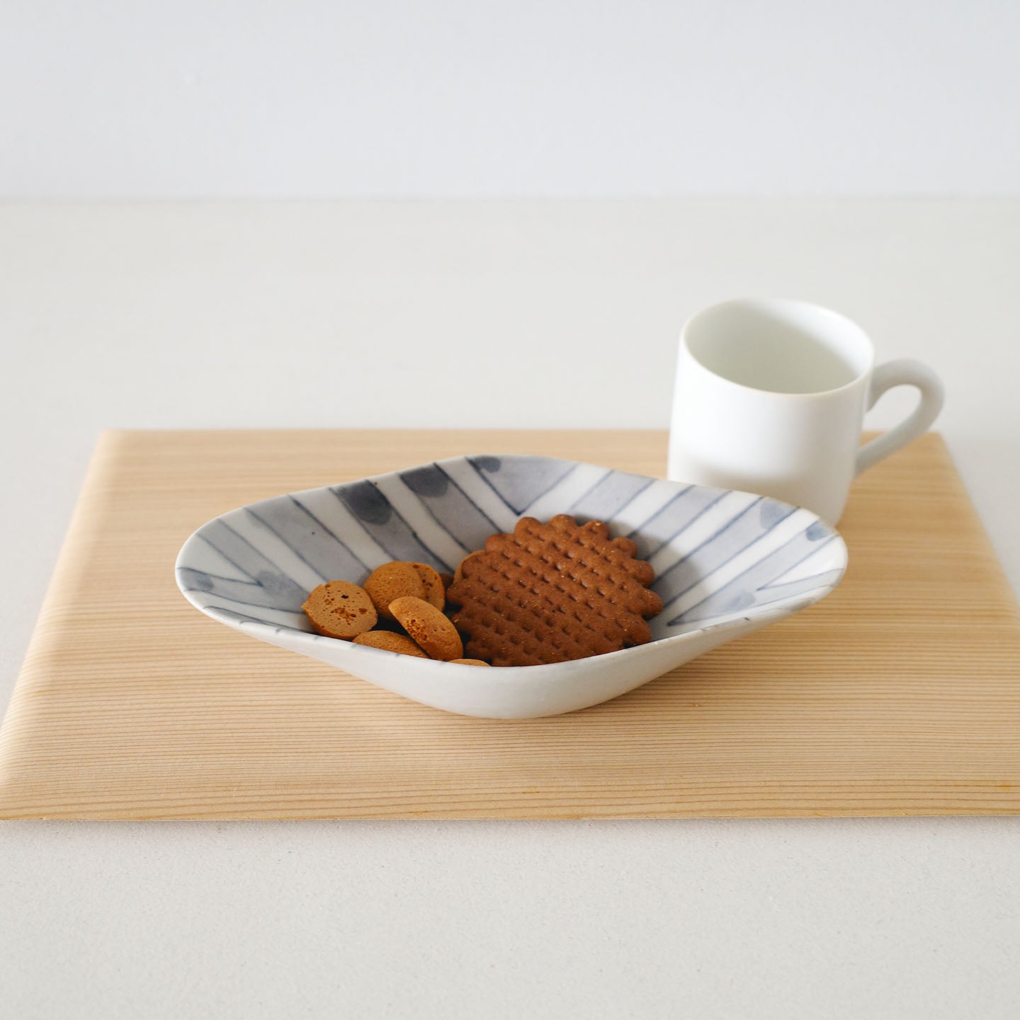 サブレやビスケットのような焼き菓子はもちろん、薄く切った羊羹や、ひと口の生菓子、干菓子にも。白磁の明るさが、砂糖の粒や粉の質感をきれいに拾ってくれます。