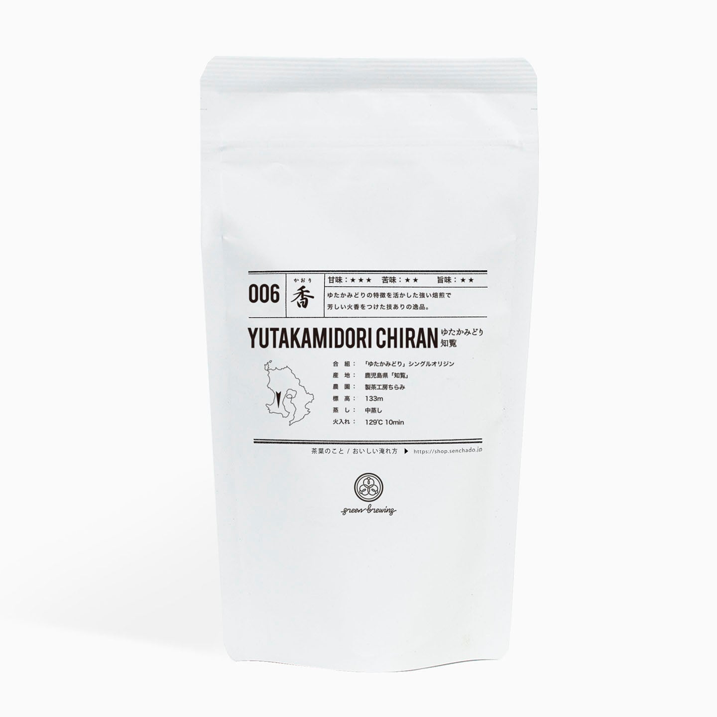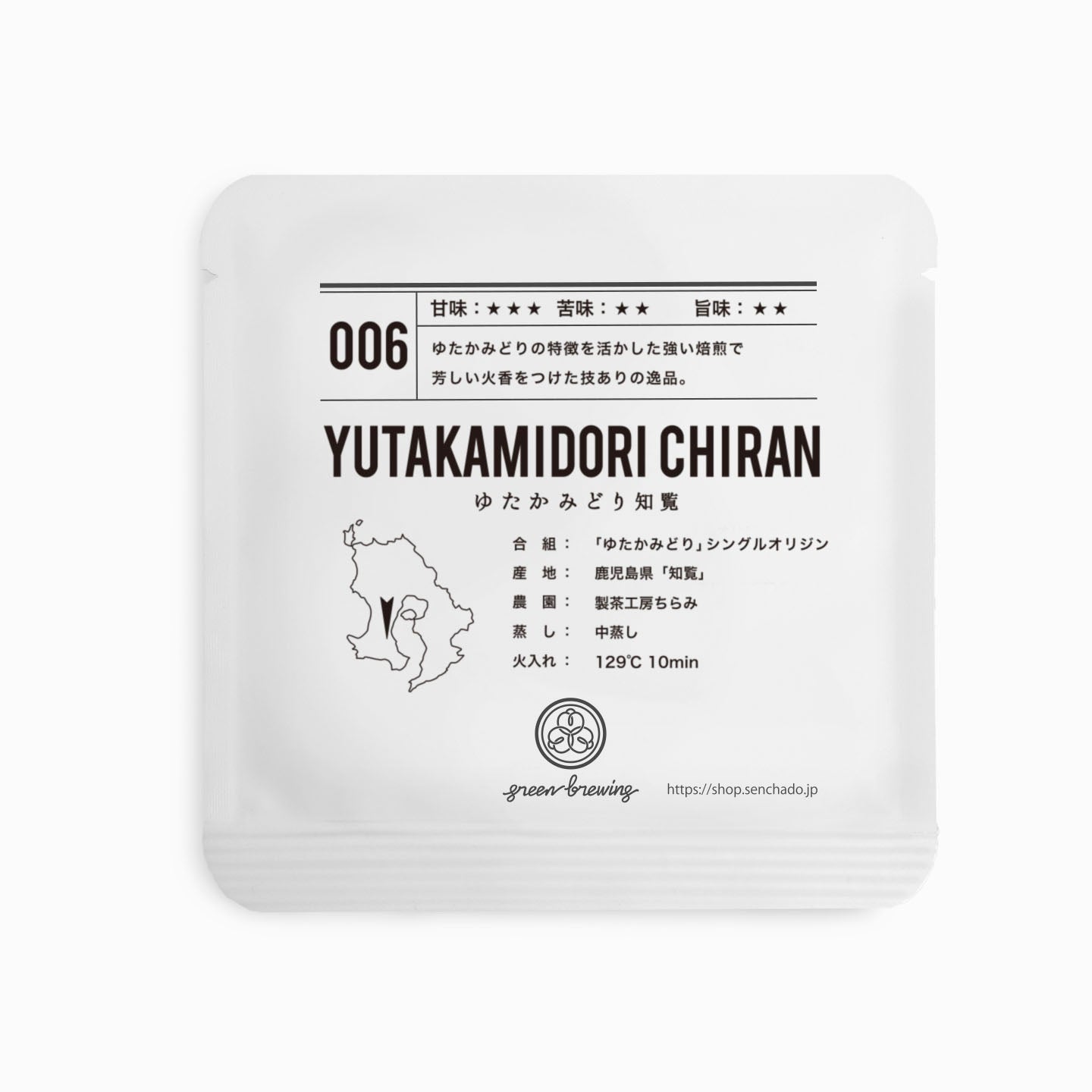 香ばしい香りに元気いっぱいの旨味としっかりとした甘味。太い味わいでわかりやすいキャラクターの『006 ゆたかみどり 知覧』。香ばしい火の香りは、ほうじ茶やコーヒーがお好きな方にもおすすめです。ひと口目のインパクトが強いので、他のものは口にいれず、まずはお茶の香りと味わいをお楽しみください。