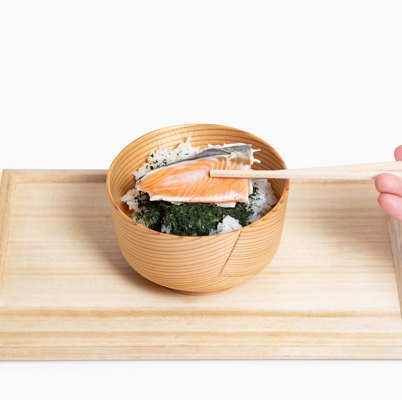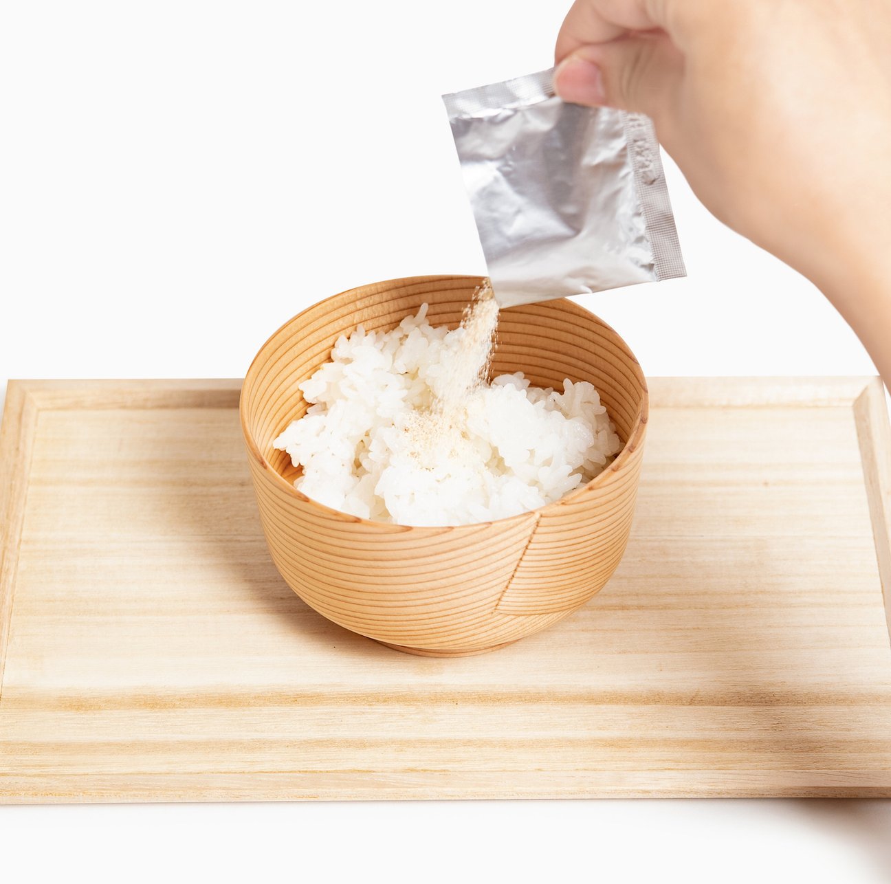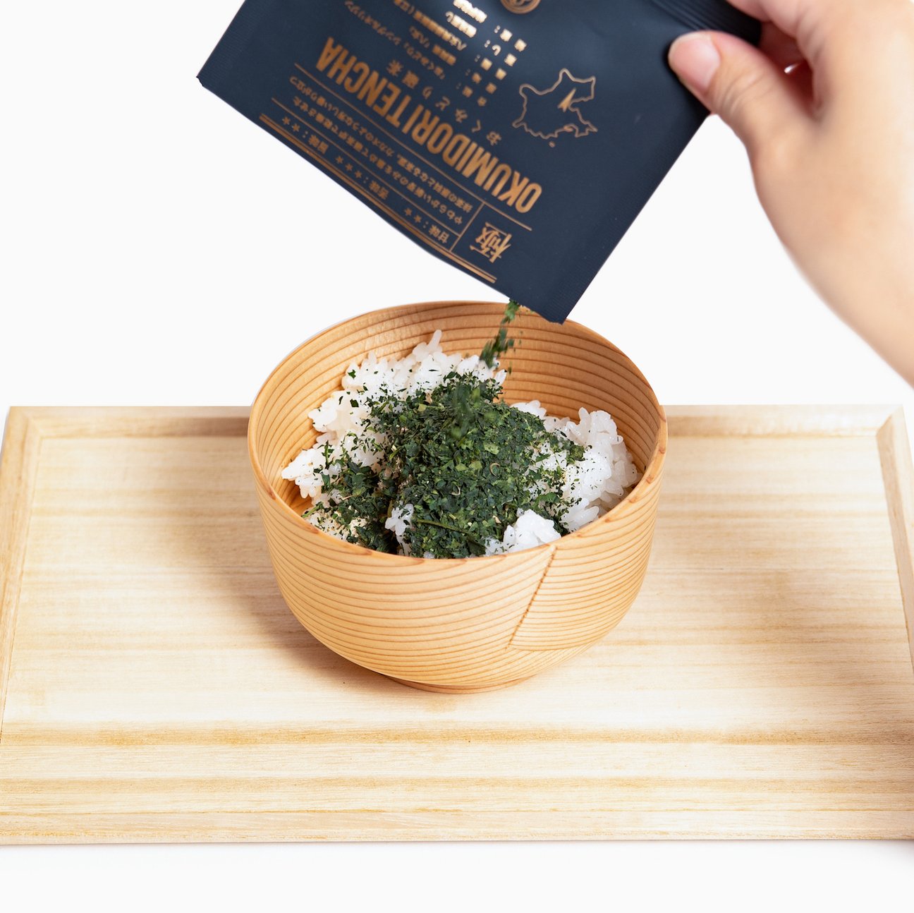 ご飯に碾茶とお出汁をふりかけ、具材とにこまる玄米をのせてお湯を注いでください。碾茶を噛むとお茶の渋みが感じられます。