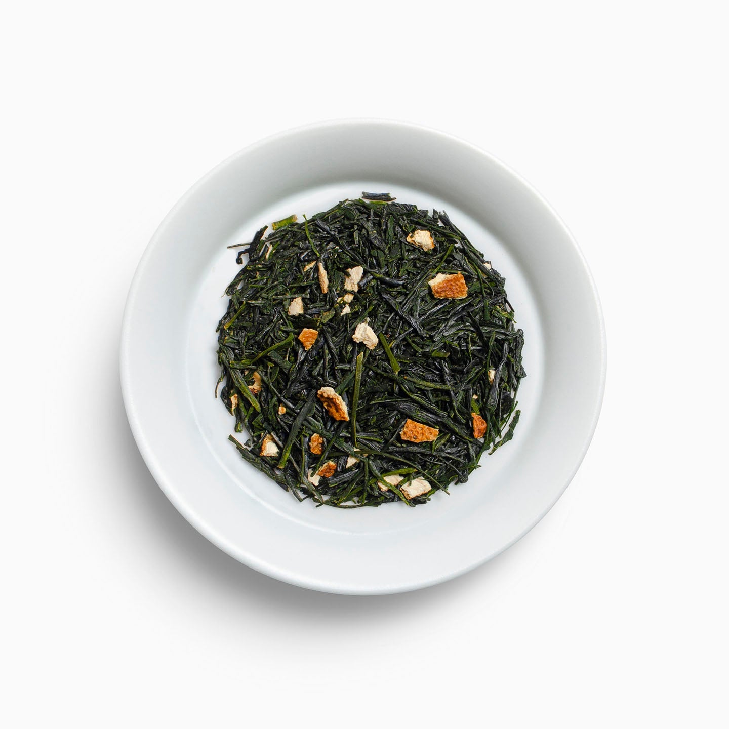 シャープな苦味と渋みの「さきみどり 彼杵」にベルガモットと蜜柑ピールを加えた、煎茶ベースの「Earl Grey Tea 」。