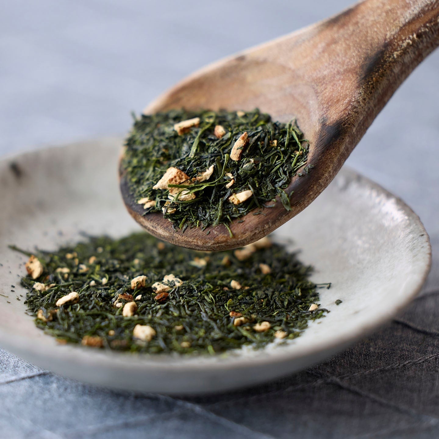 「ベルガモット」の香りと「蜜柑ピール」が爽やかな香りの「さきみどり」と美しく調和する煎茶ベースのブレンドティー。紅茶のようなイメージで洋菓子やケーキに合わせられる新感覚の煎茶です。
