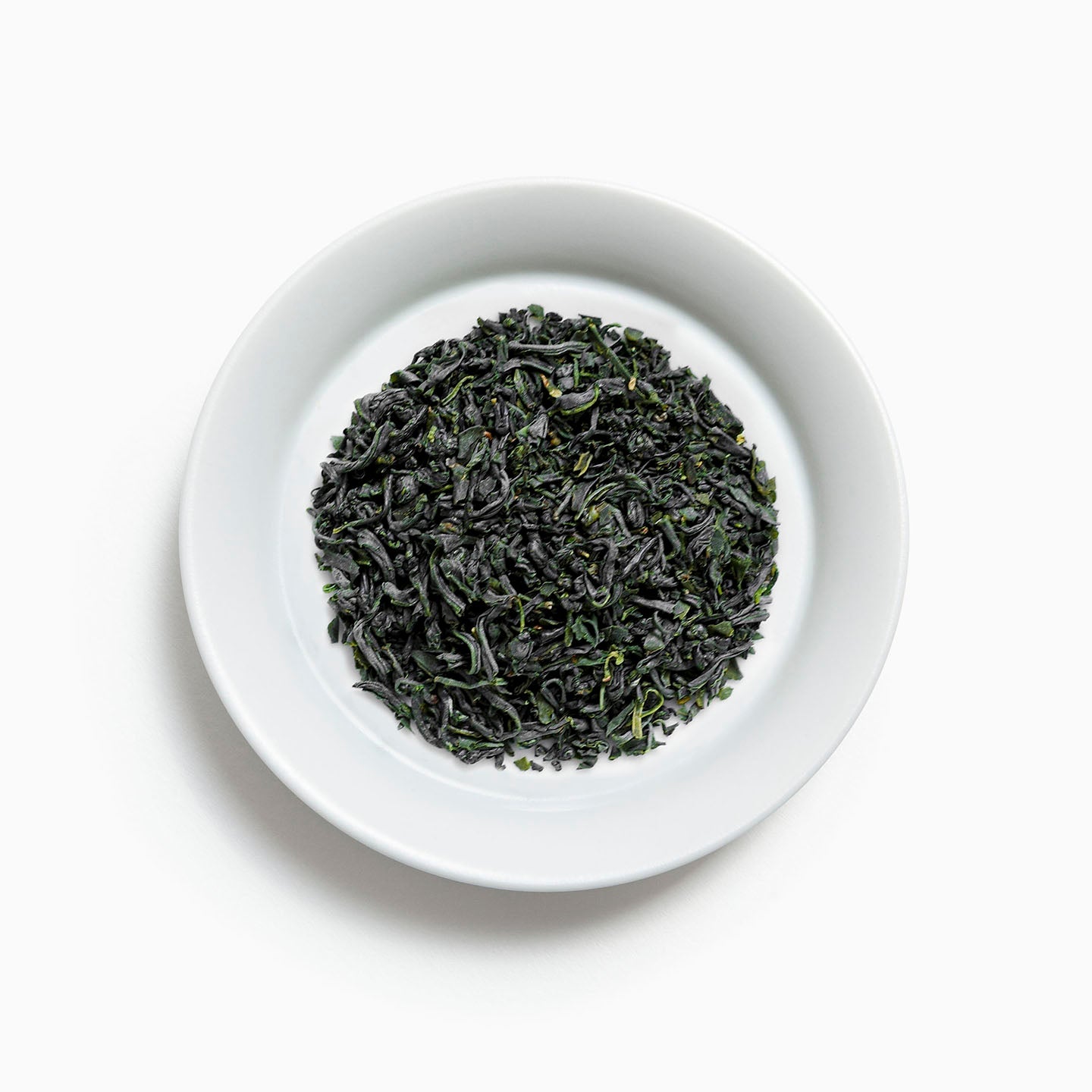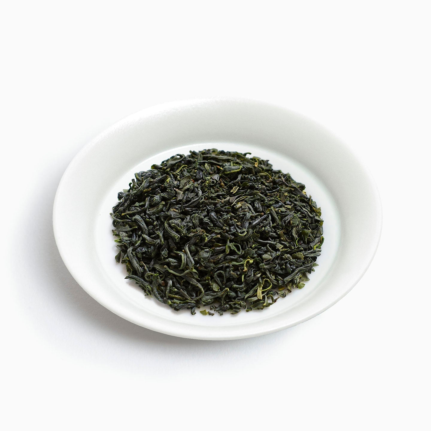 くるくると曲がった釜炒りの茶葉。マットな質感で蒸し製煎茶とは異なった魅力があります。