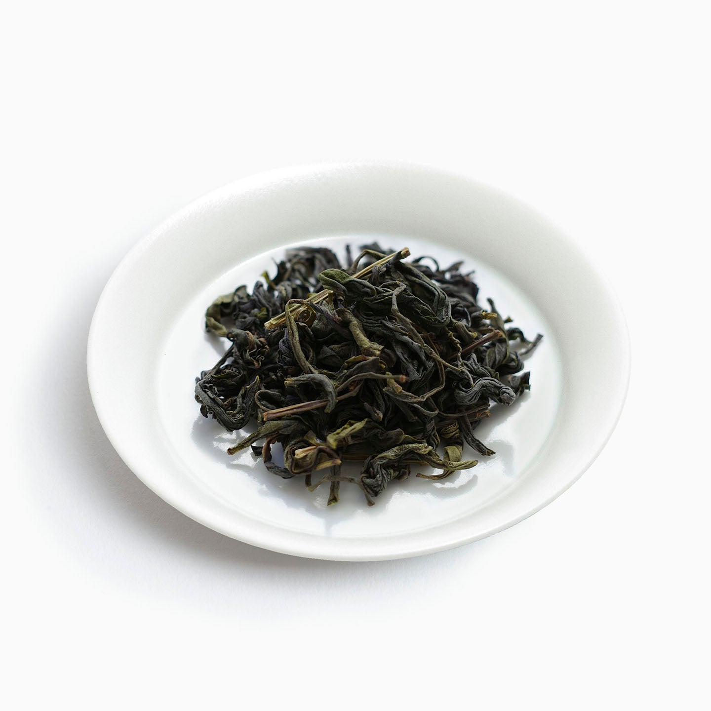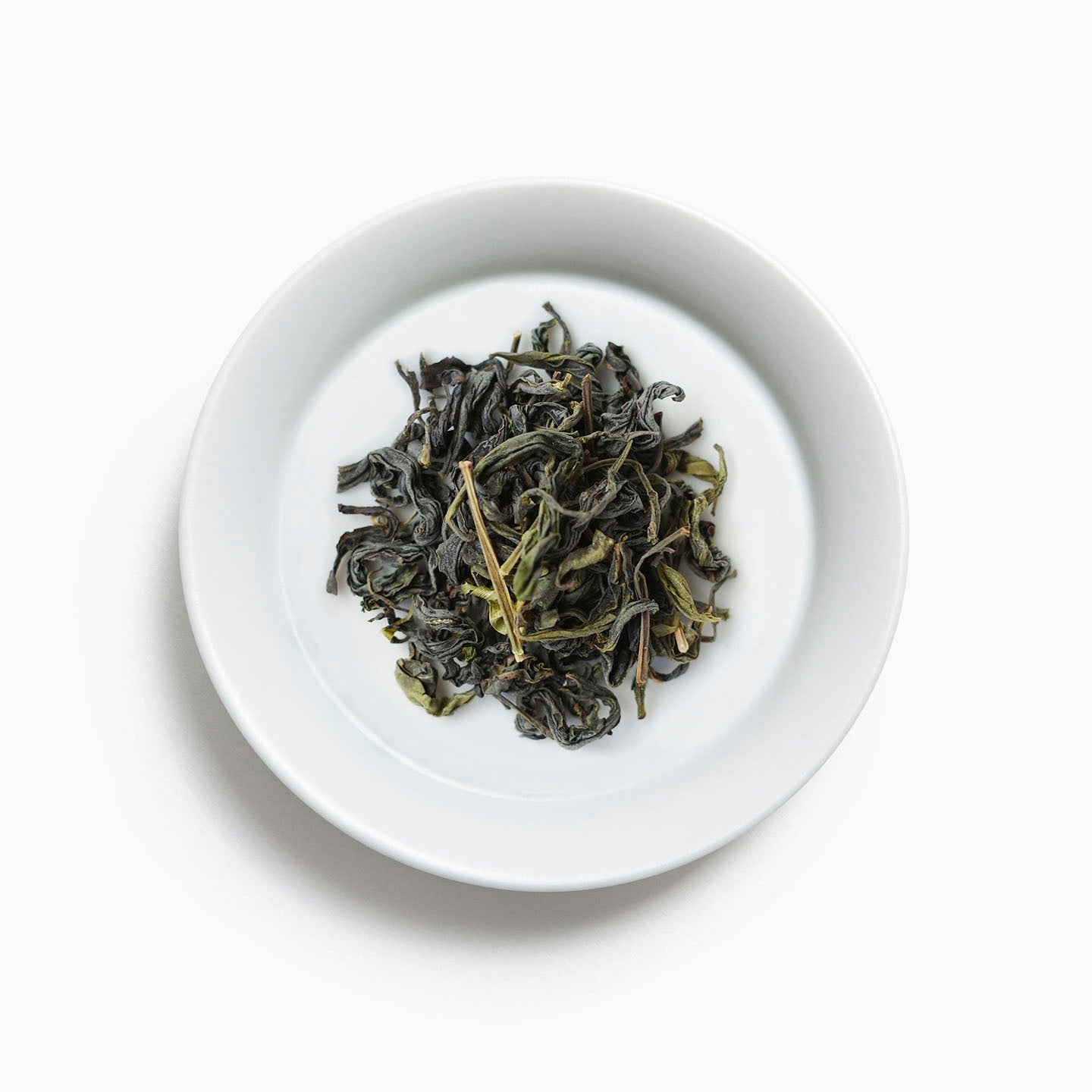 萎凋という工程を経て発酵をさせるのですが、静岡『本山』の丸高農園は天日または室内での萎凋を行います。日光にさらすことで、お茶の温度があがり茶葉内部の酵素が働き香気成分が生成されるのですが、その影響で葉の緑色が濃く褐色に変化します。その様子を手元で感じることができるような、大ぶりな立派な半発酵の茶葉を見て楽しめます。
