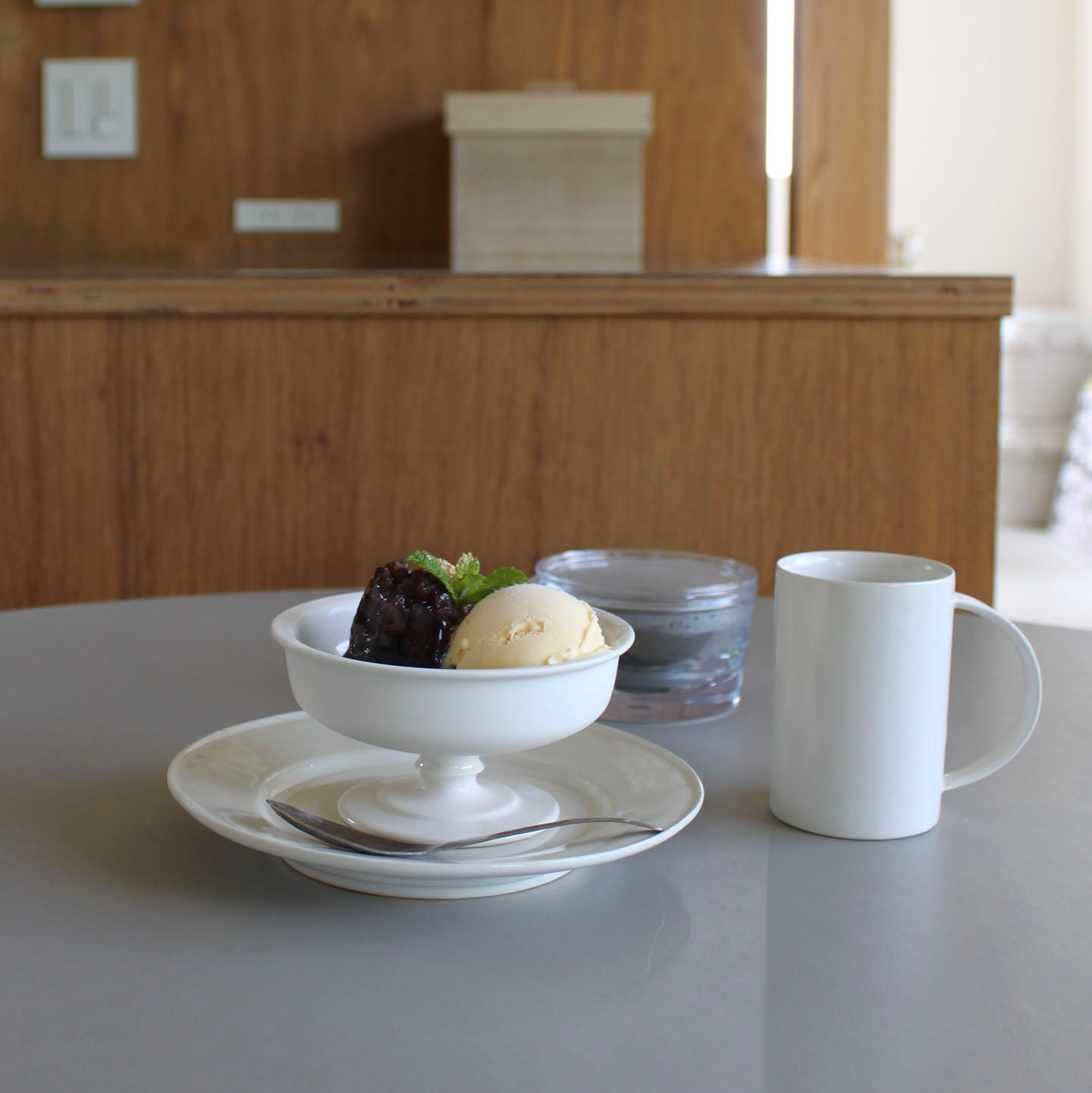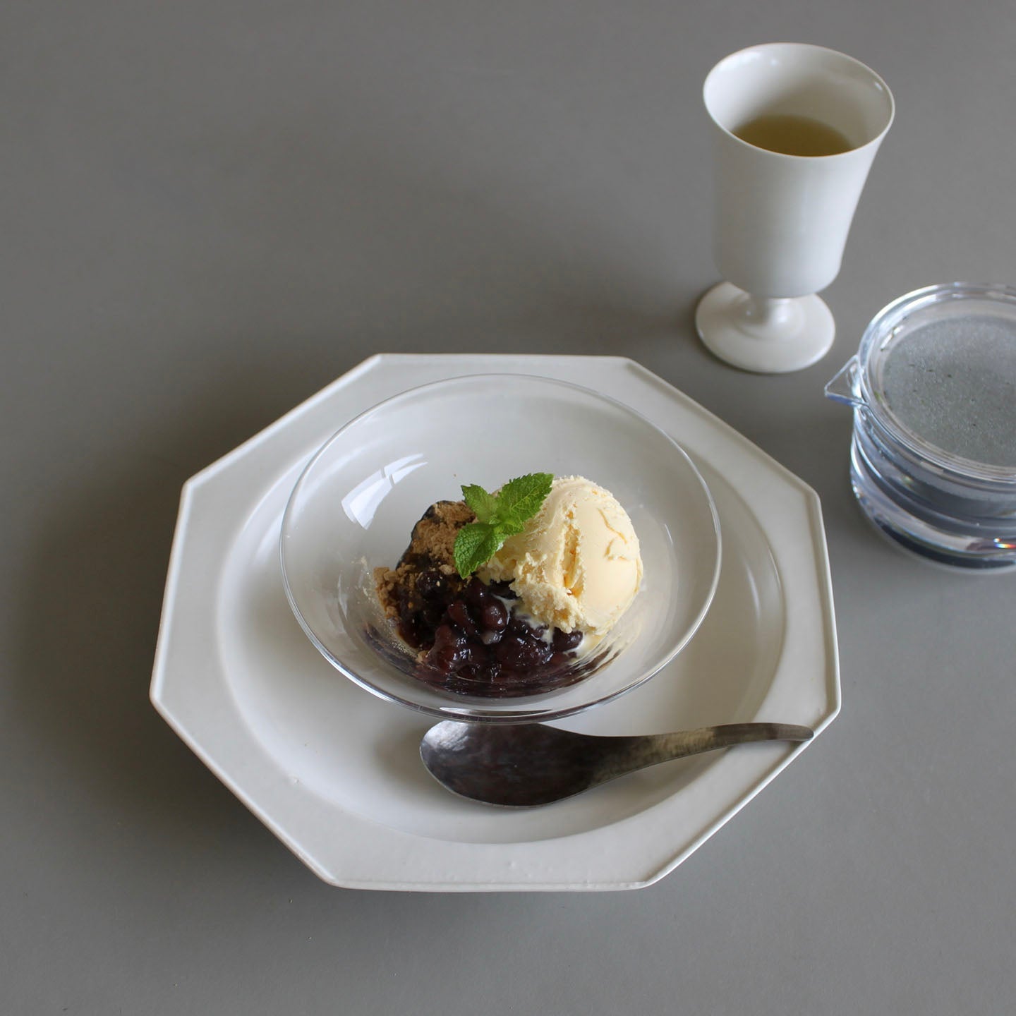 カップから器にわざわざ盛り付けて食べる。そのひと手間が、さらに美味しくいただけるポイントです。「寒天ぜんざい」にバニラアイスをトッピングしたら、立派なグラスデザートの出来上がり。