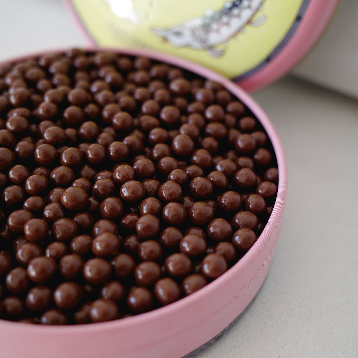 缶を開けると、つやつやの丸いミルクチョコレートがぎっしり入っています。